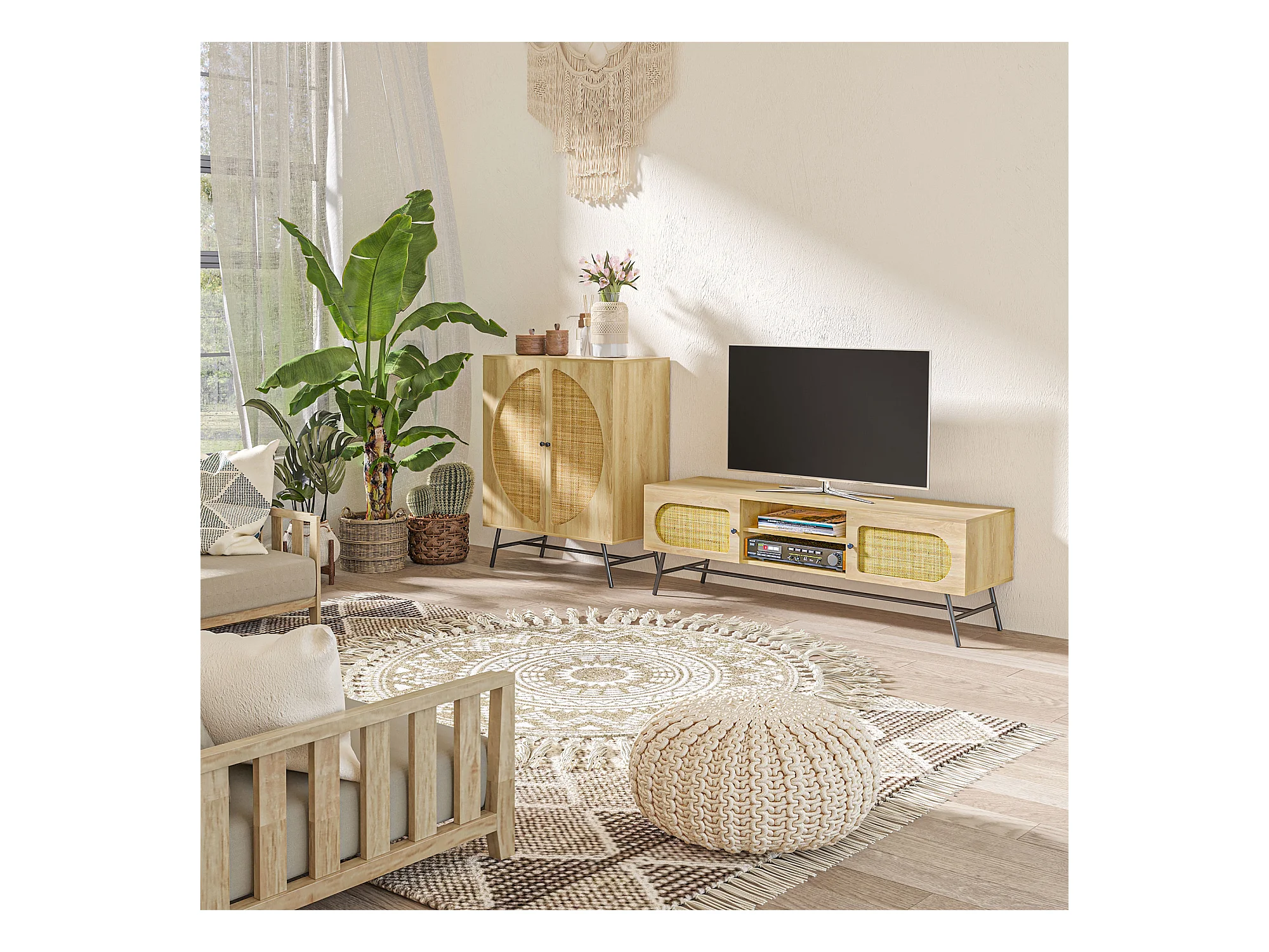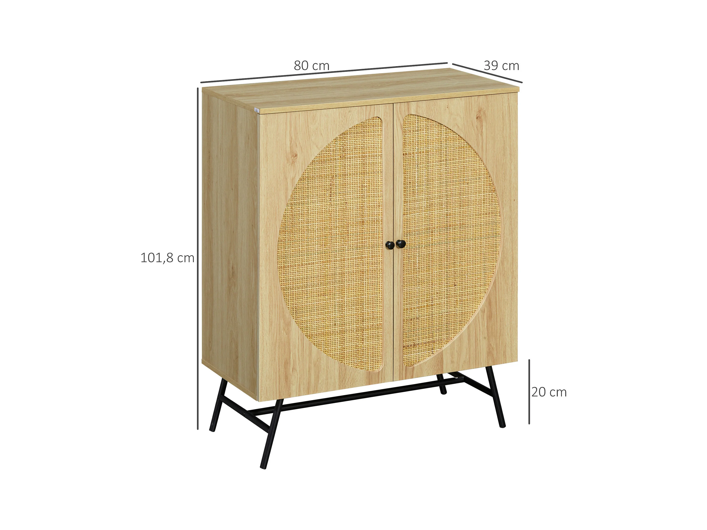 Buffet 2 portes cannage rotin avec étagère piètement métal noir aspect chêne clair