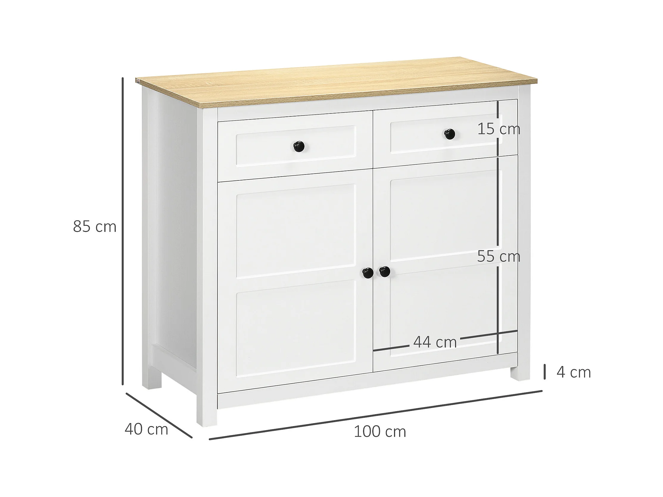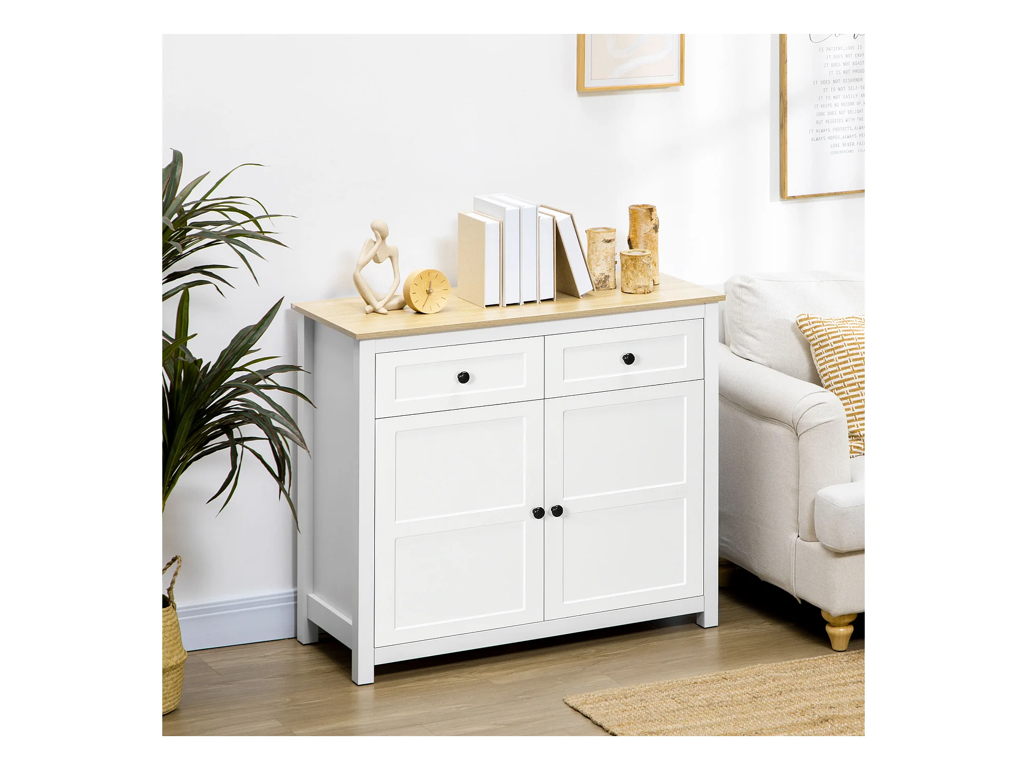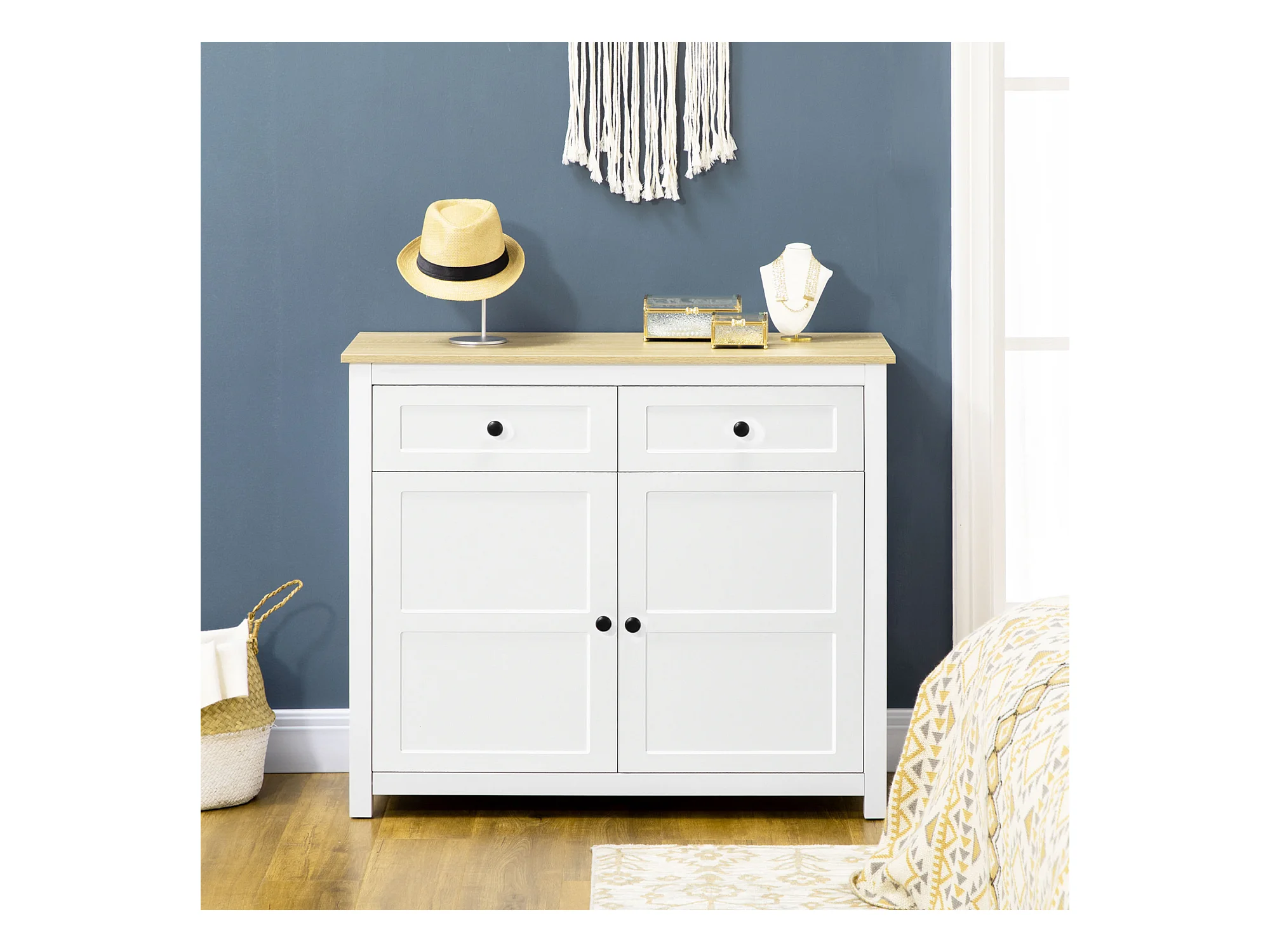 Buffet style classique chic multi-rangement 2 portes 2 étagères réglables 2 tiroirs coulissants placard 2 portes MDF blanc plateau aspect bois clair