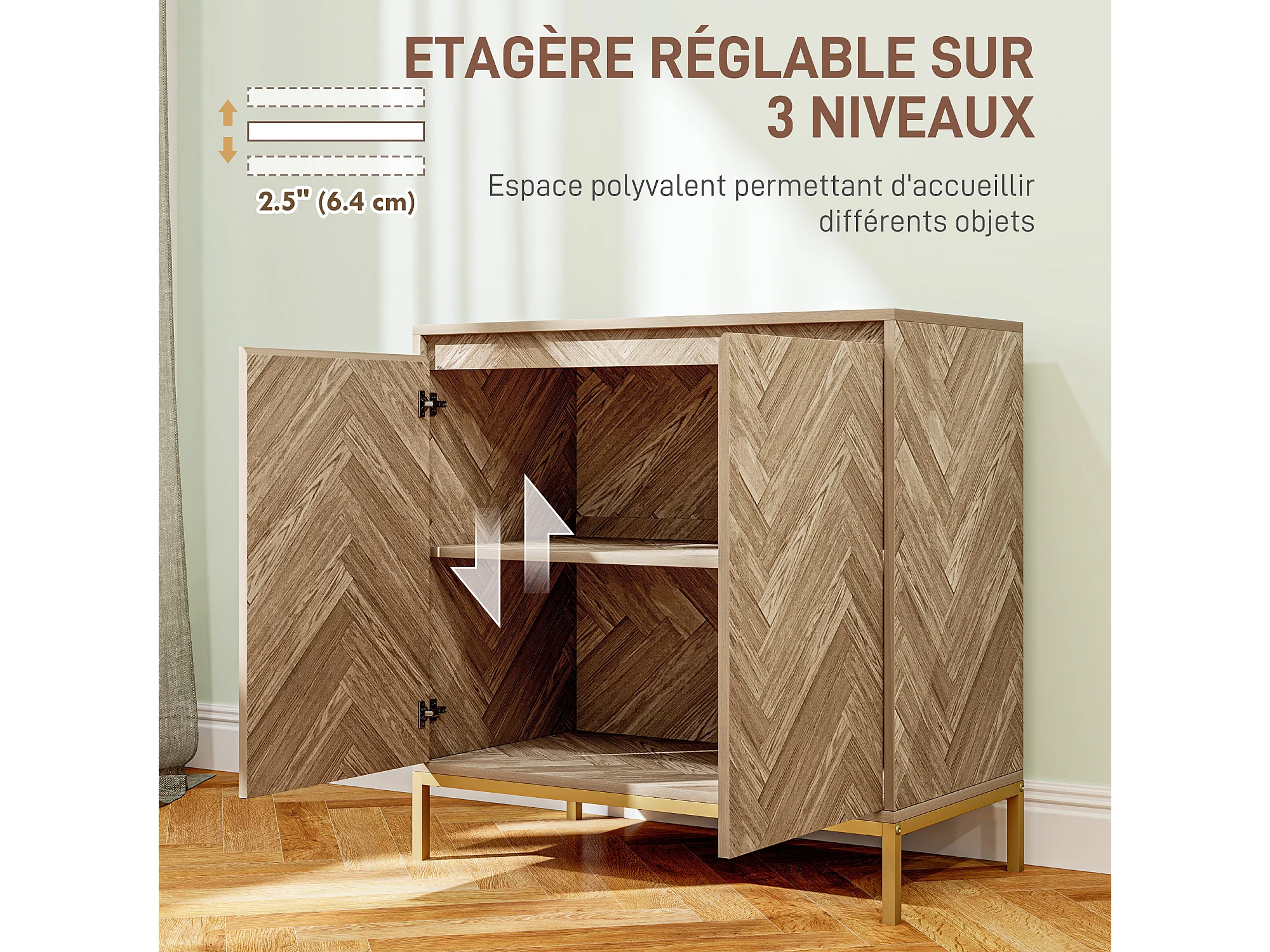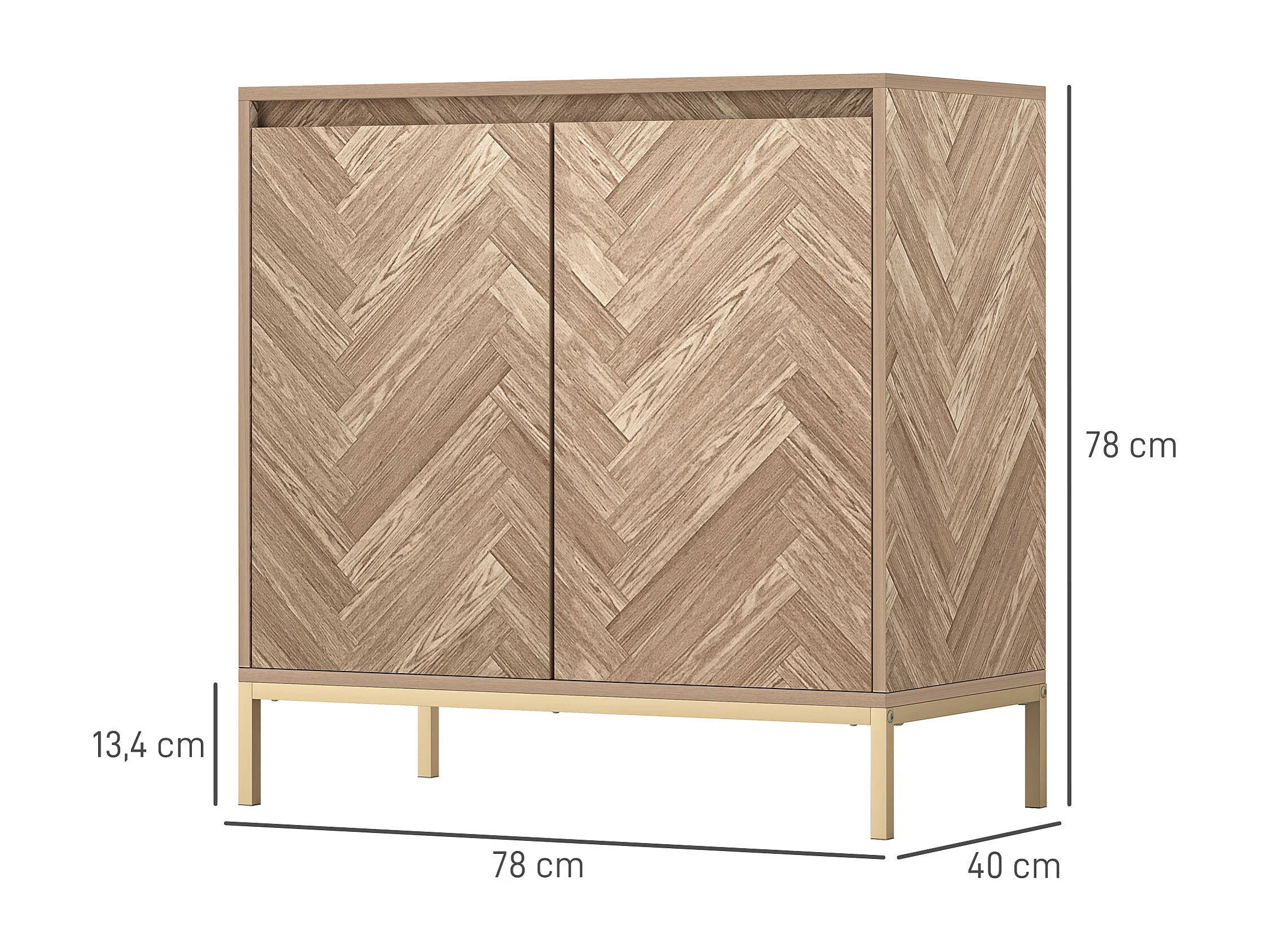 Buffet 2 portes étagère style nordique - piètement acier doré effet bois motif chevrons