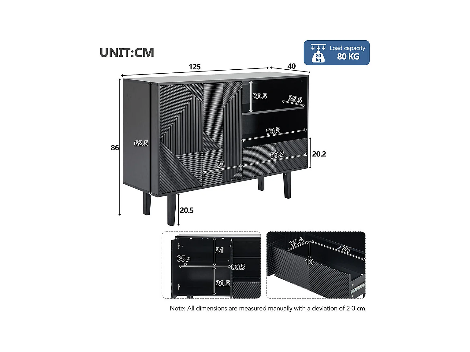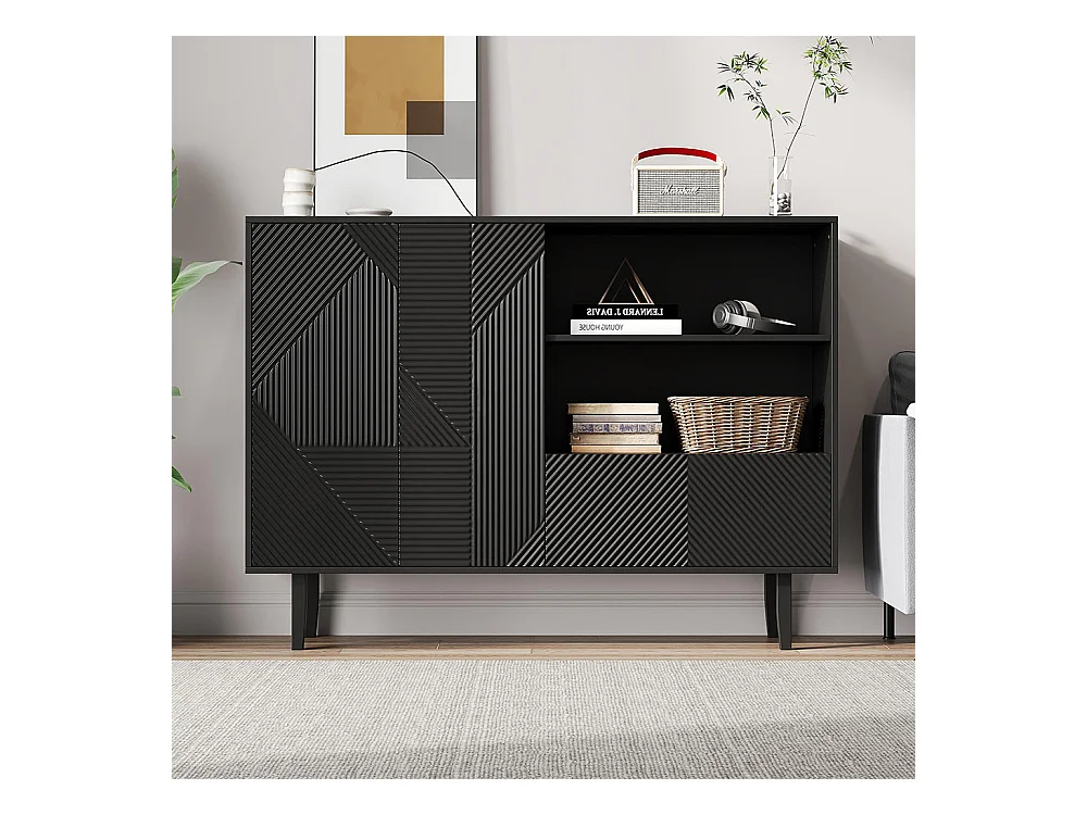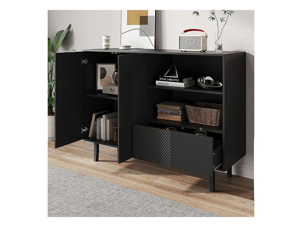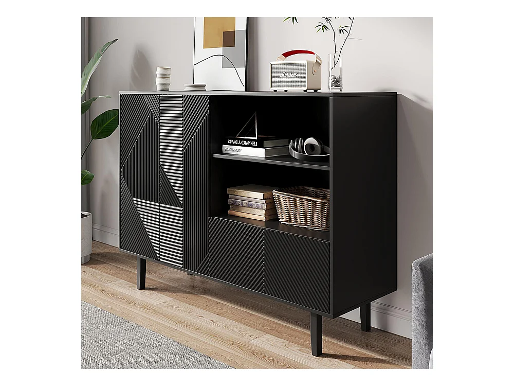 Buffet portes ondulées rainurées pieds métalliques réglables stable adapté salle à manger cuisine salon noir