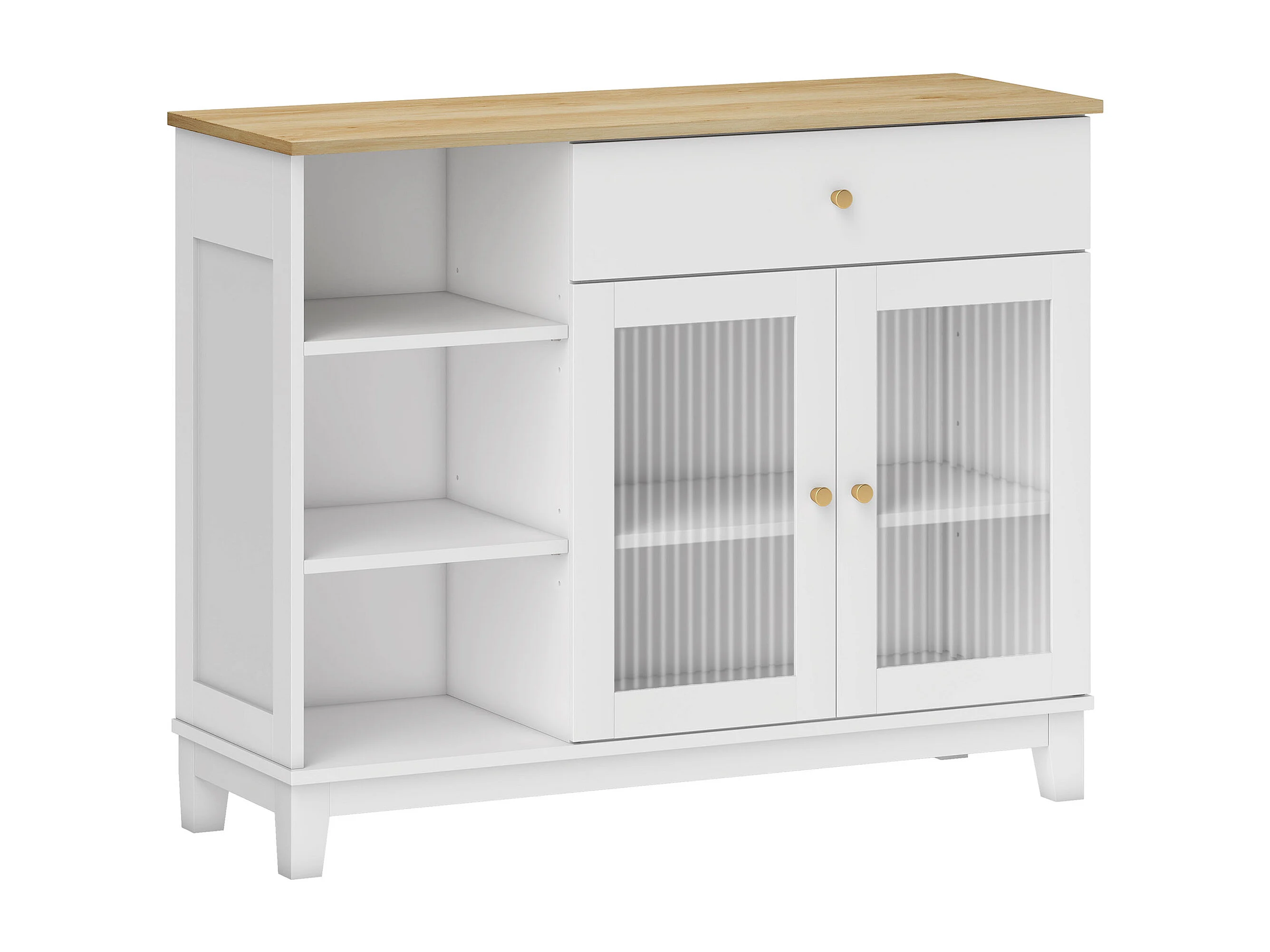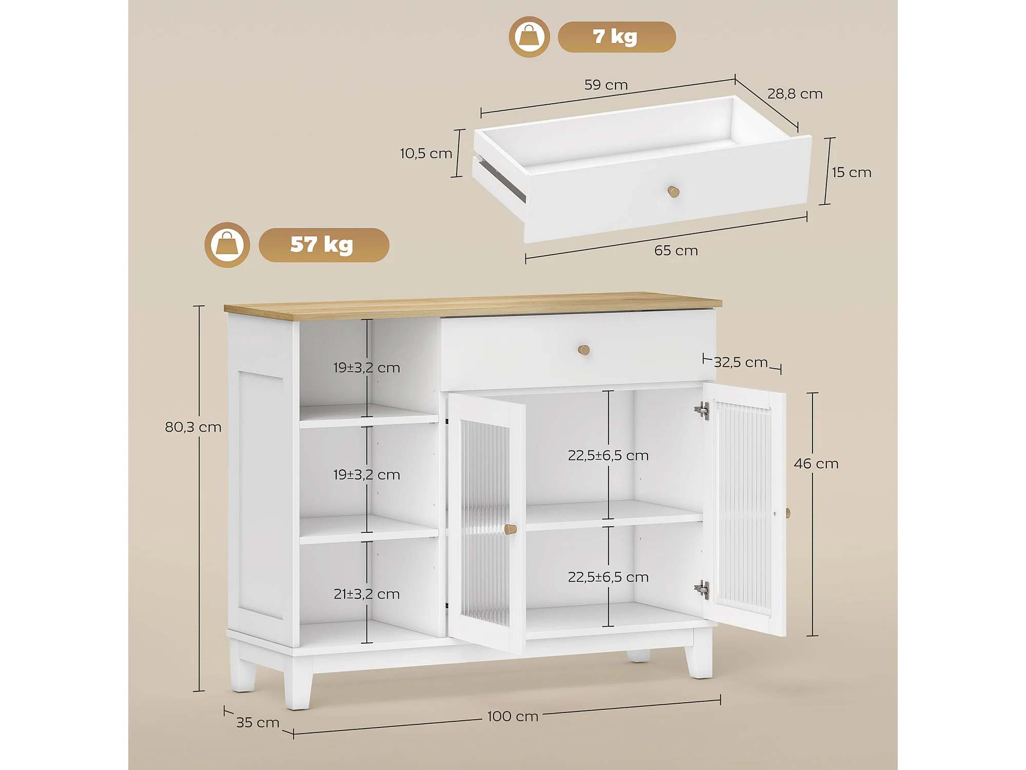 Buffet 2 portes verre effet cannelé étagère tiroir 3 niches dim. 100 x 35 x 80,3 cm blanc effet bois clair