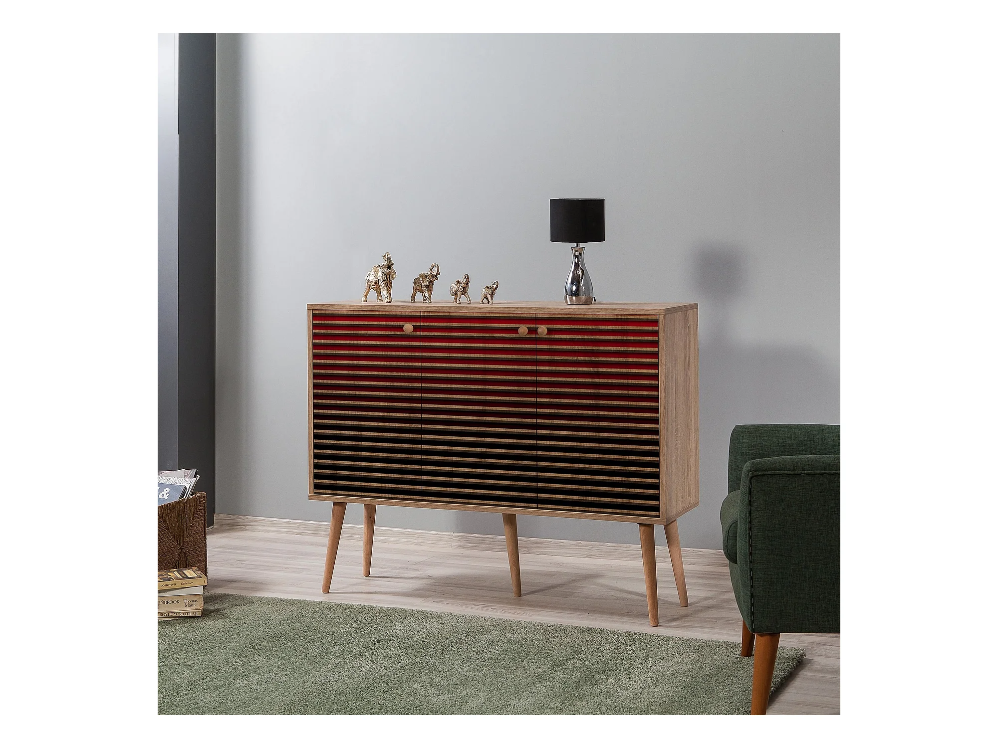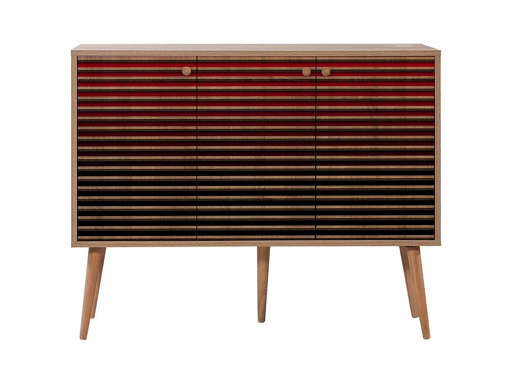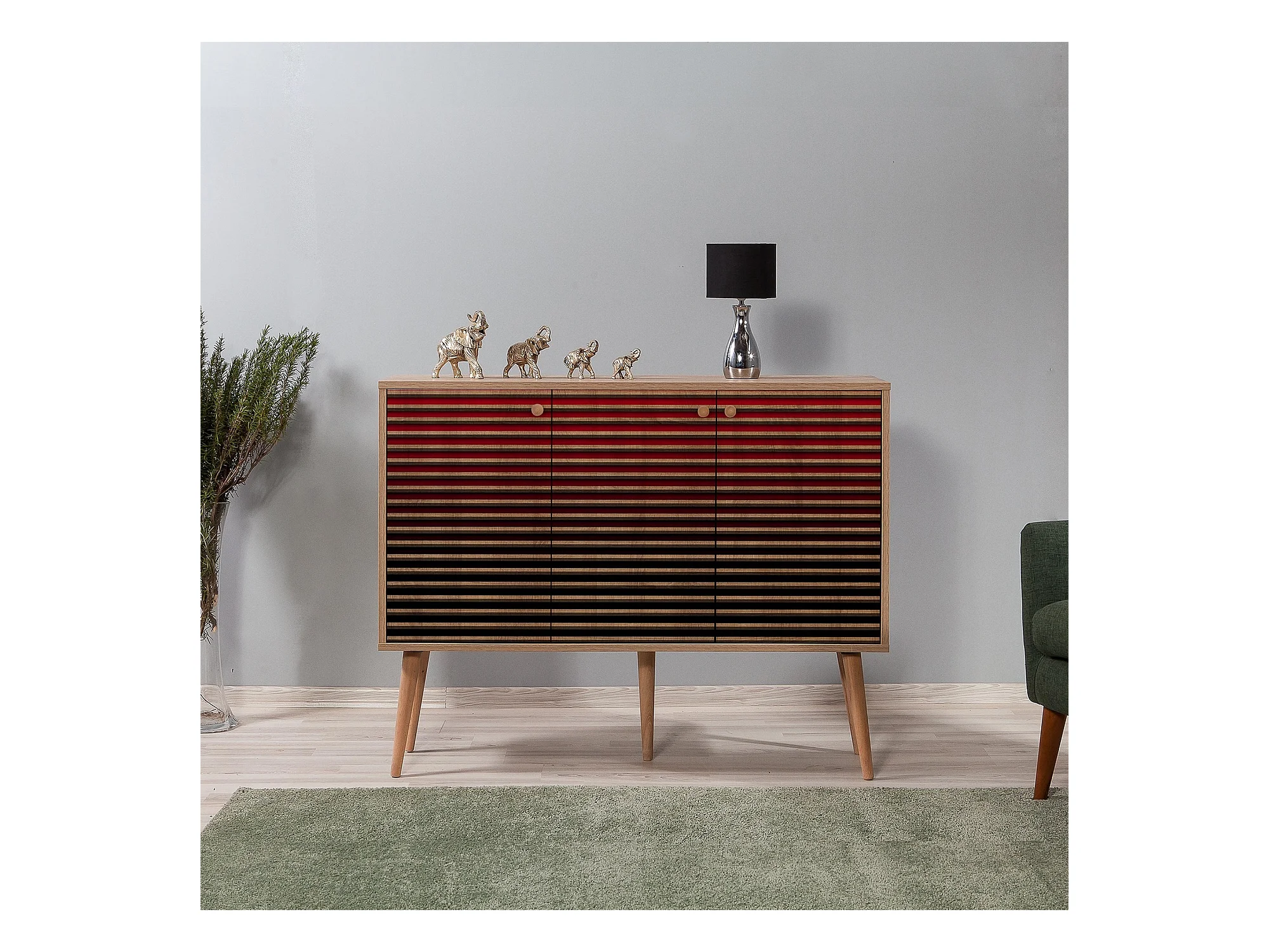 Buffet 3 portes Areva 120x90cm Motif Rayures Bois Naturel et Rouge