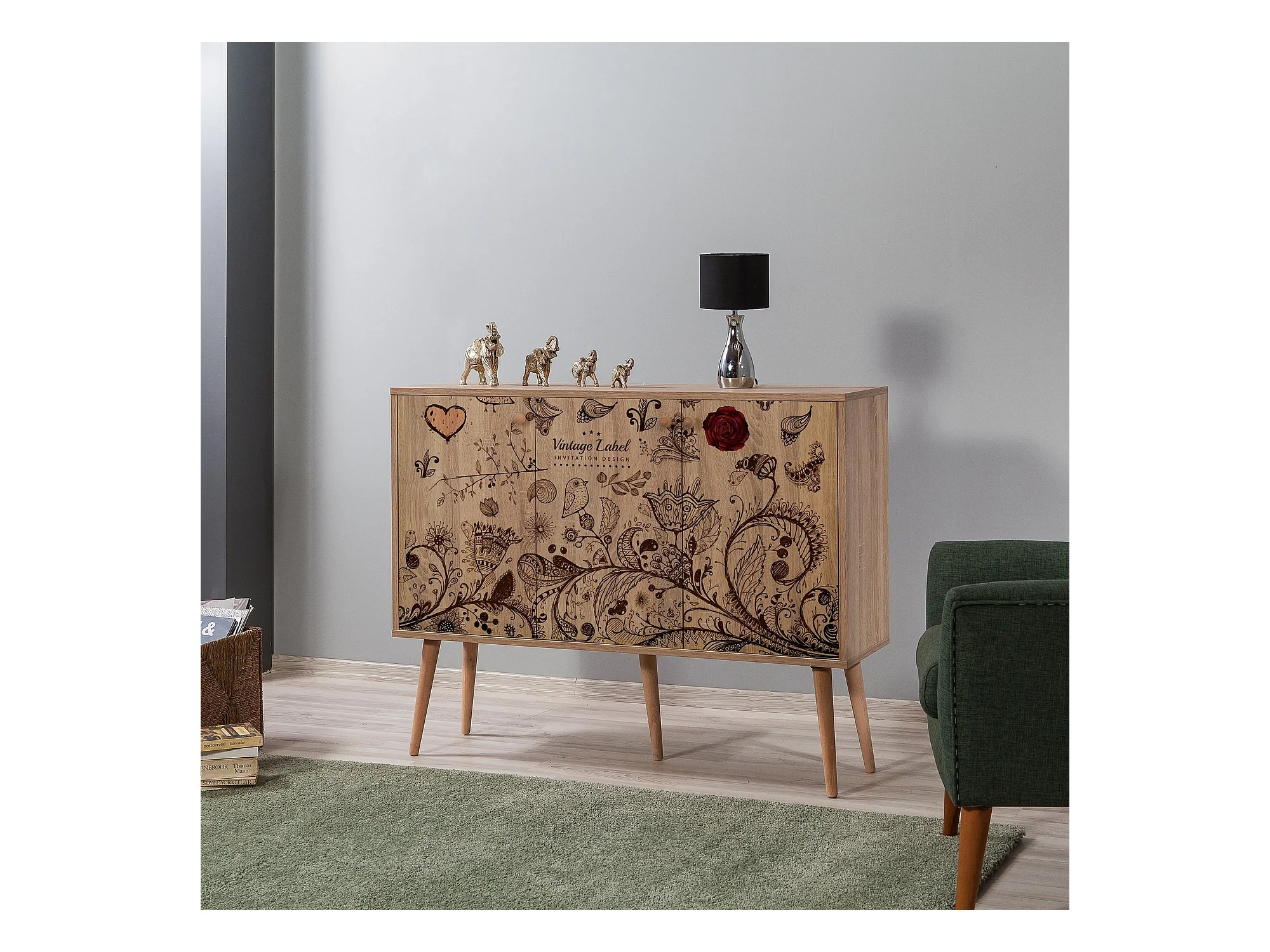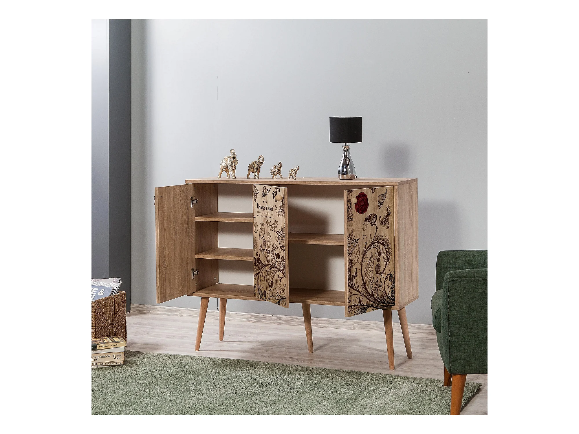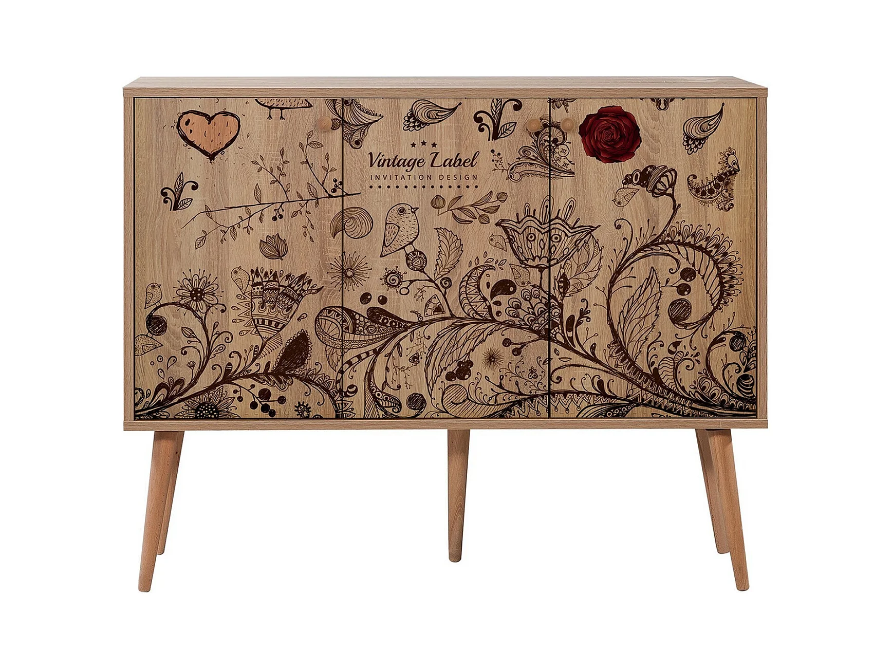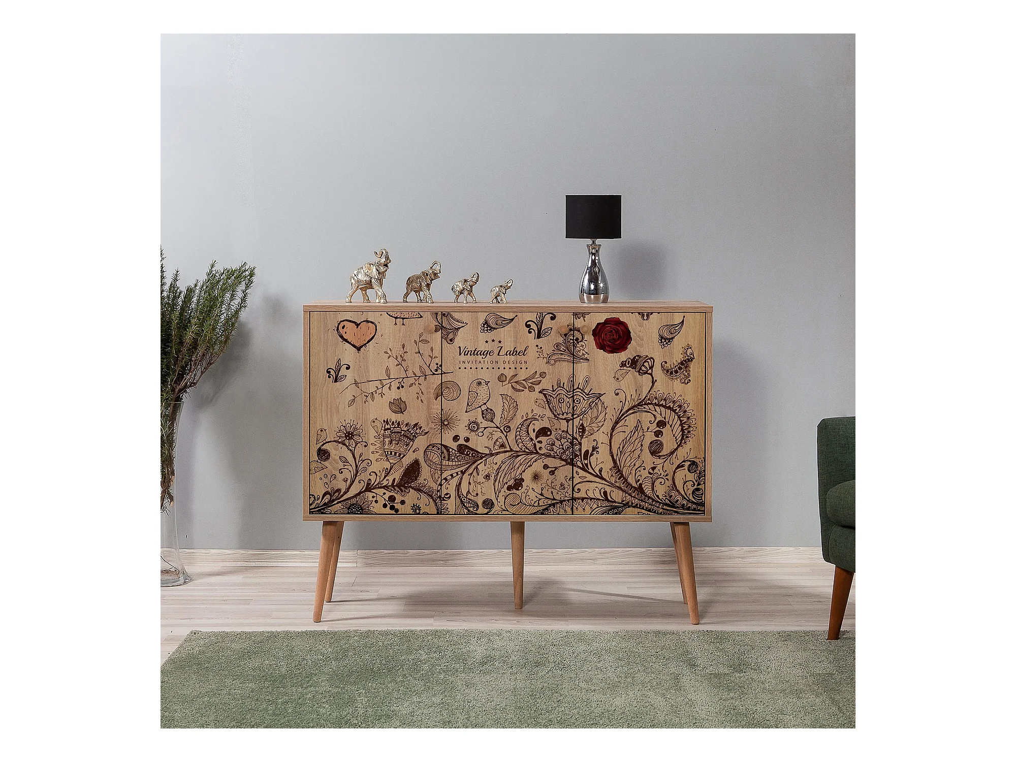 Buffet 3 portes Areva 120x90cm Motif 'Vintage label' Bois Naturel et Bleu