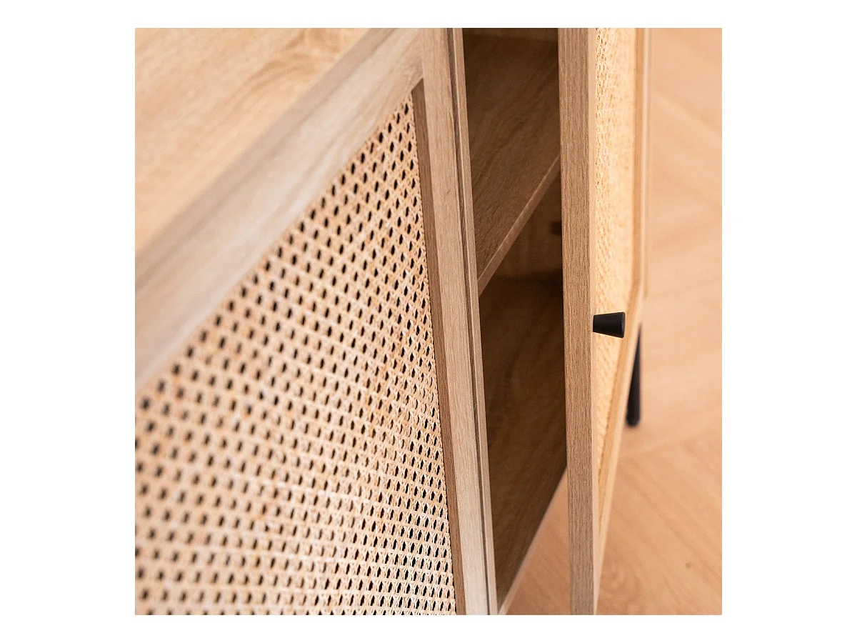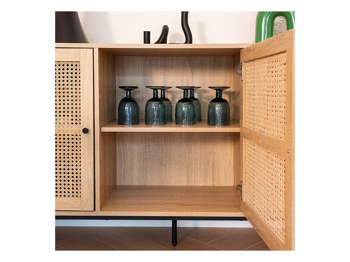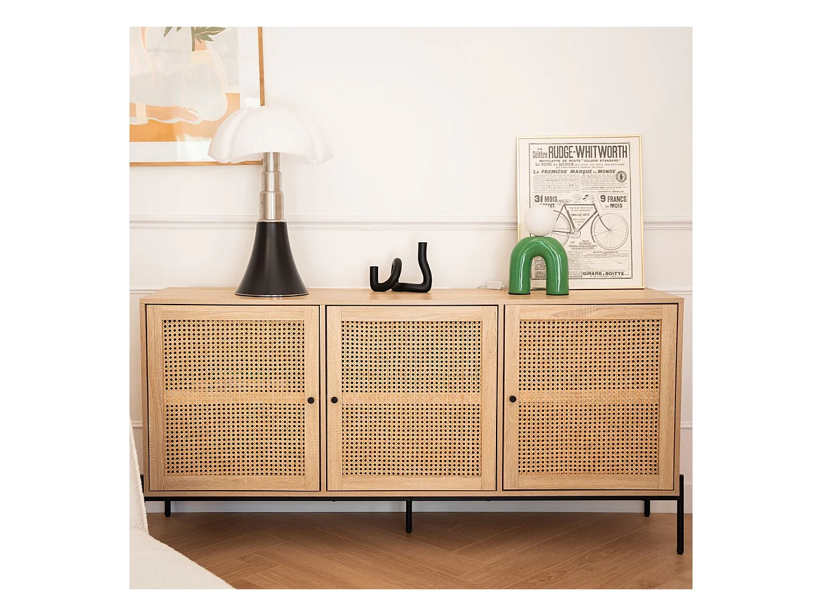 Buffet 3 portes en cannage naturel et effet chêne 160 cm - Iris