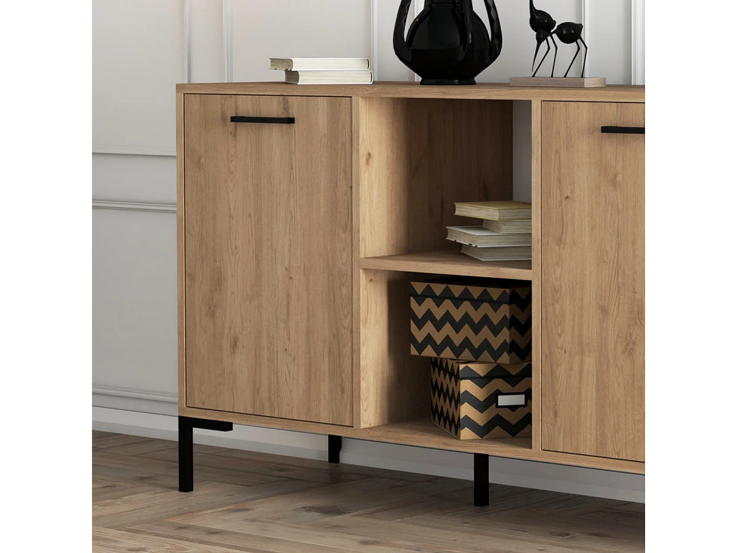 Buffet 3 portes et 2 niches finition bois et métal noir 180x80cm AURA