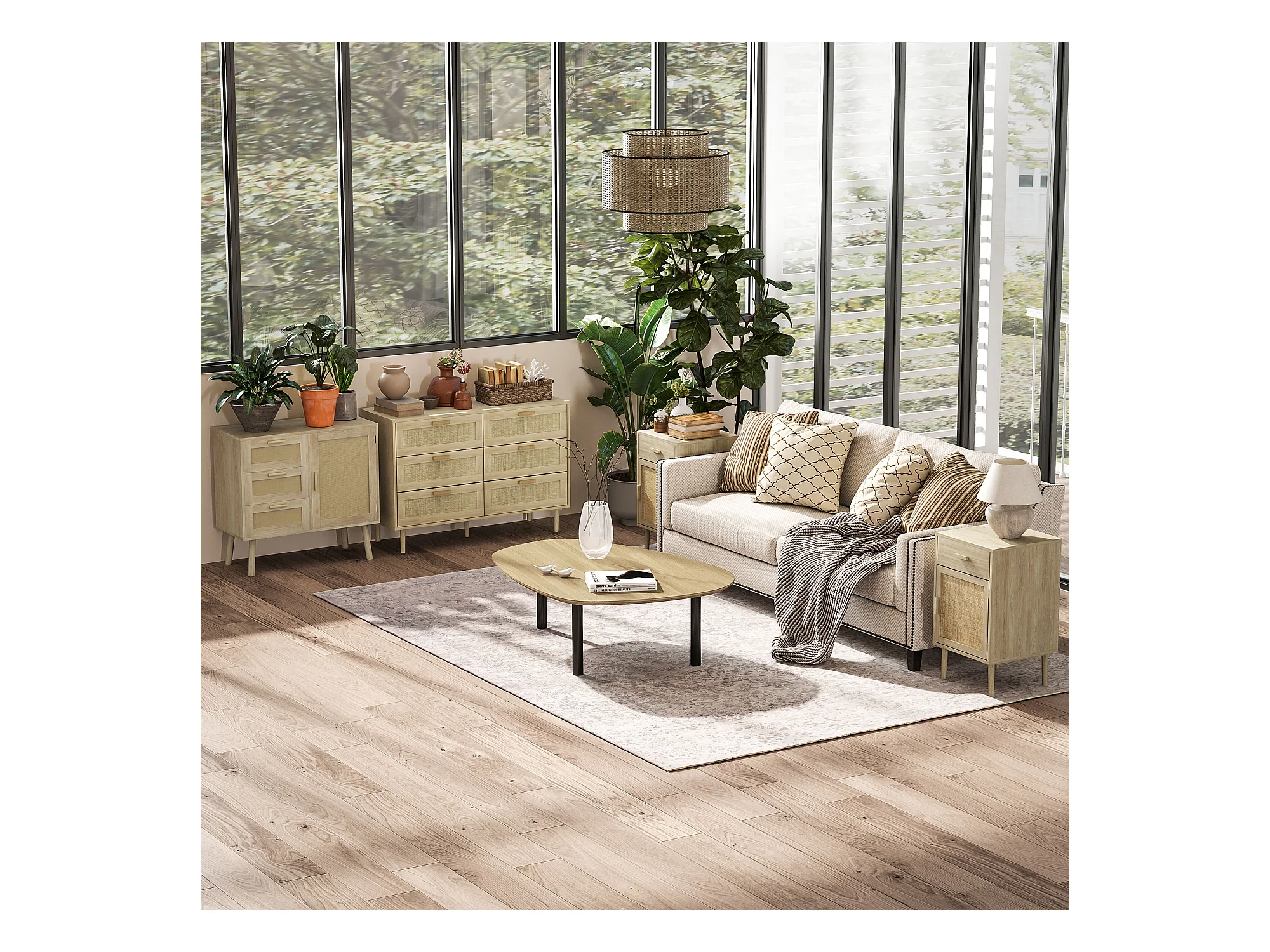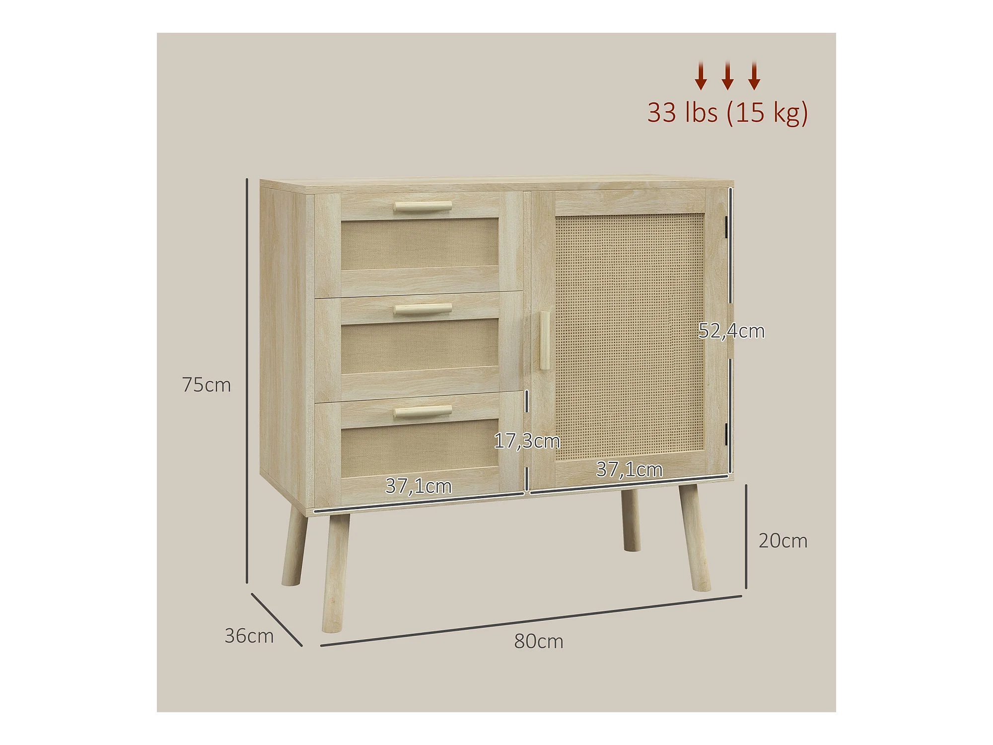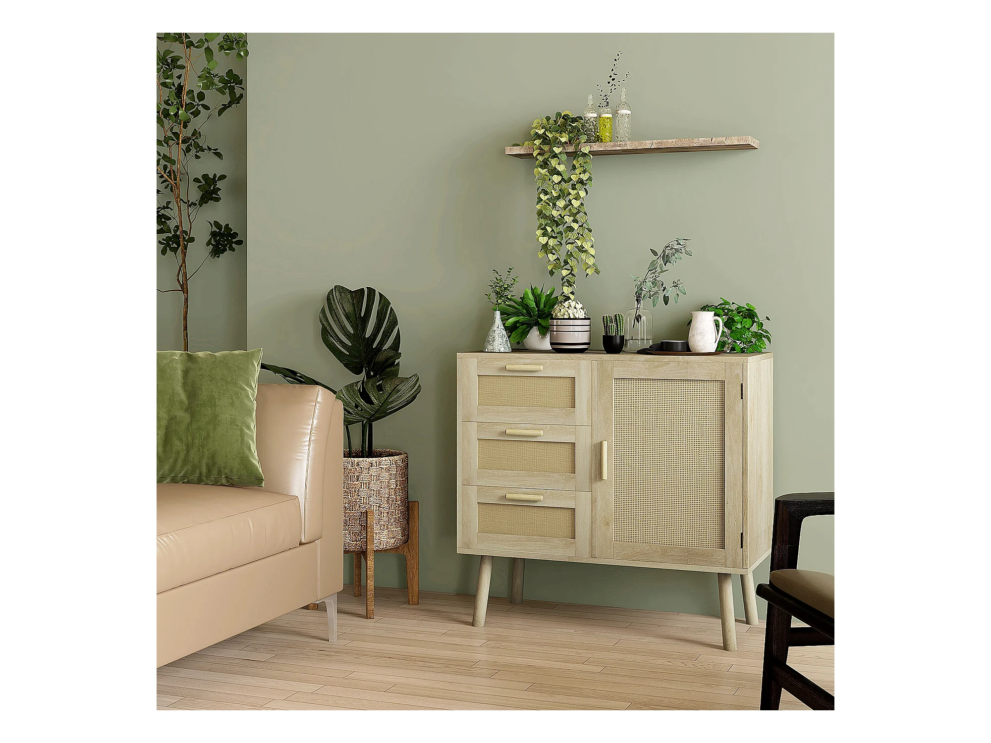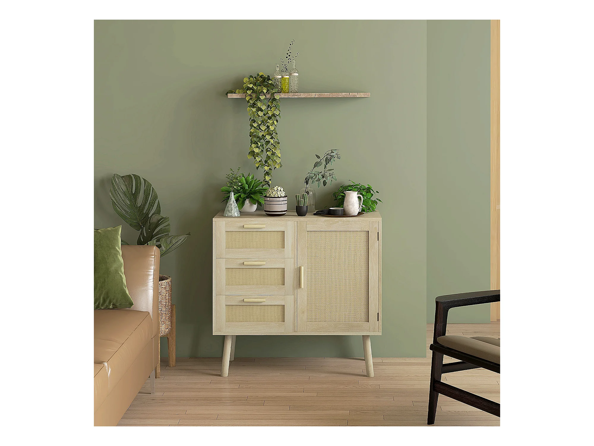 Buffet 3 tiroirs porte étagère style bohème chic cannage rotin panneaux aspect chêne clair