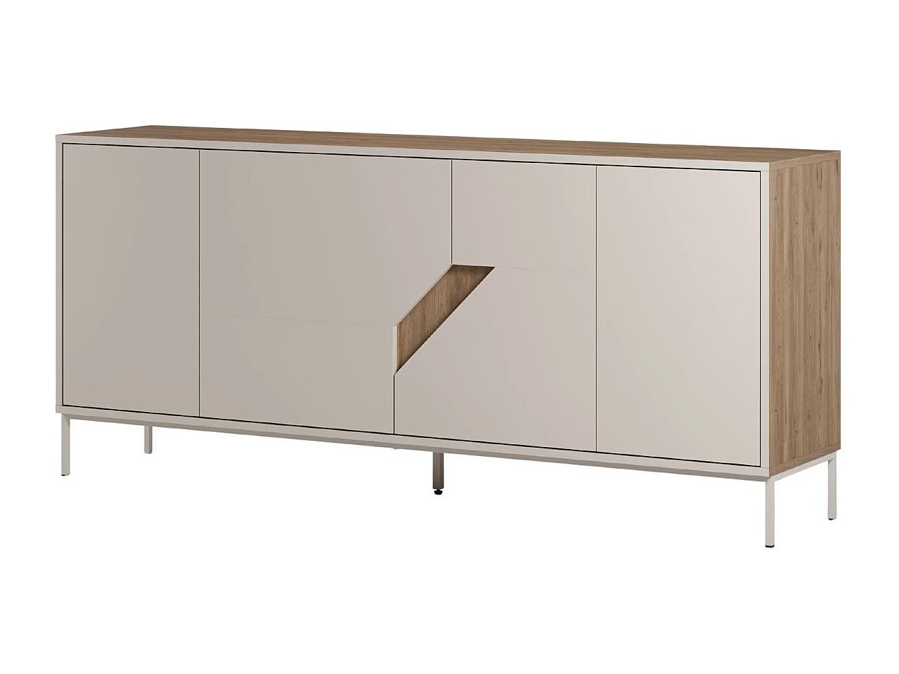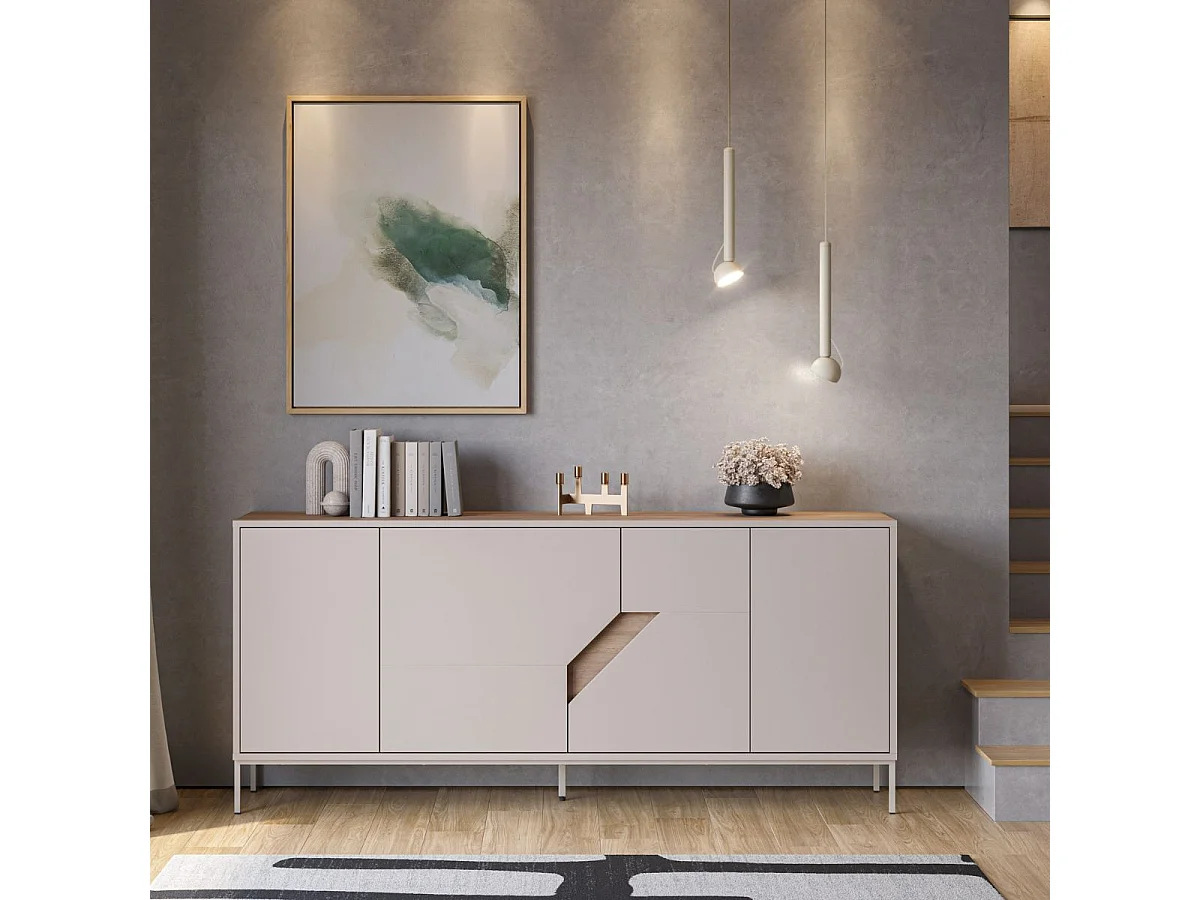 Buffet 4 portes 180cm en mélaminé beige et imitation bois avec découpe graphique oblique - ANOUK