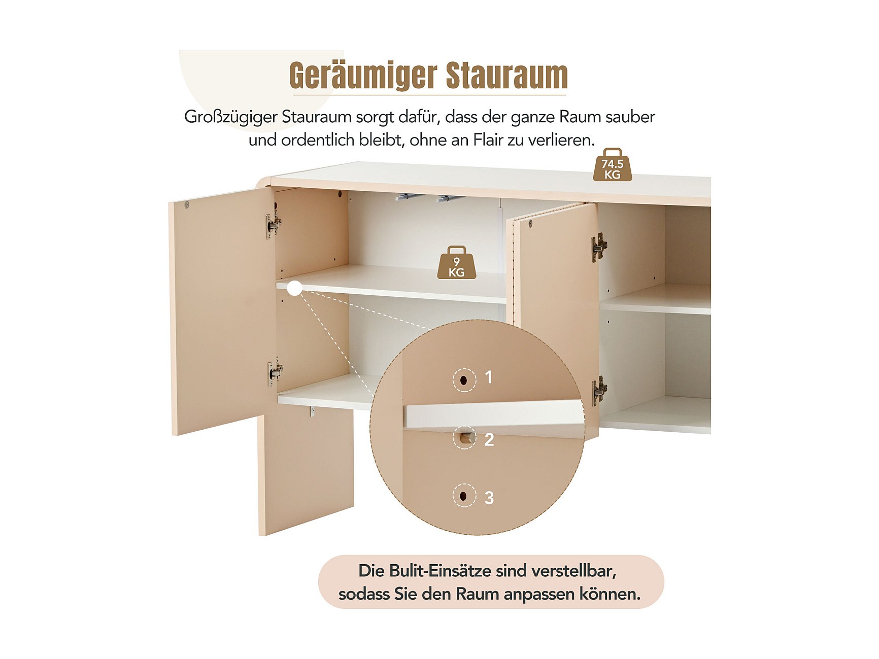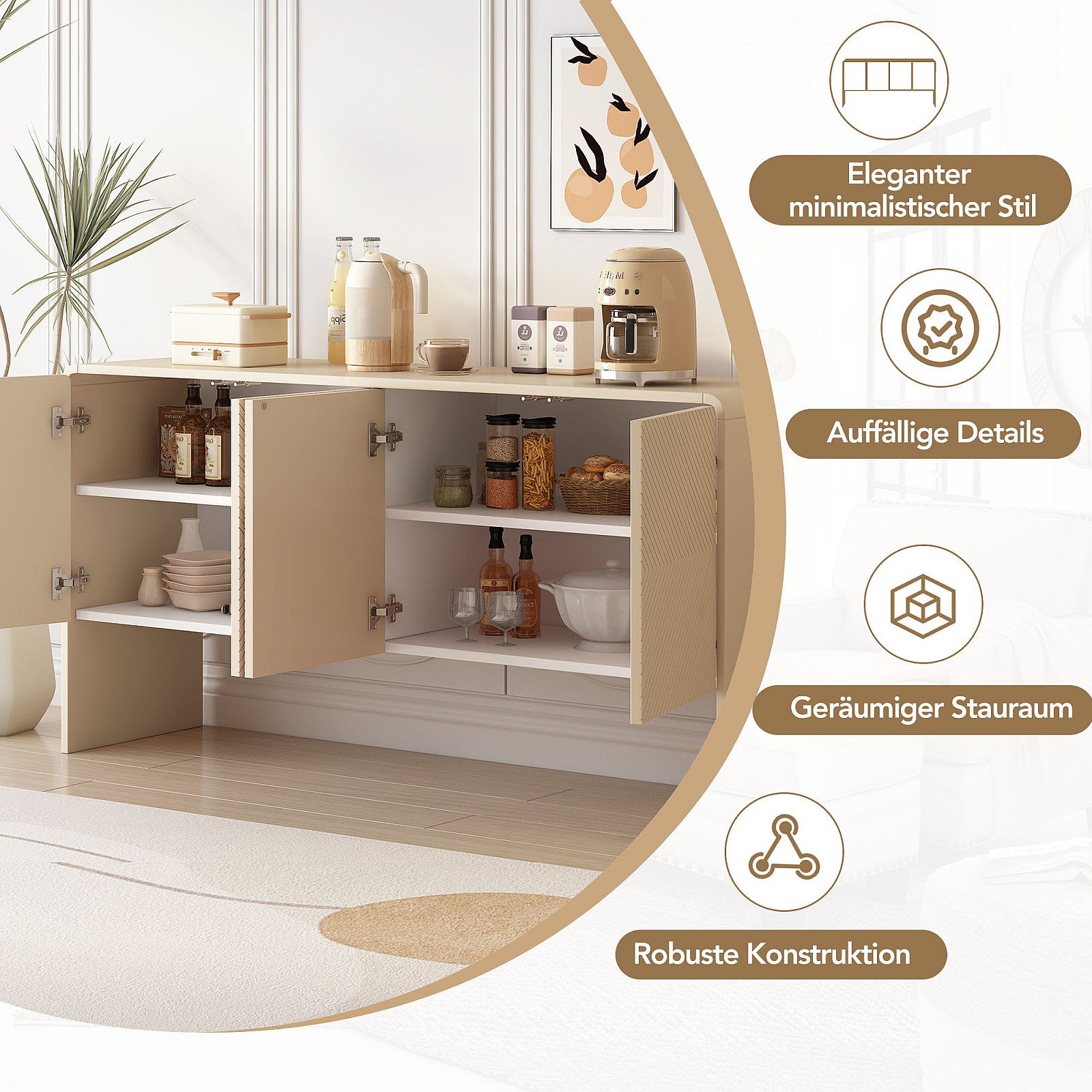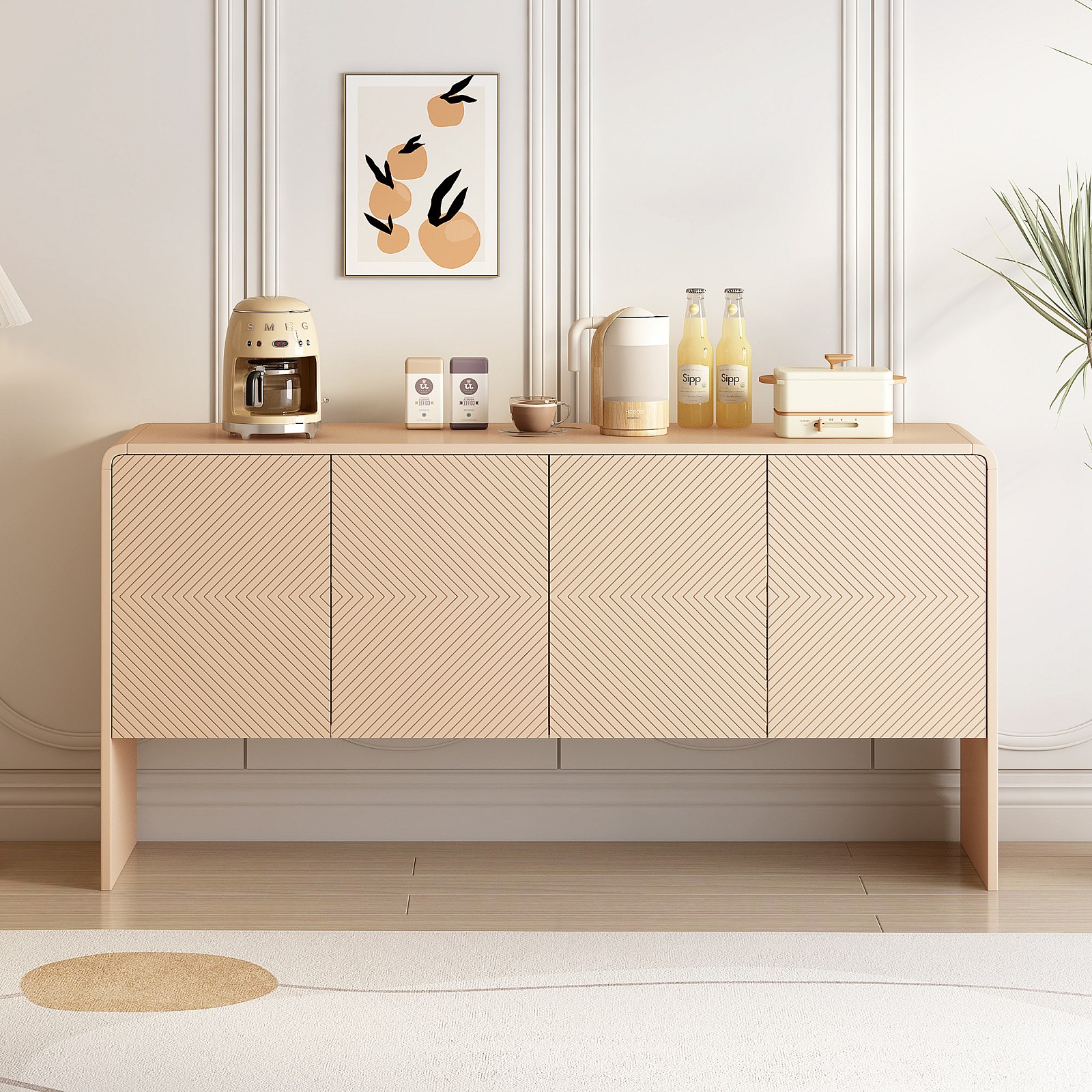Buffet 4 portes, Grand espace de rangement avec charnières à fermeture douce, abricot crème, élégant et pratique pour salon et entrée