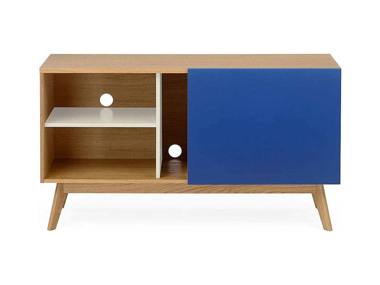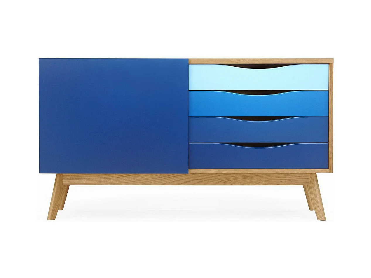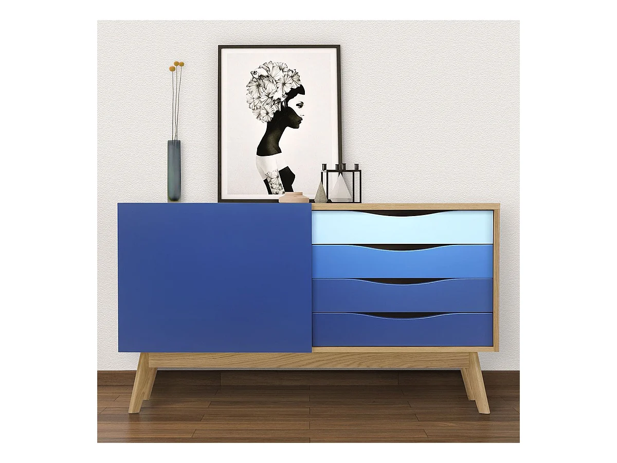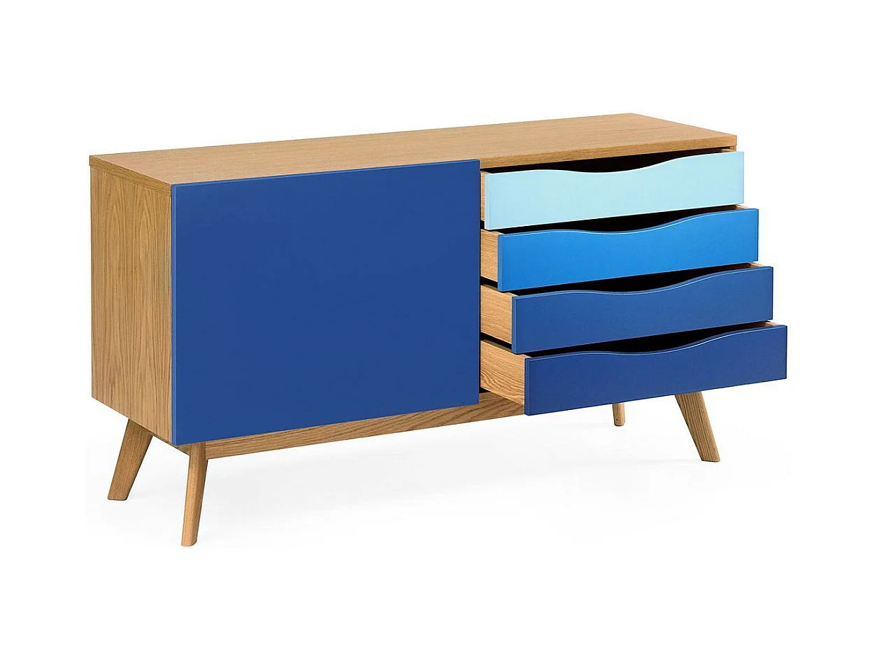 Buffet 4 Tiroirs & 1 Porte "Avon" 128cm Chêne & Bleu Foncé
