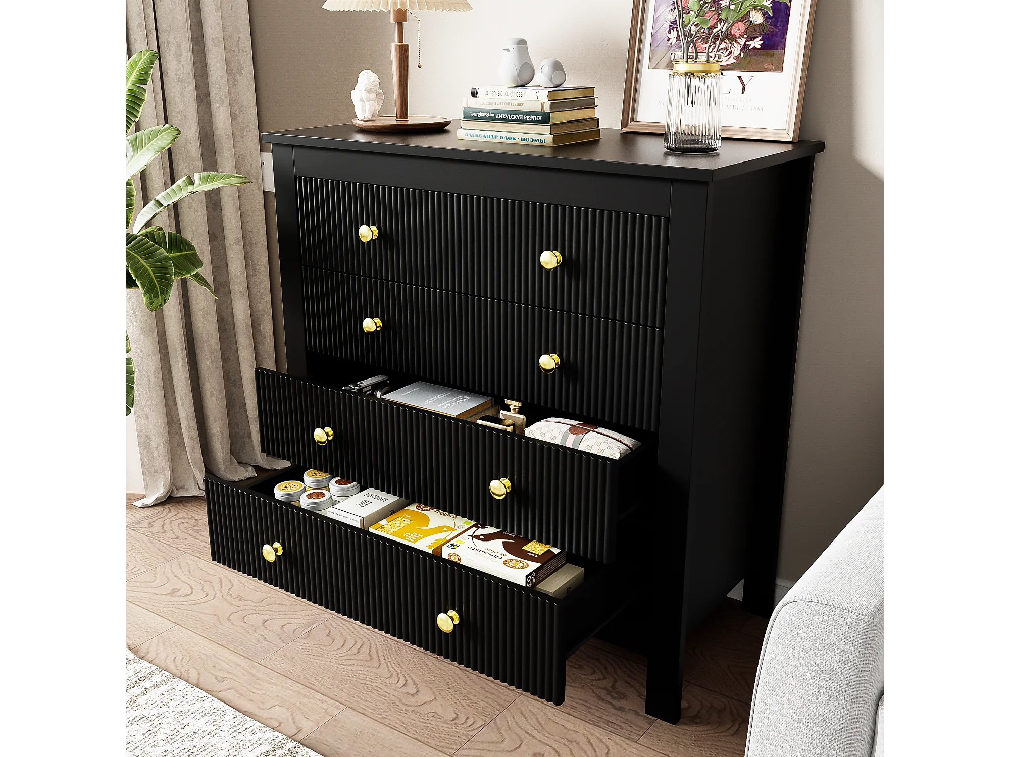Buffet 79x39.5x80.5cm avec 5 tiroirs, corps en noir avec poigneés dorés