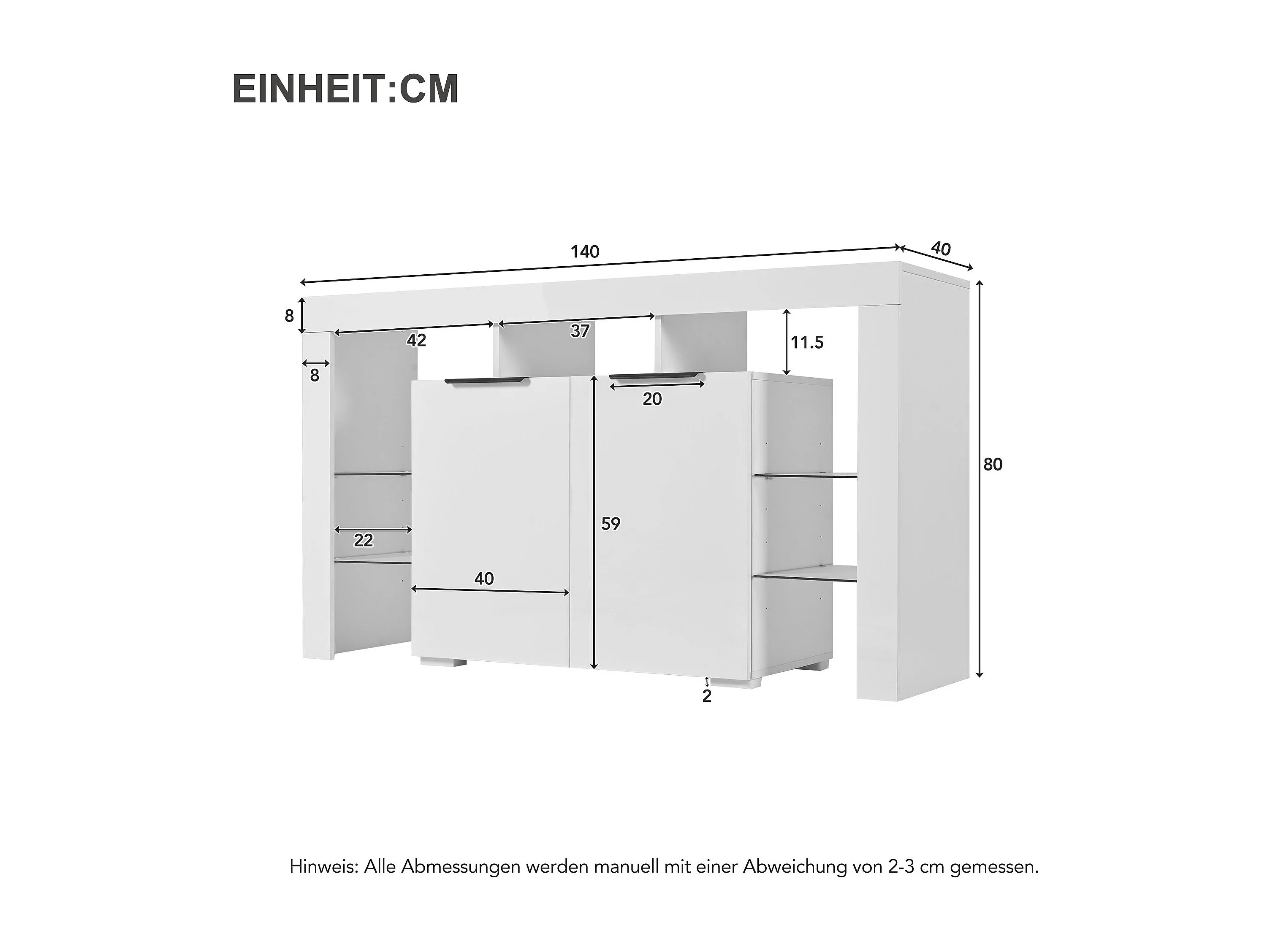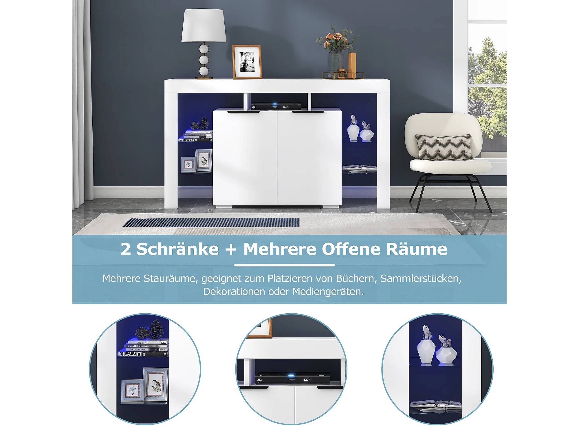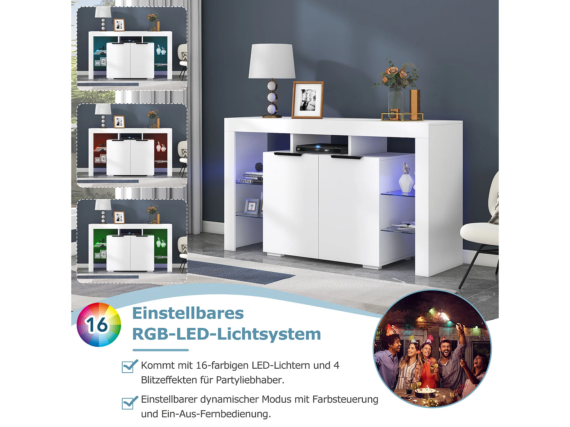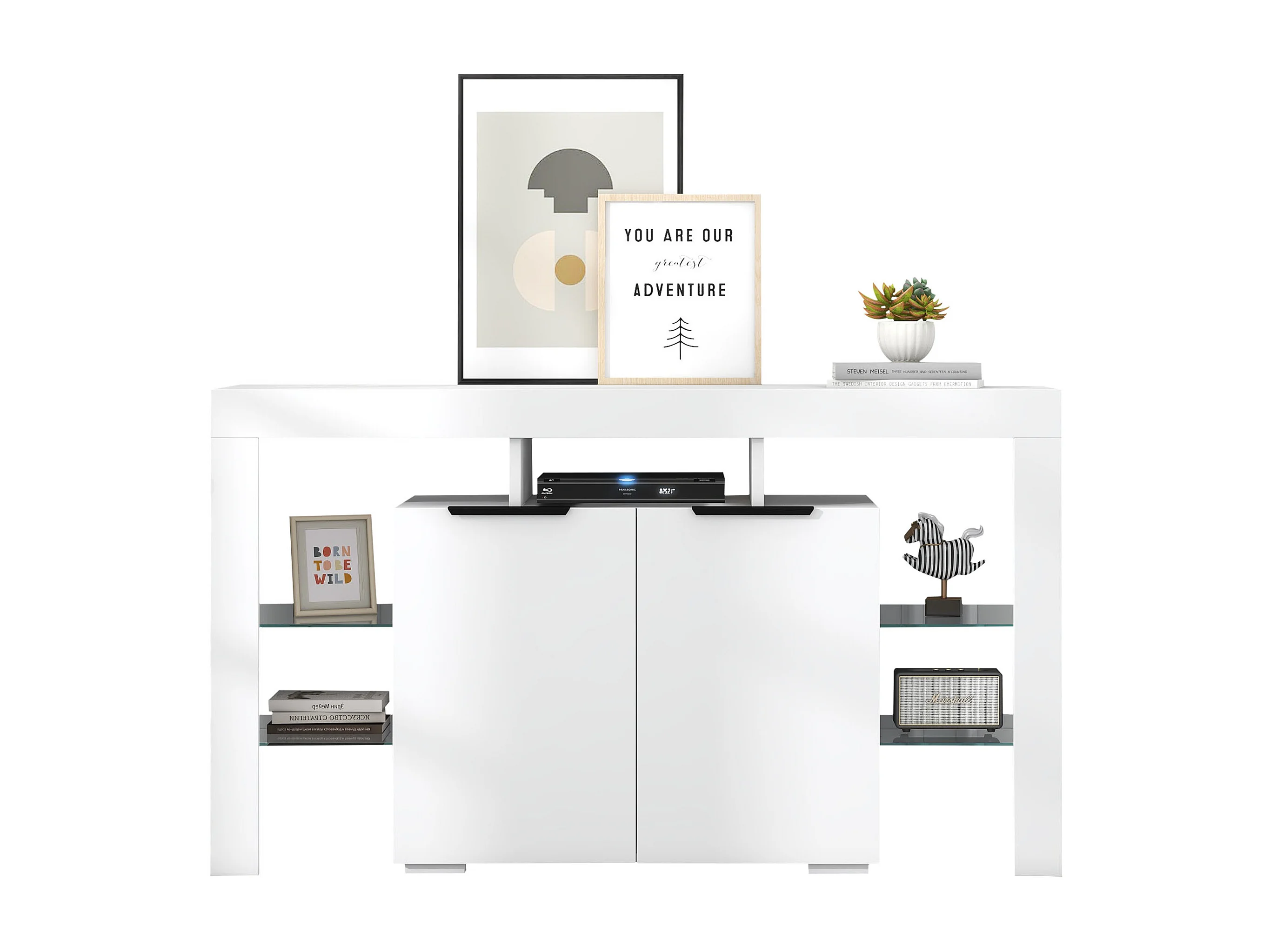 Buffet à haute brillance avec 2 portes et étagères en verre - LEDs - pour cuisine et salon - bois panneaux de particules - blanc
