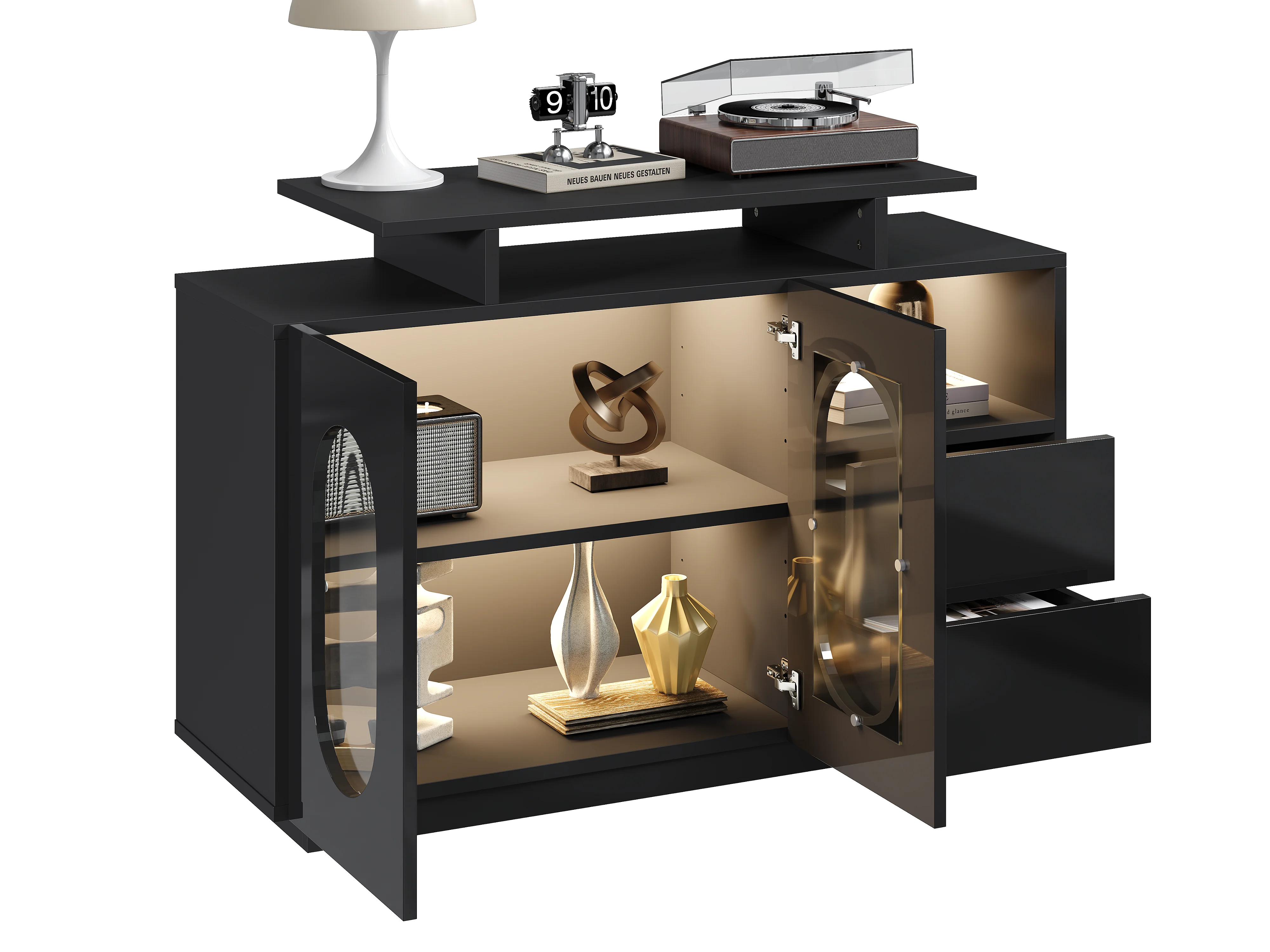 Buffet à LED Moderne - 120x40x80 cm - Noir Brillant avec Portes en Verre - Éclairage Intégré - Rangement Modulable - Multifonction (Salon, Salle à Manger, Entrée)