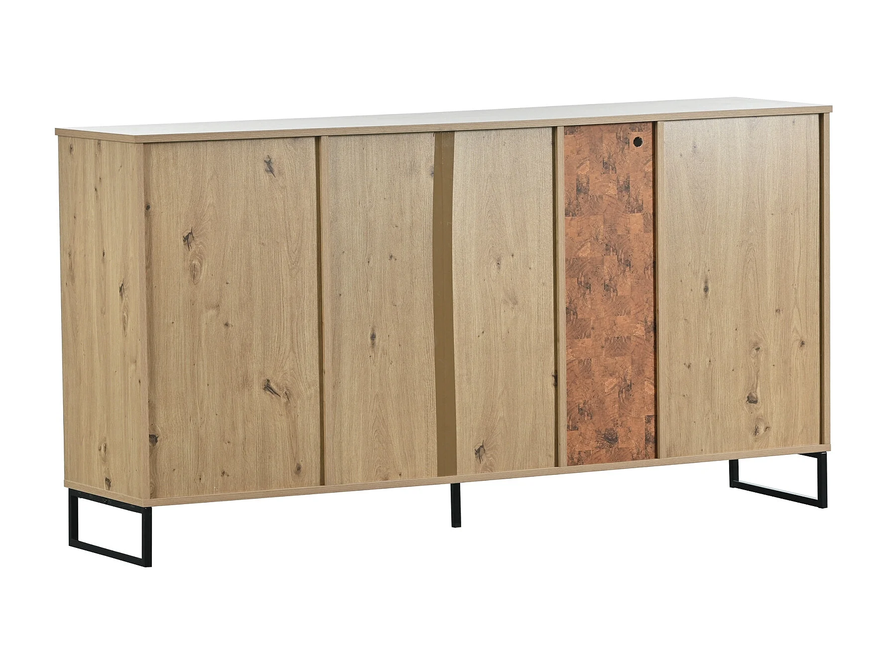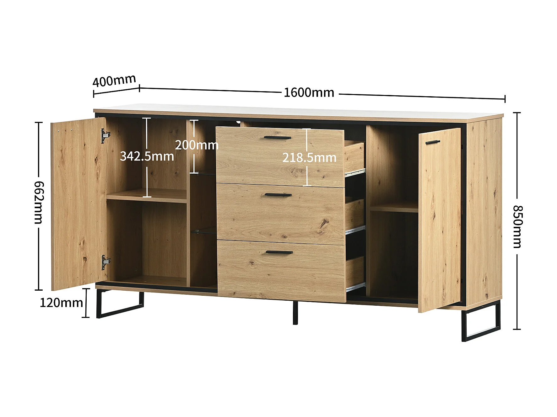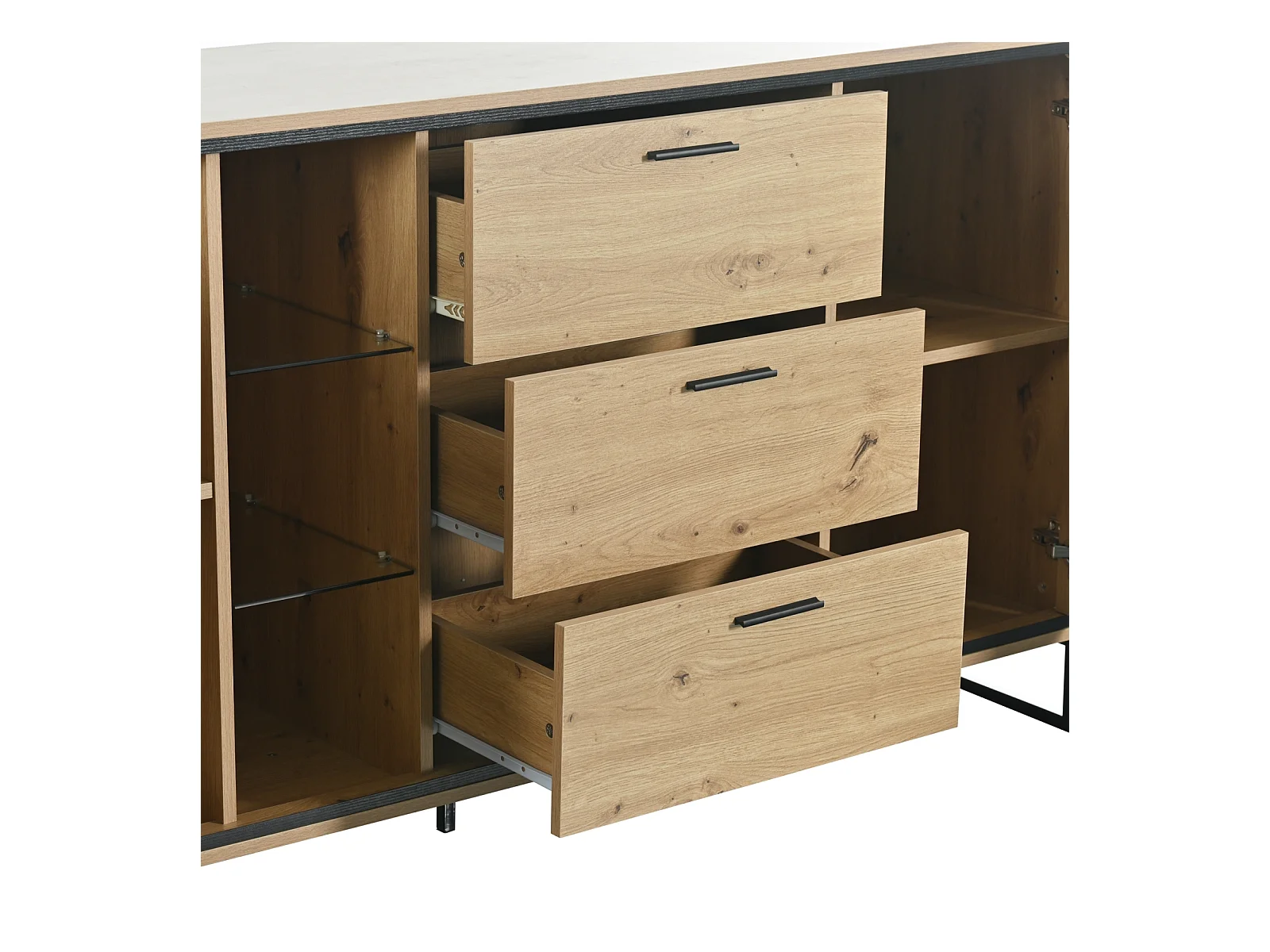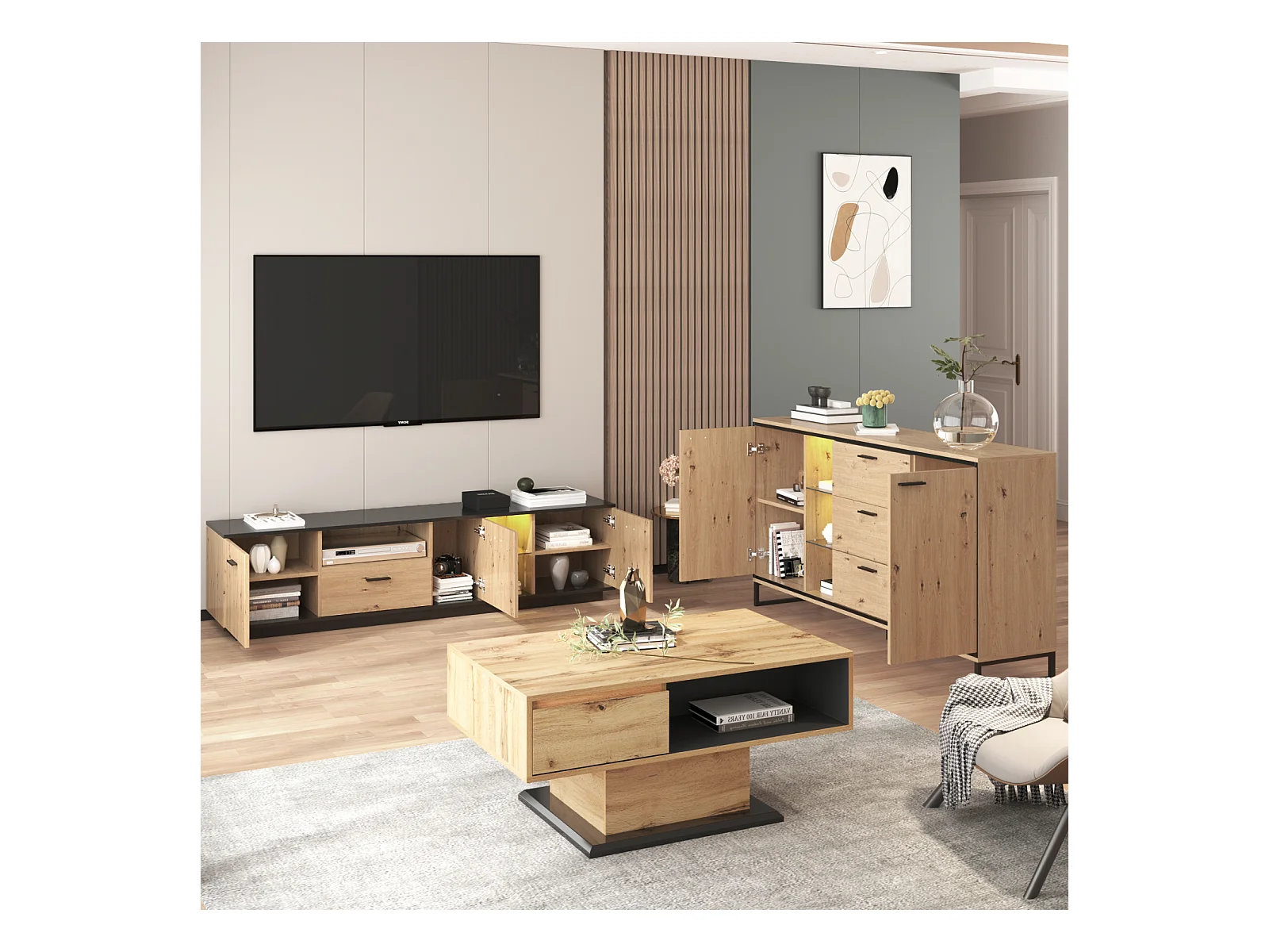 Buffet moderne à 3 tiroirs et 2 portes, noir et bois. Design élégant avec compartiments de rangement, alliant style et fonctionnalité pour un intérieur soigné