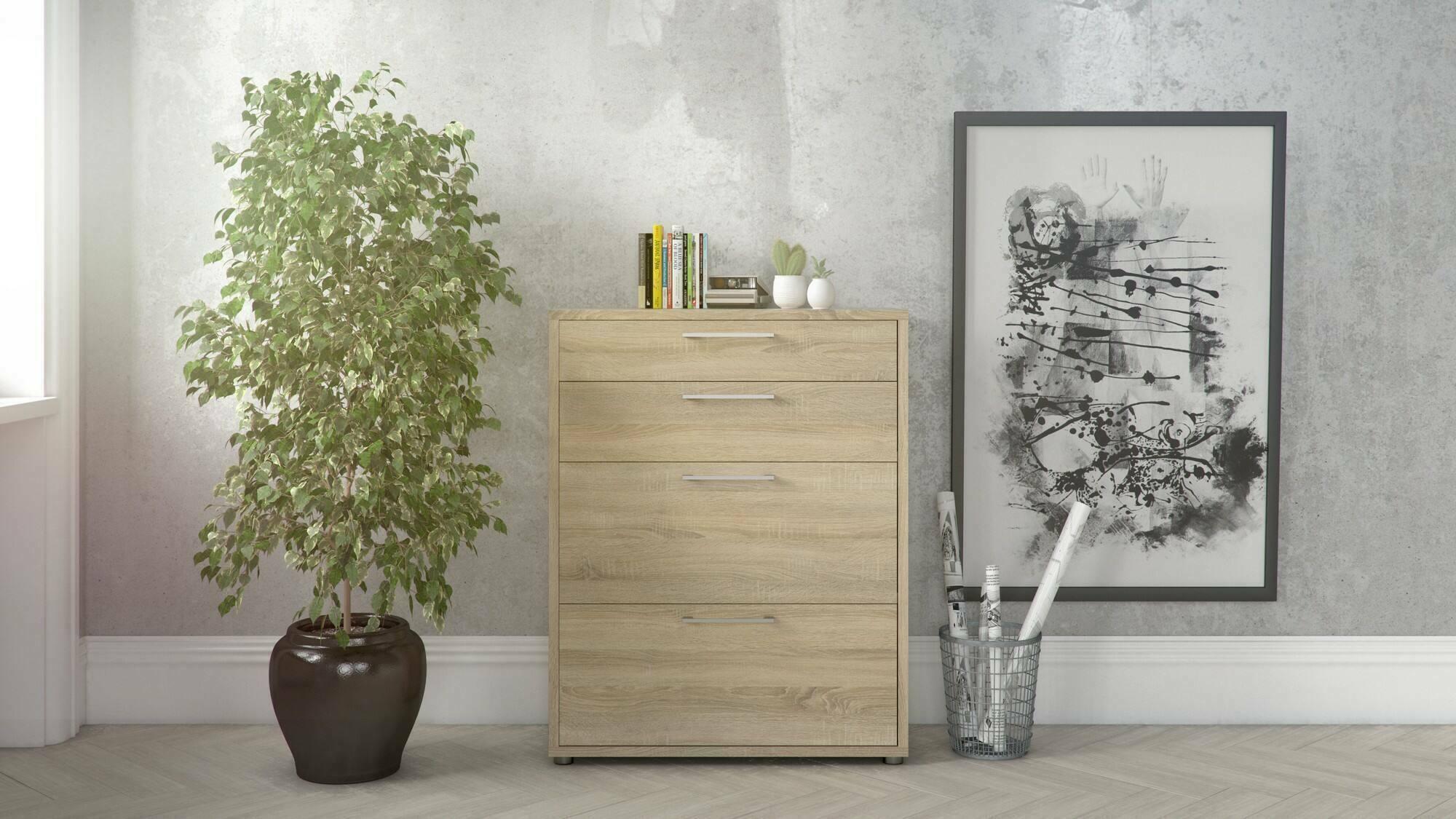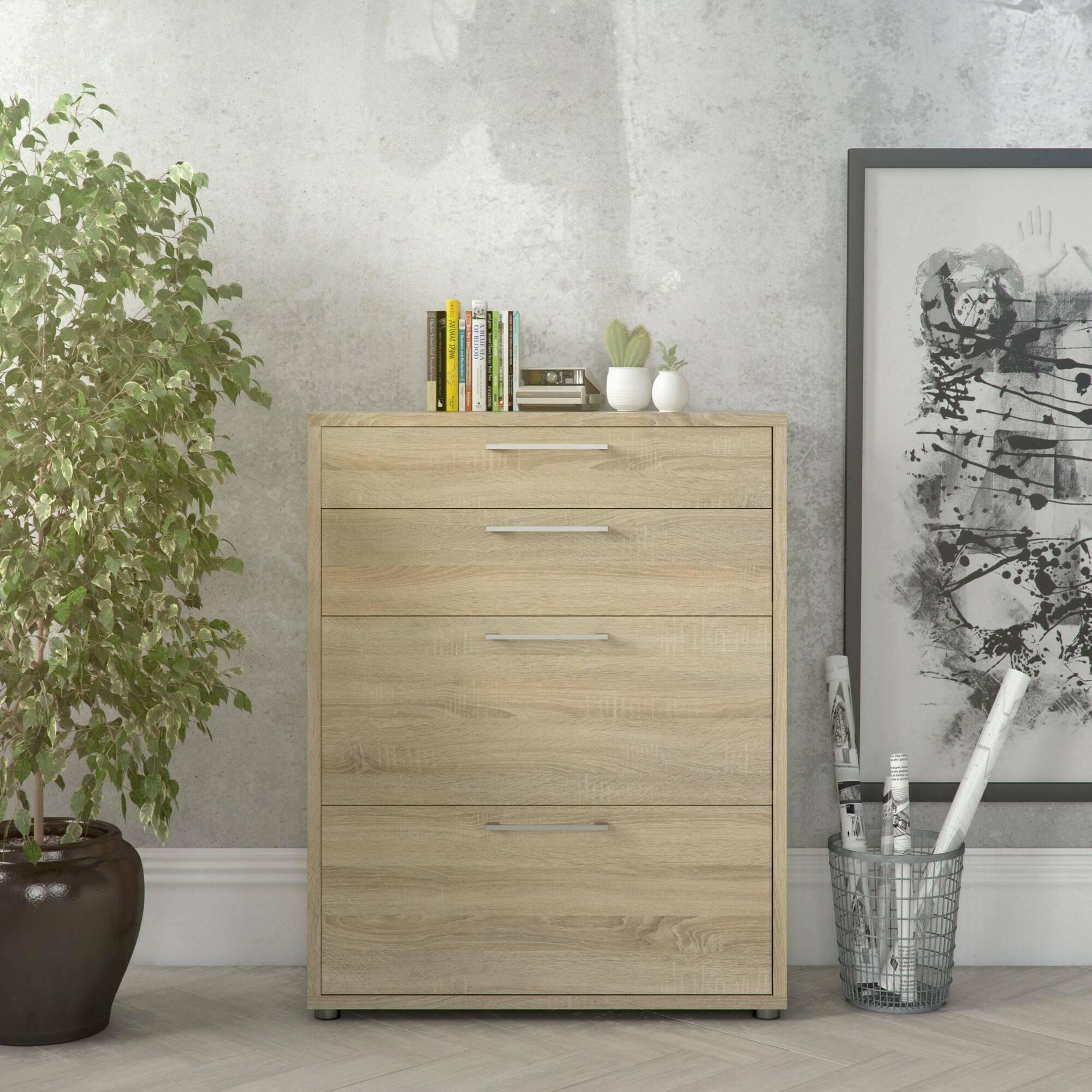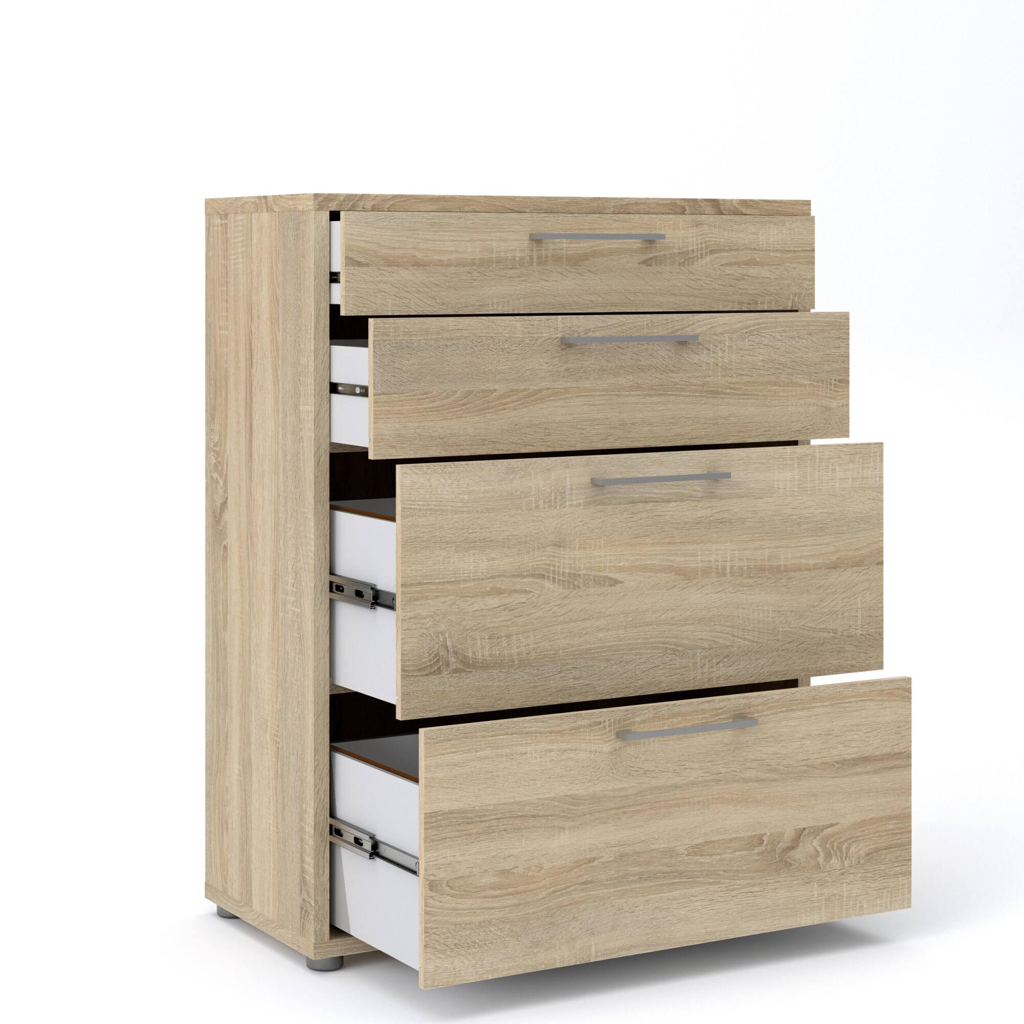 CARACTÉRISTIQUES TECHNIQUES - Accessoire d'ameublement polyvalent, conçu pour une intégration facile avec d'autres meubles - Emballage résistant, conçu pour le commerce électronique - Matériau: Panneau de particules mélaminé - Informations supplémentaires: Article certifié EPA 40 CFR TSCA - Libération de formaldéhyde conforme aux directives IOS/MAT/0181/EN 16894 - Démonté - Equipé d'un kit de montage - Quatre tiroirs.