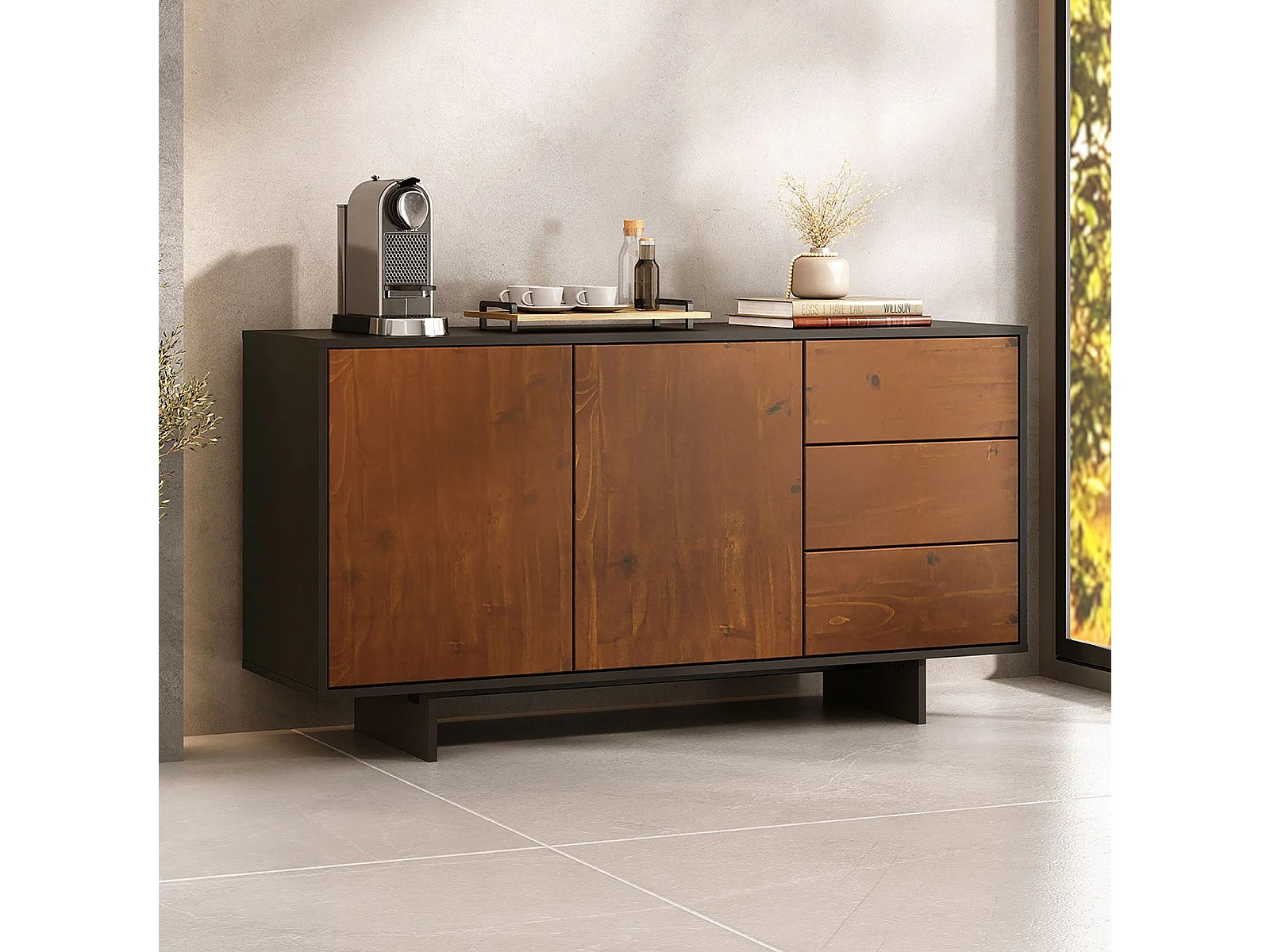 Buffet ARTO L 135 cm 2 Portes et 3 Tiroirs en Bois Massif avec Étagère Réglable, Design Moderne Sans Poignées
