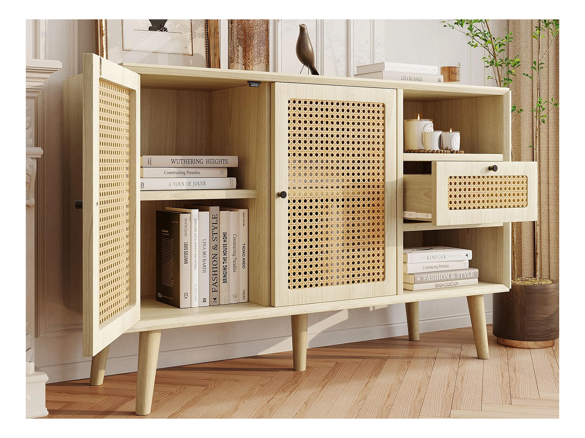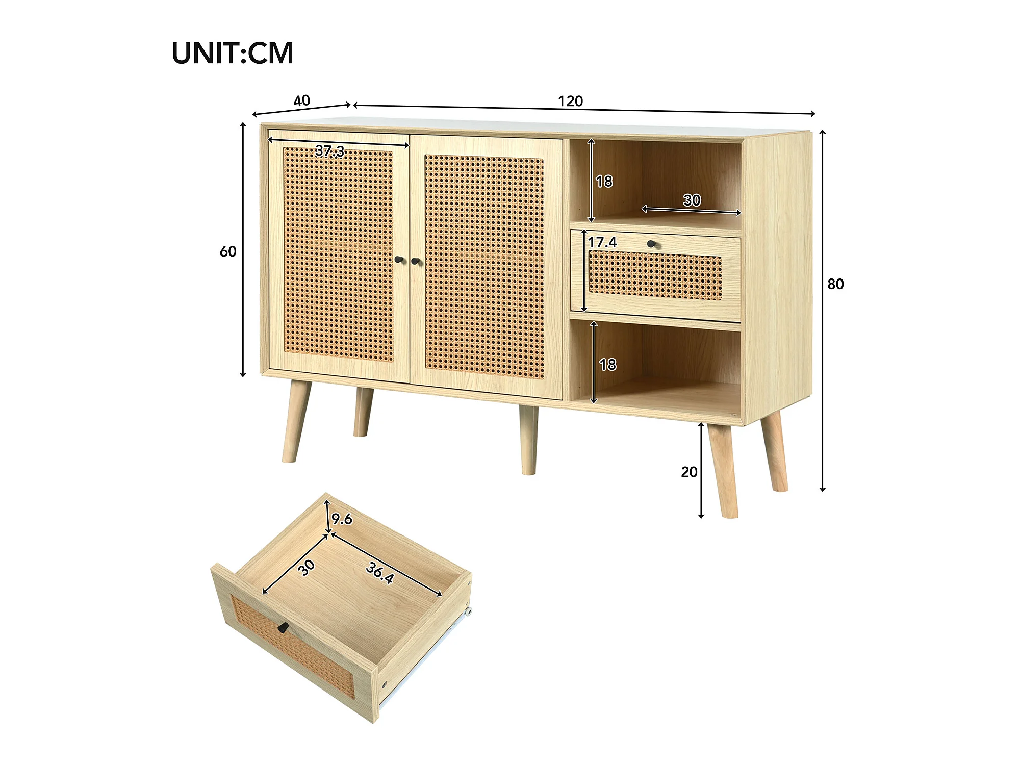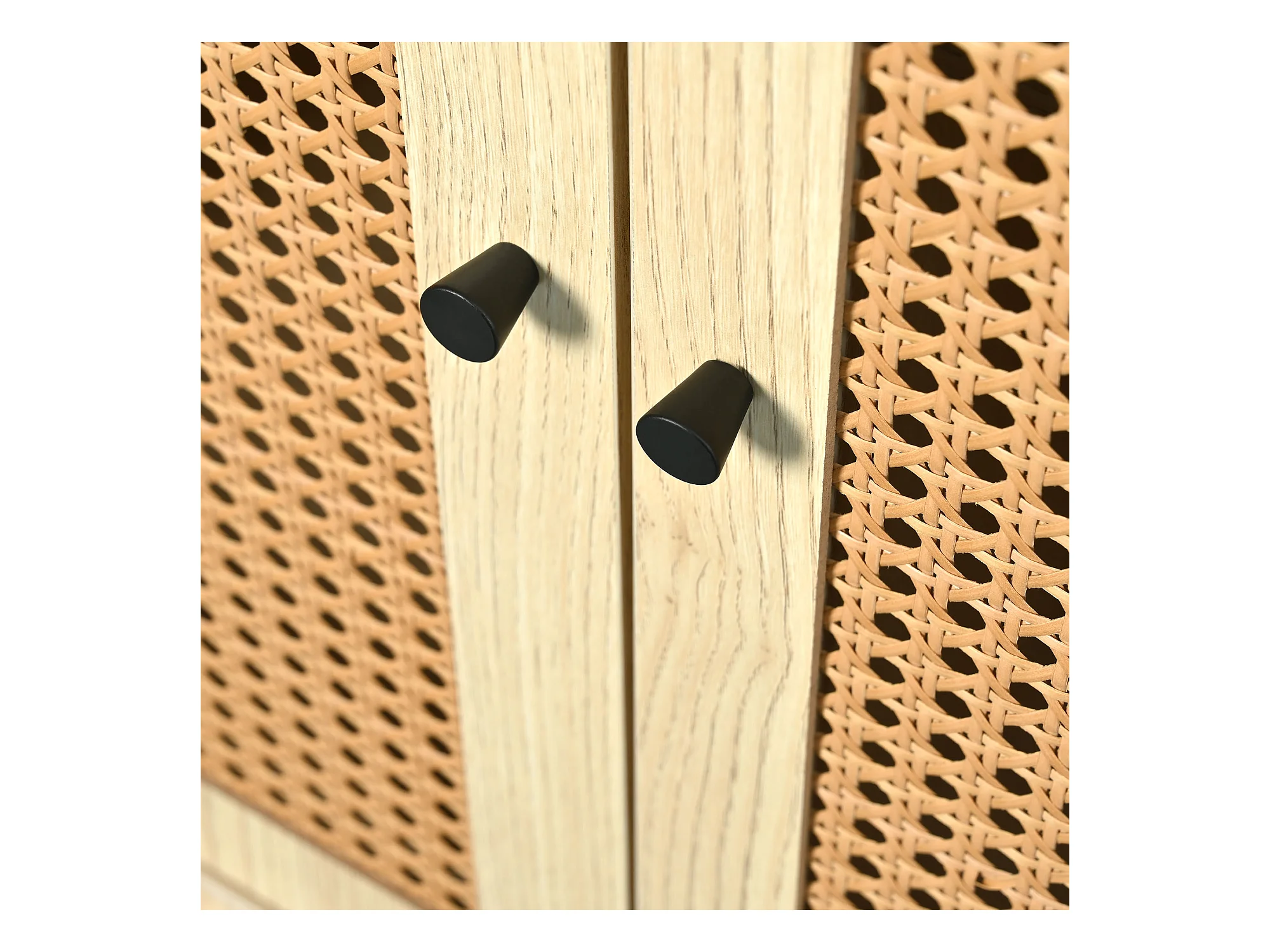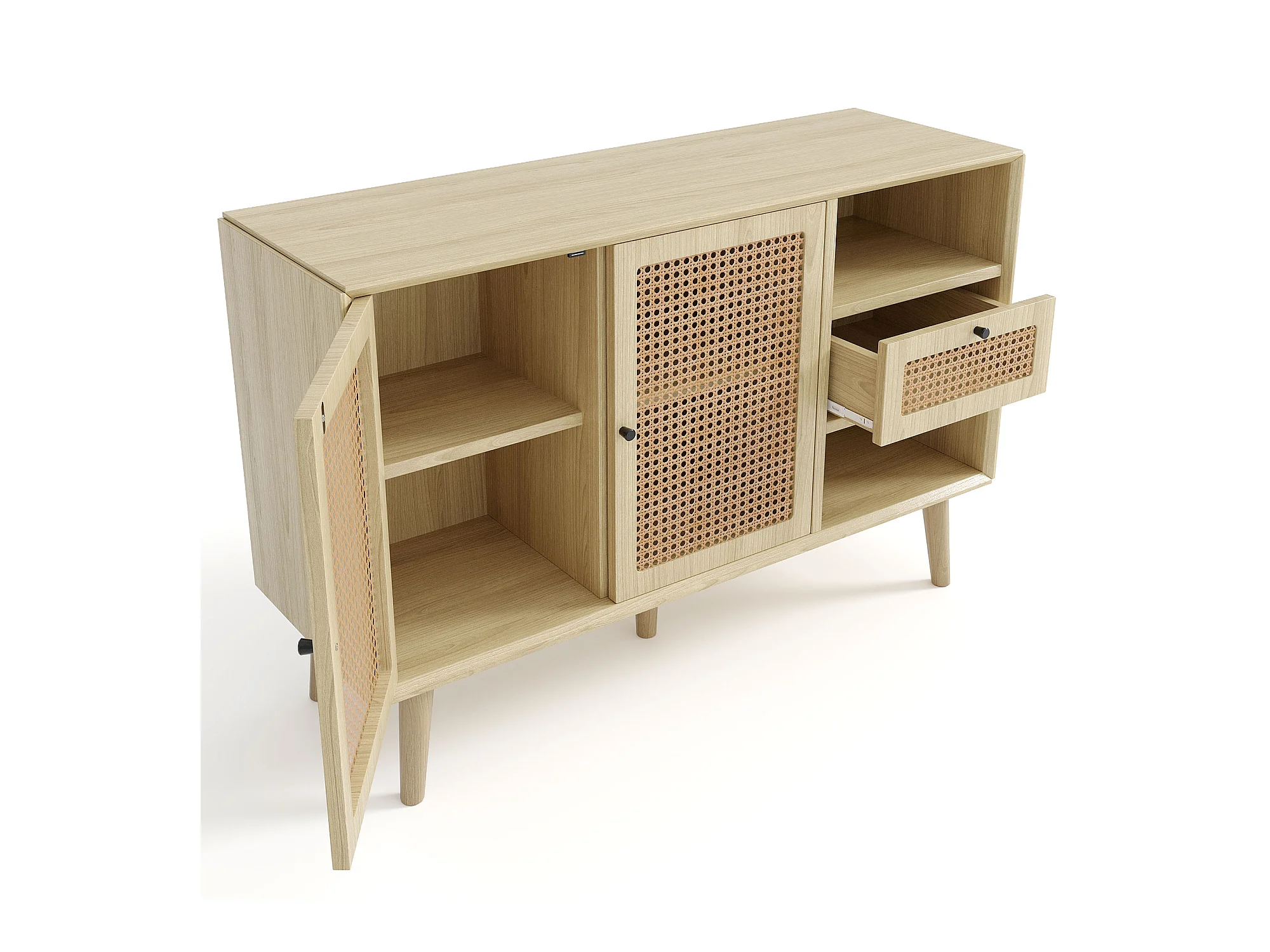 Buffet avec 2 portes, 1 tiroirs et 2 niches en MDF - effet rotin - coloris naturel