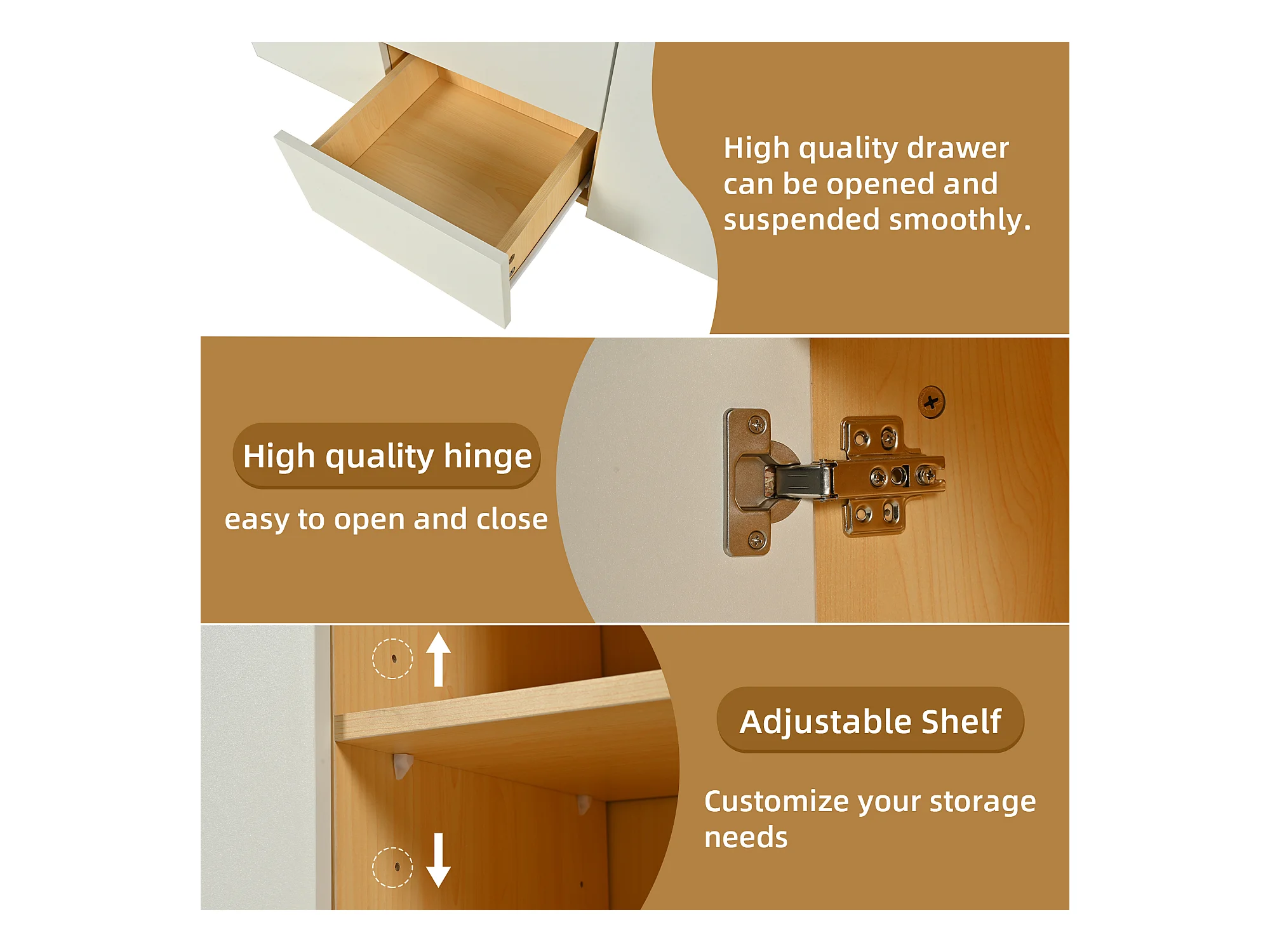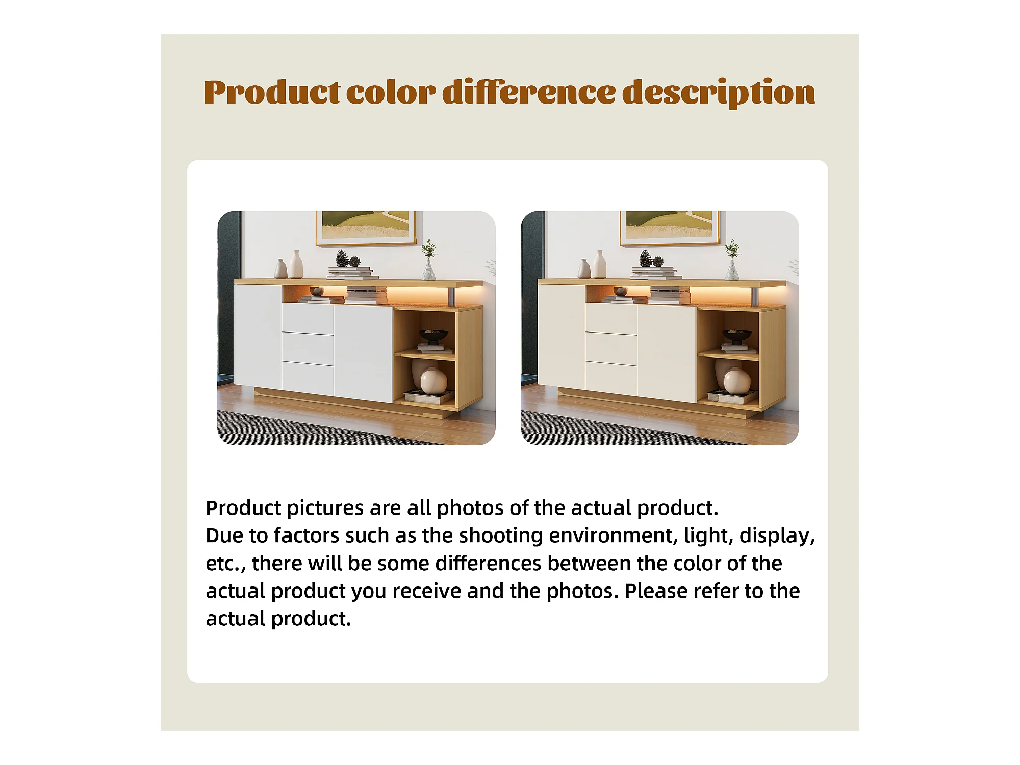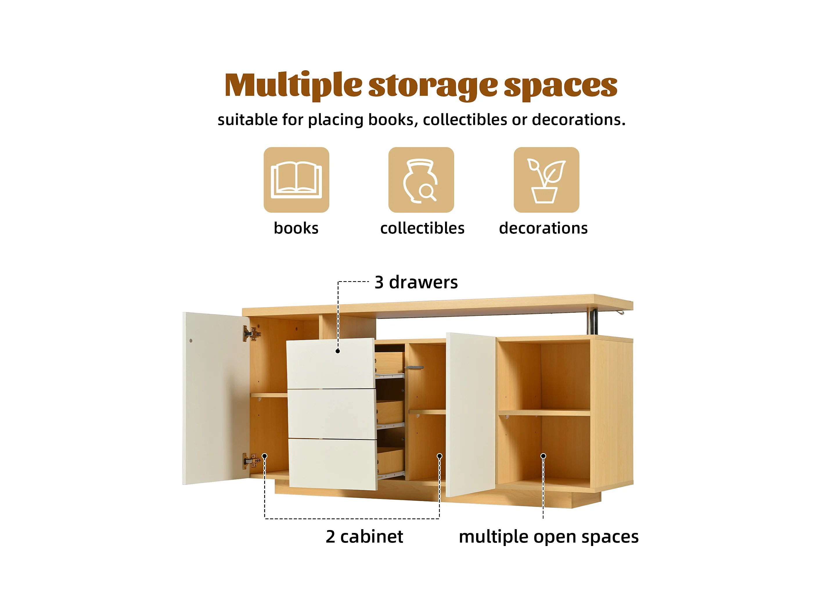 Buffet avec 2 portes, 3 tiroirs et 2 compartiments - 140 x 40 x 70 cm - LEDs - Panneaux de particules - Blanc + chêne