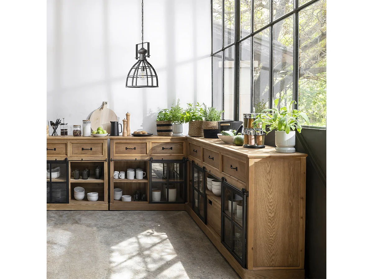 Buffet avec 2 portes 4 tiroirs en bois et verre - Longueur 160 x Profondeur 40 x Hauteur 85 cm