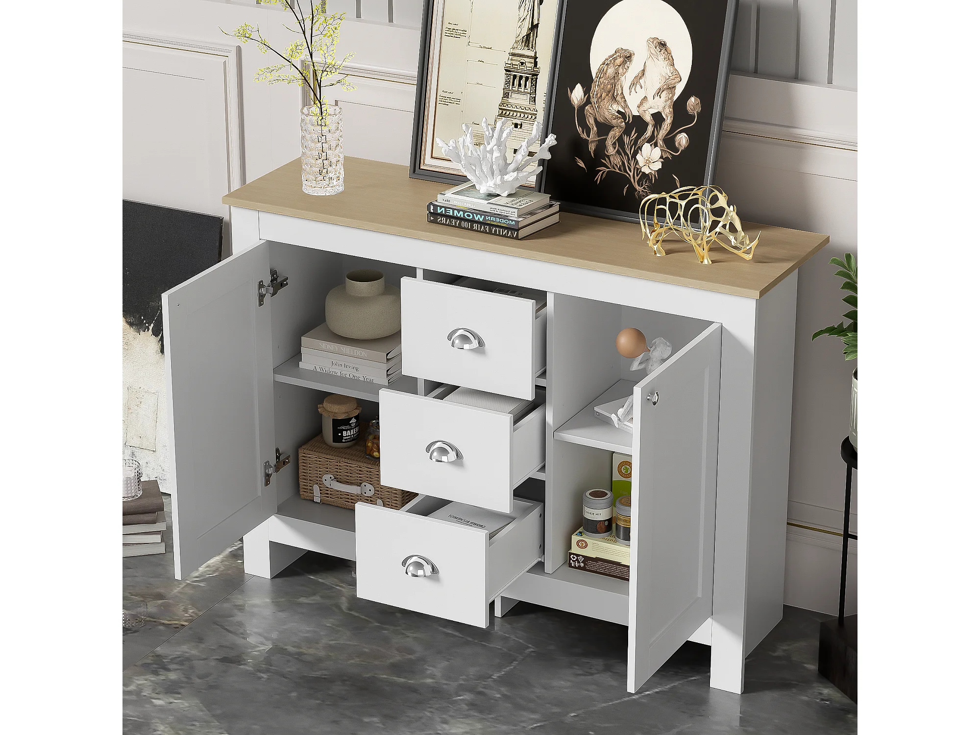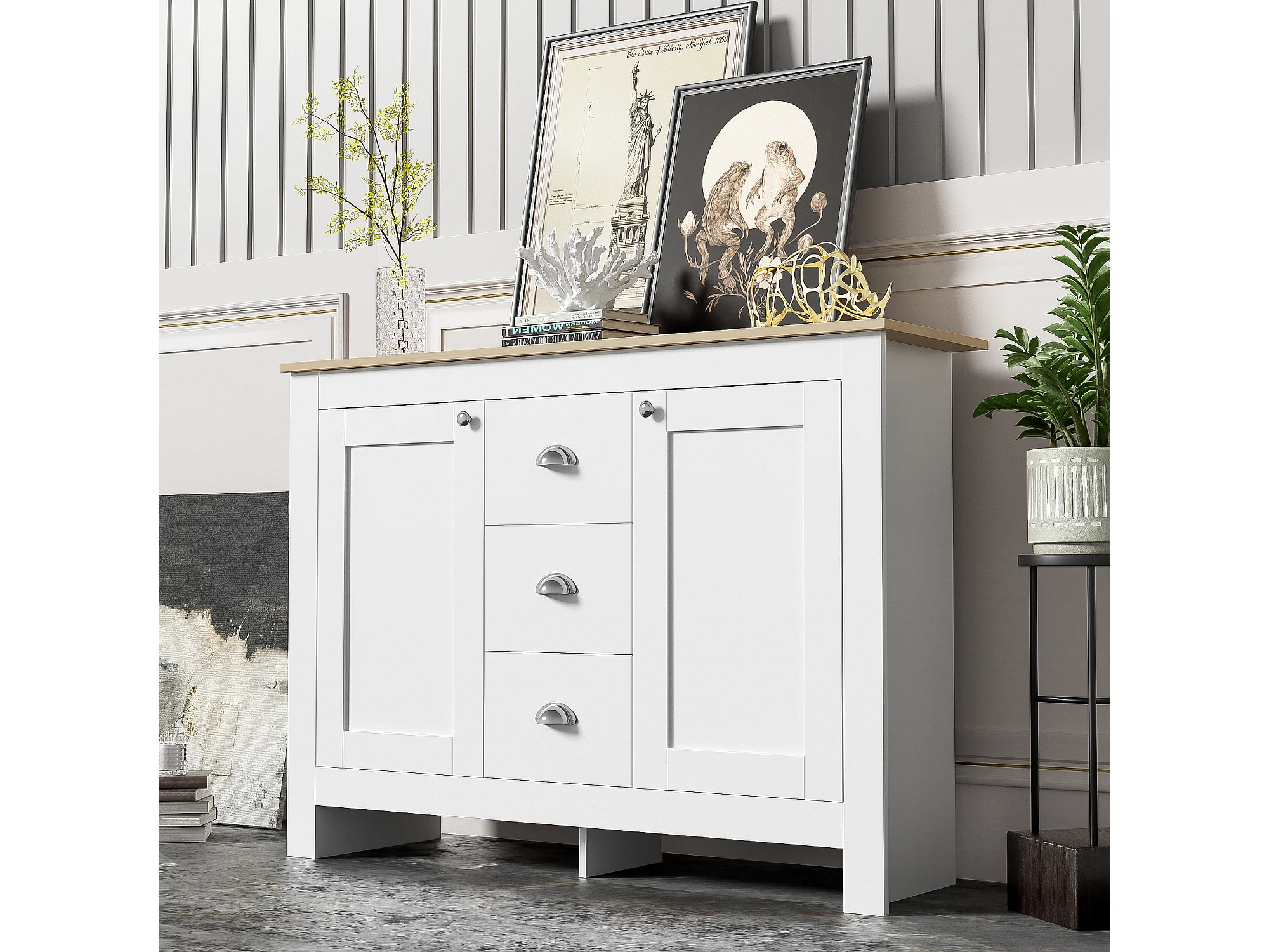 Buffet avec 2 portes et 3 tiroirs - 116 x 35 x 81 cm - MDF et panneaux de particules - Coloris: blanc + bois