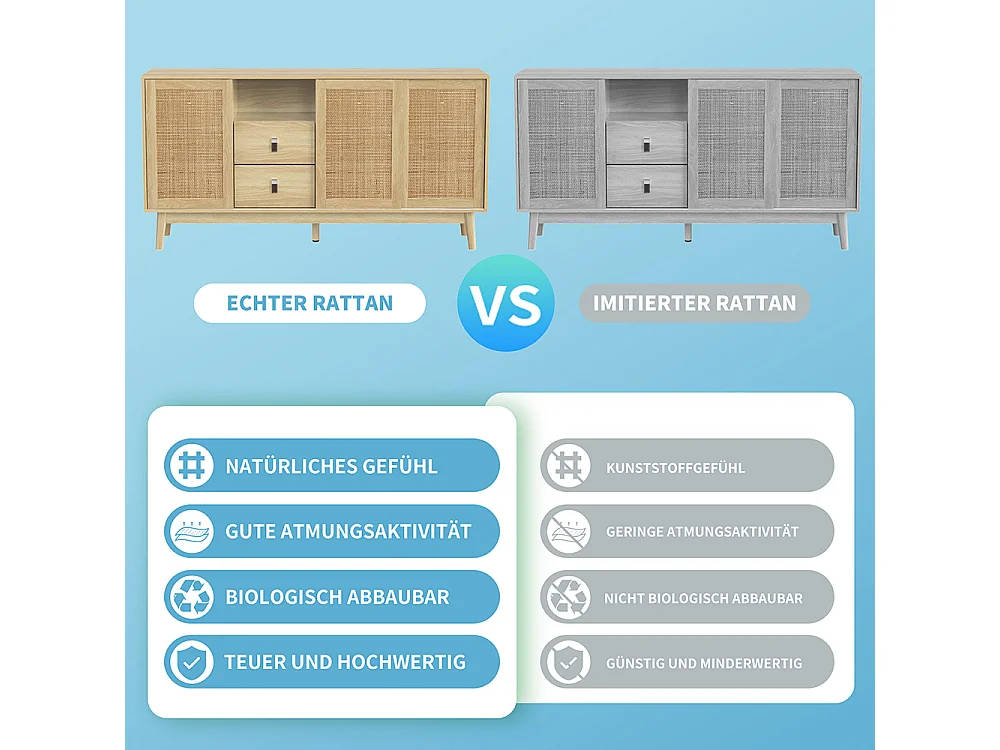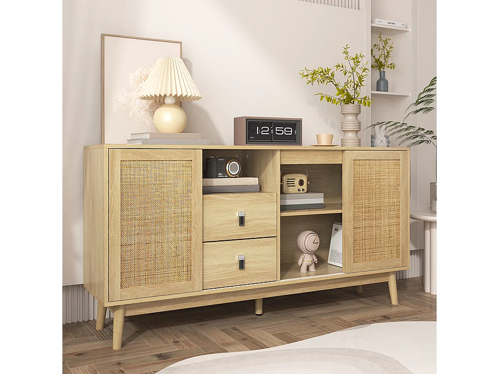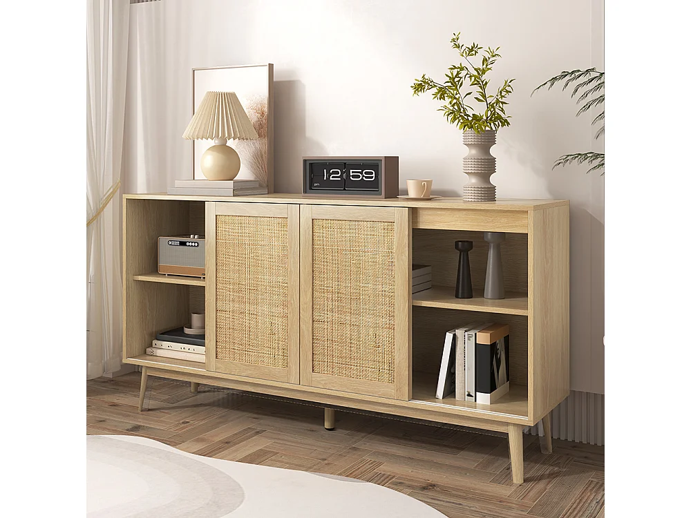 Buffet avec 3 portes coulissantes en rotin véritable et 2 tiroirs respirant stable et polyvalent Naturel
