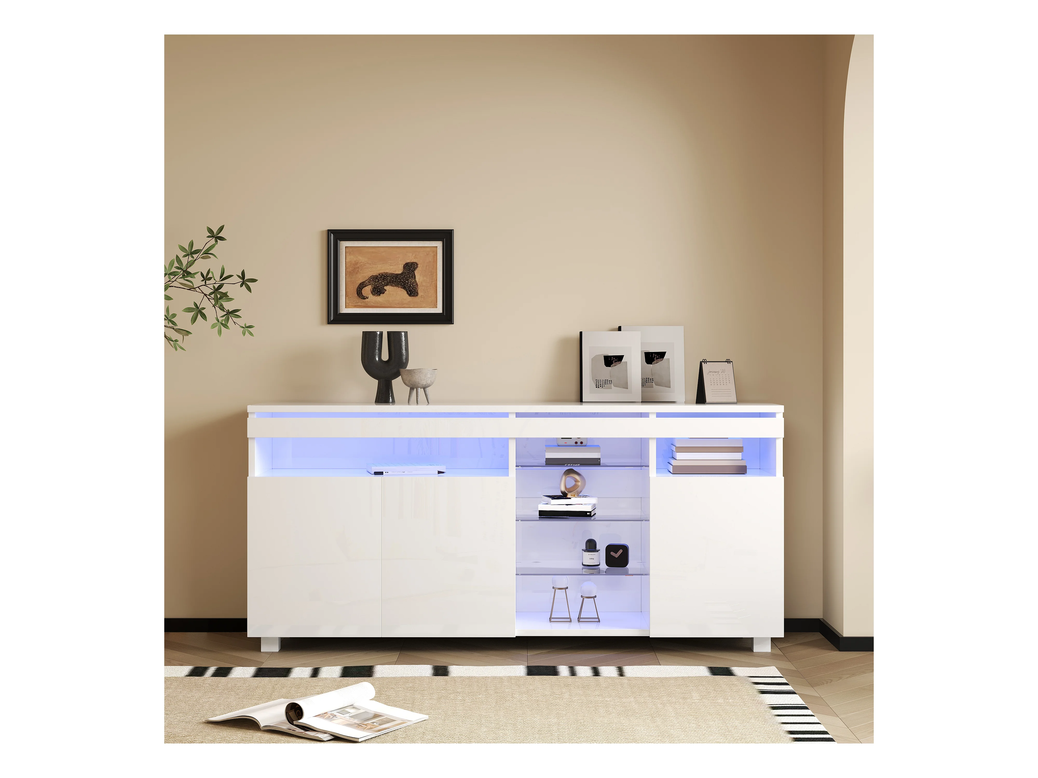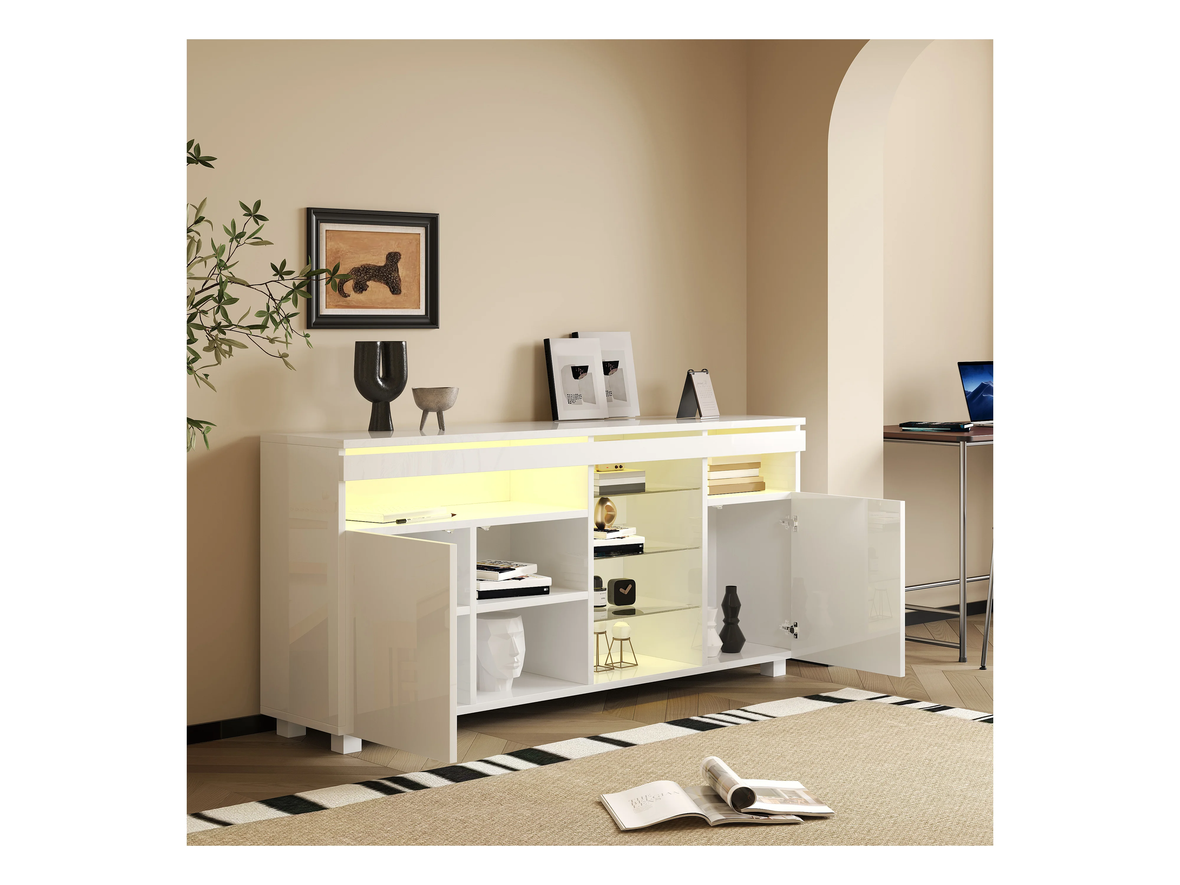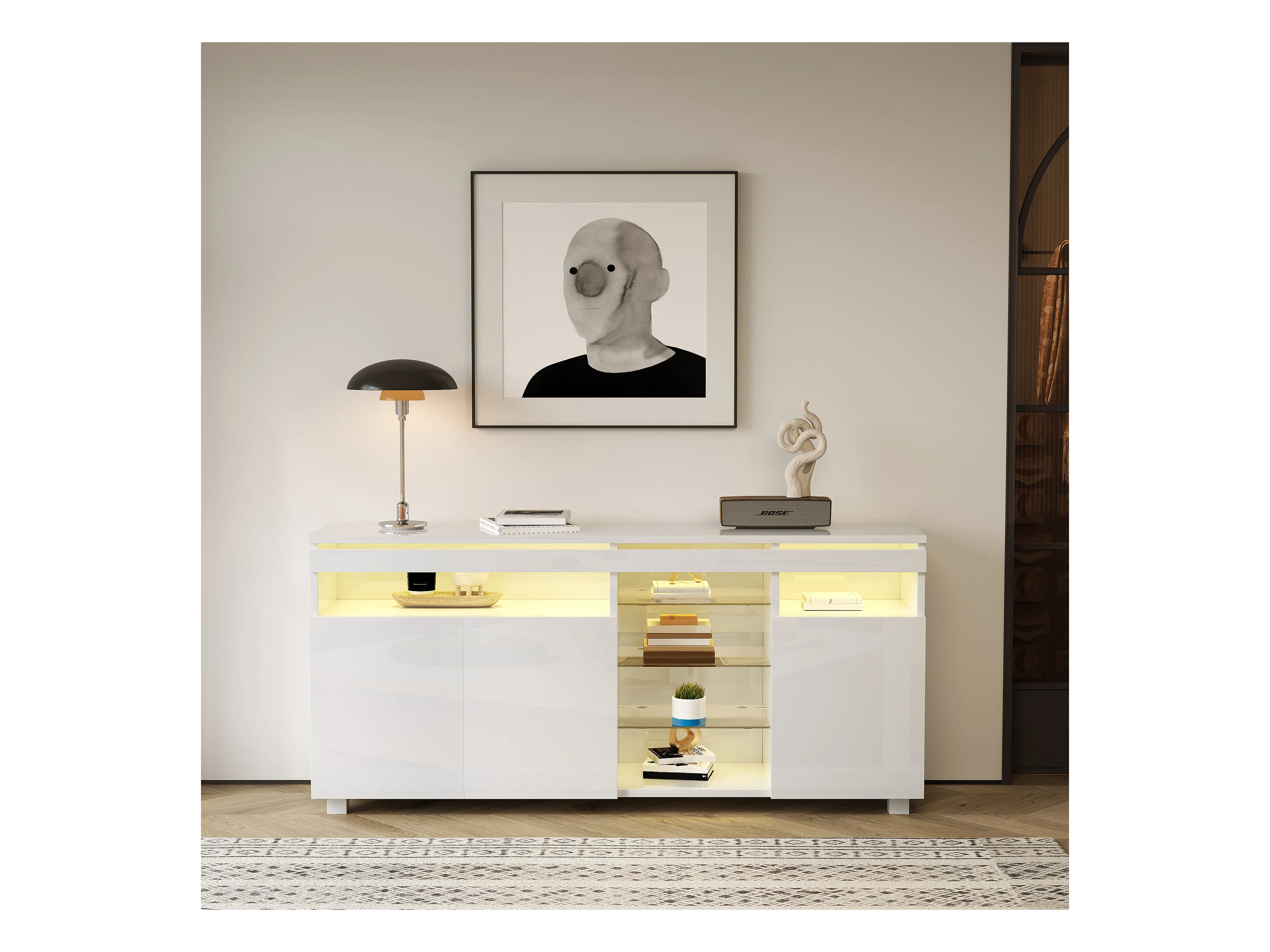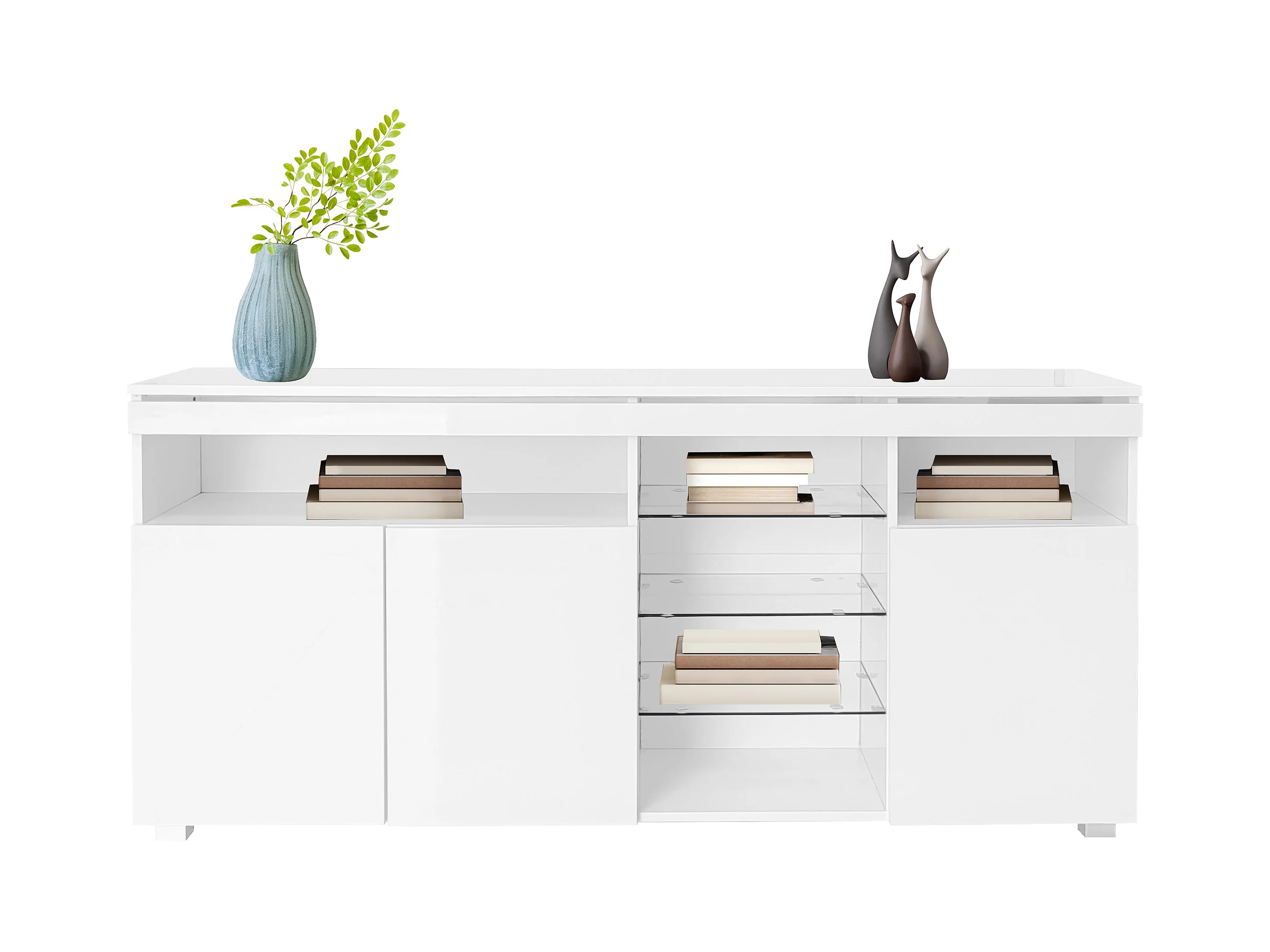 Buffet avec 3 portes et étagères en verre - 155 x 35 x 72 cm - LEDs - Panneau de particules - Blanc brillant