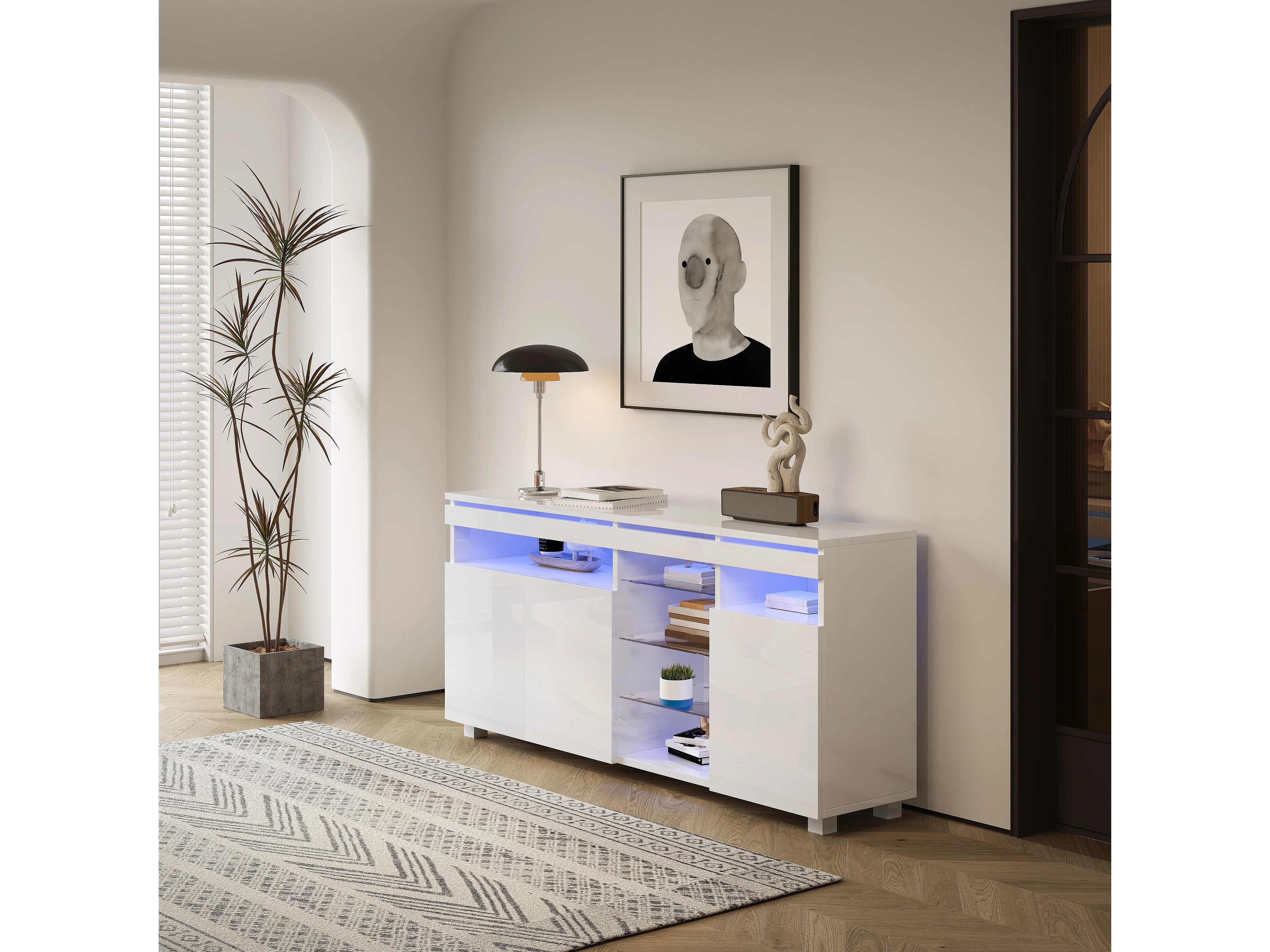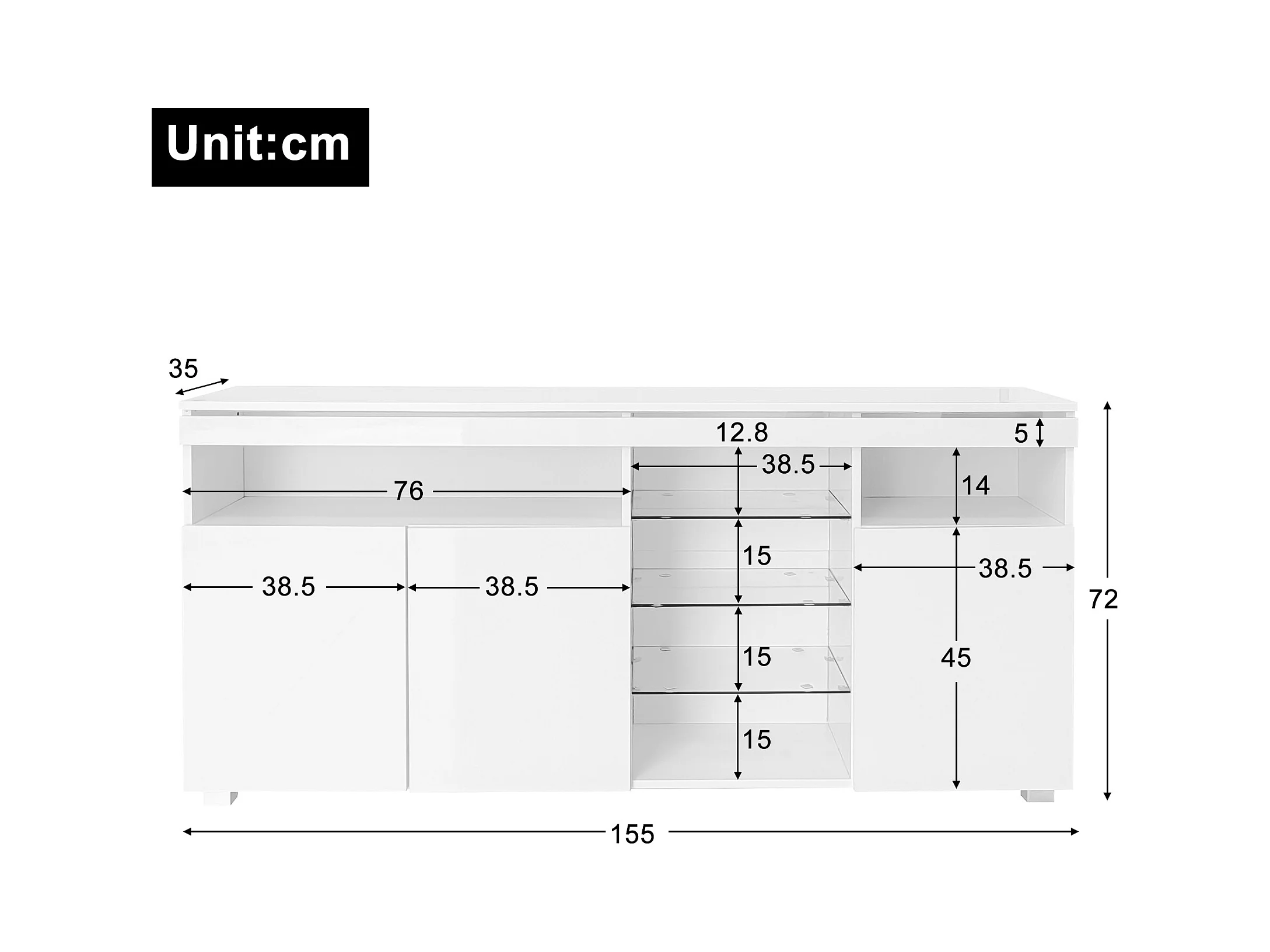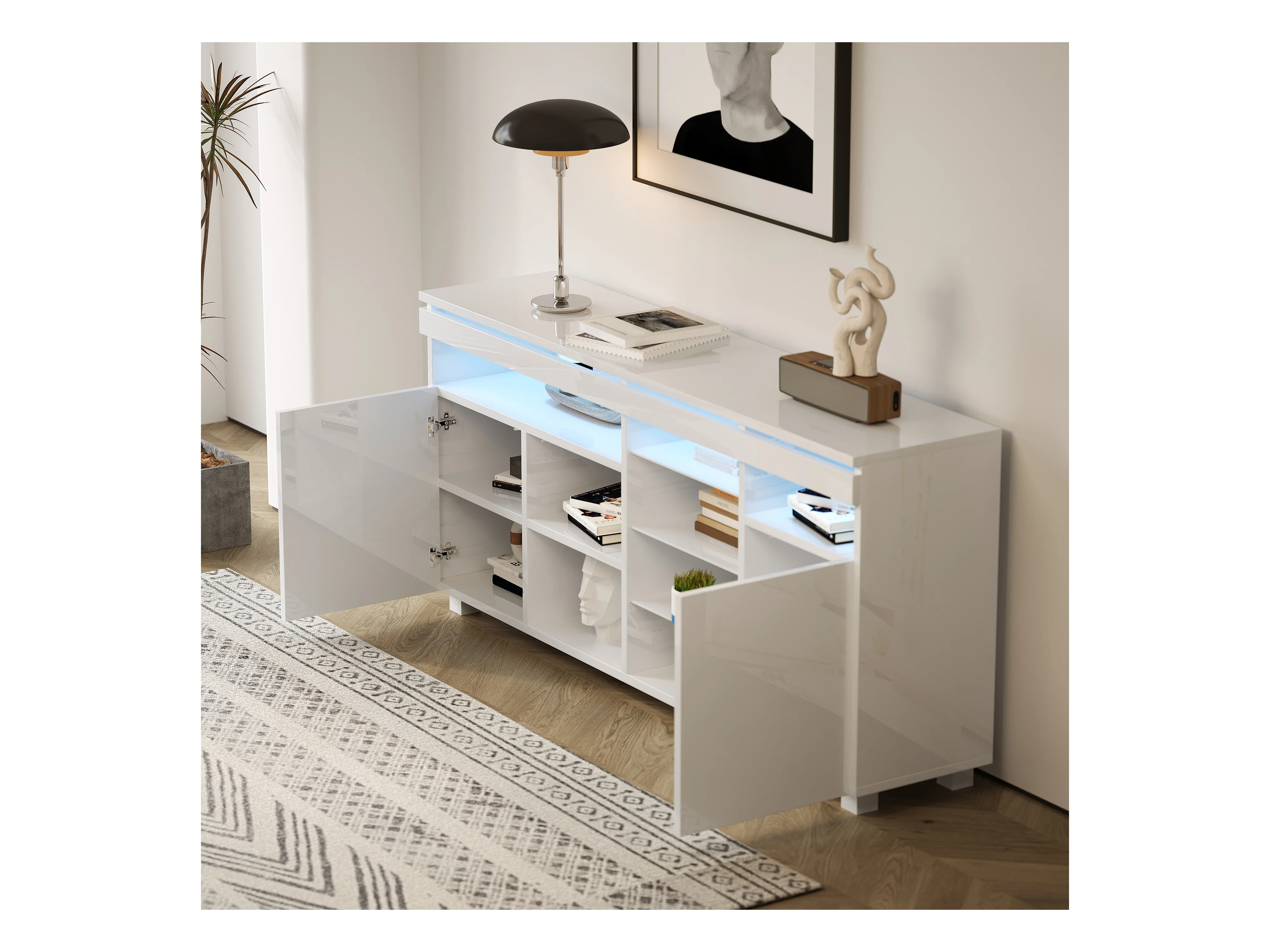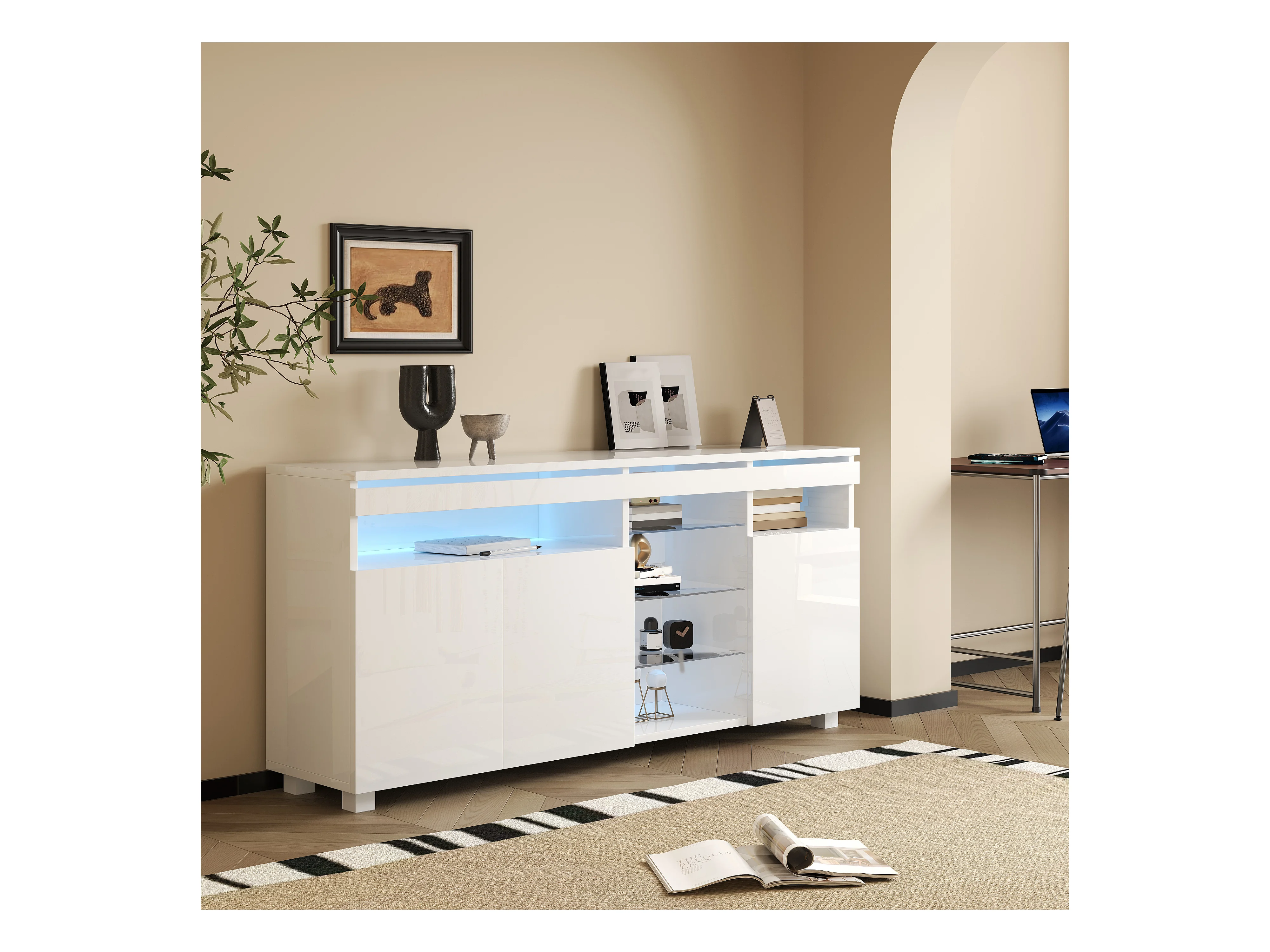 Buffet avec 3 portes et étagères en verre - 155 x 35 x 72 cm - LEDs - Panneau de particules - Blanc brillant