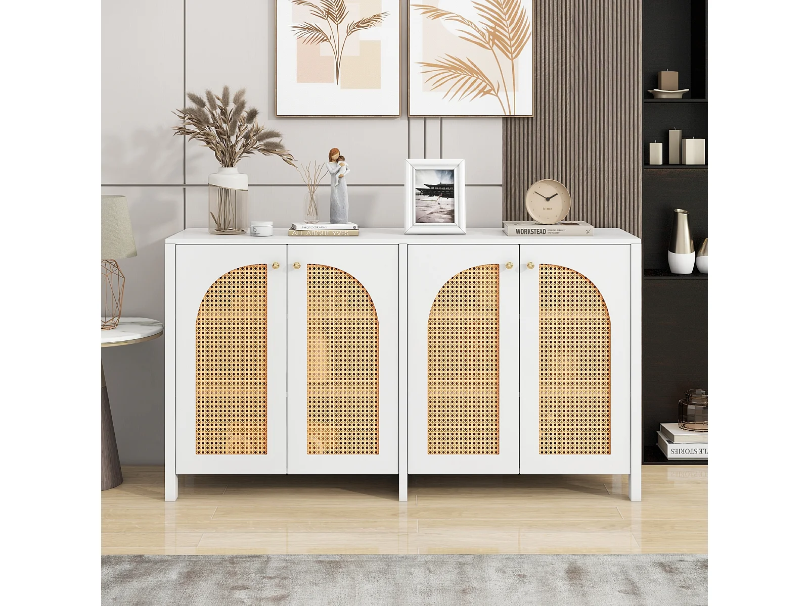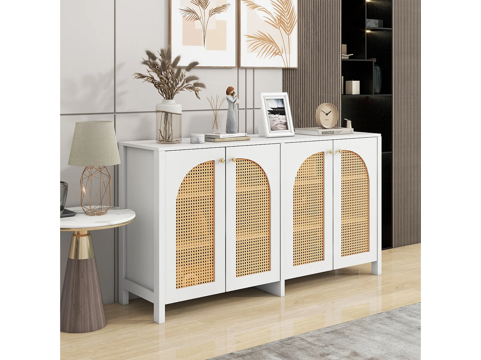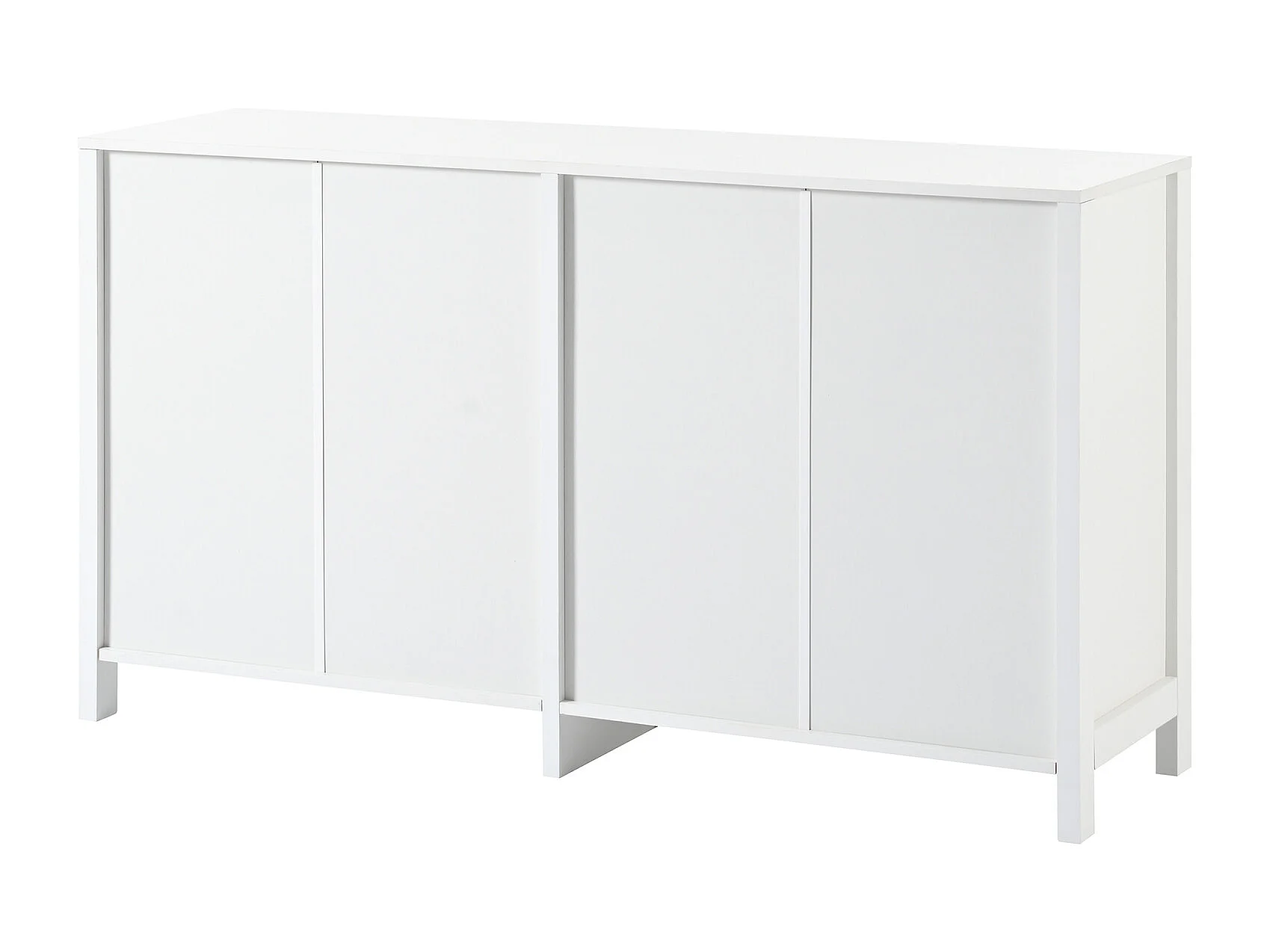 Buffet avec 4 portes en rotin - 145 x 40 x 80 cm - avec étagères réglables - Blanc