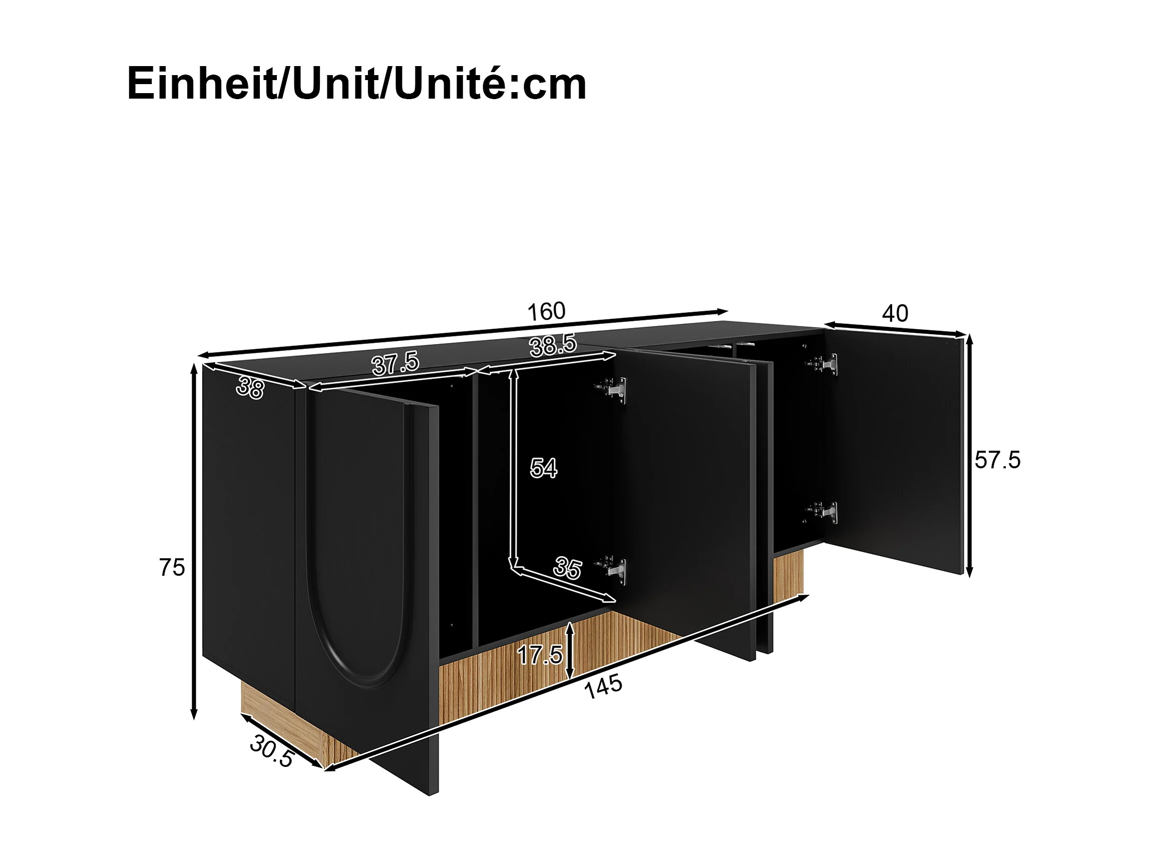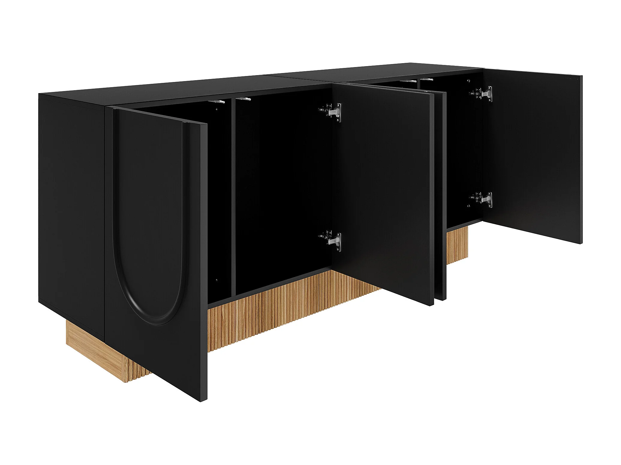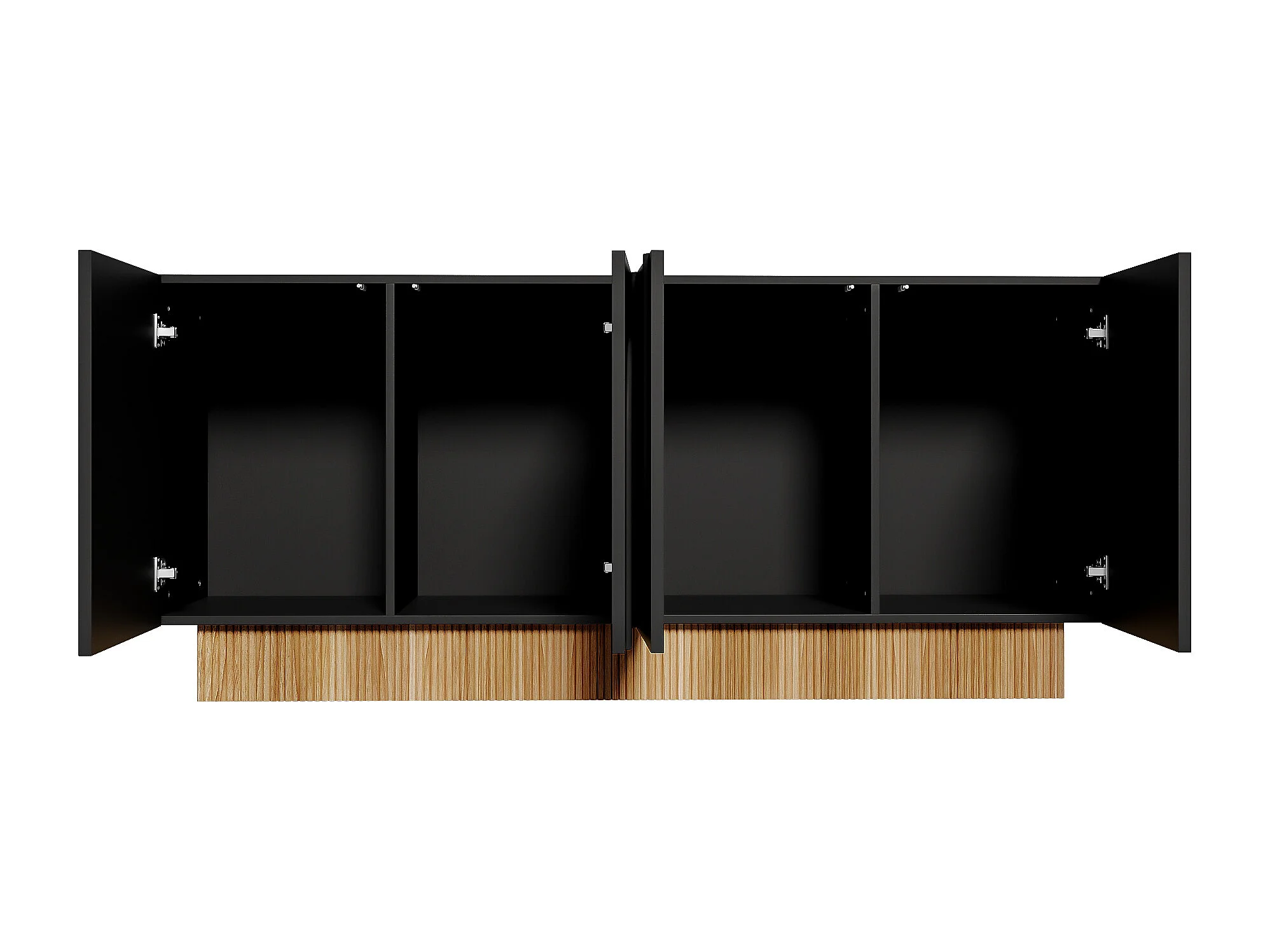 Buffet avec 4 portes noires - Base rayée en couleur bois 160x38x75cm