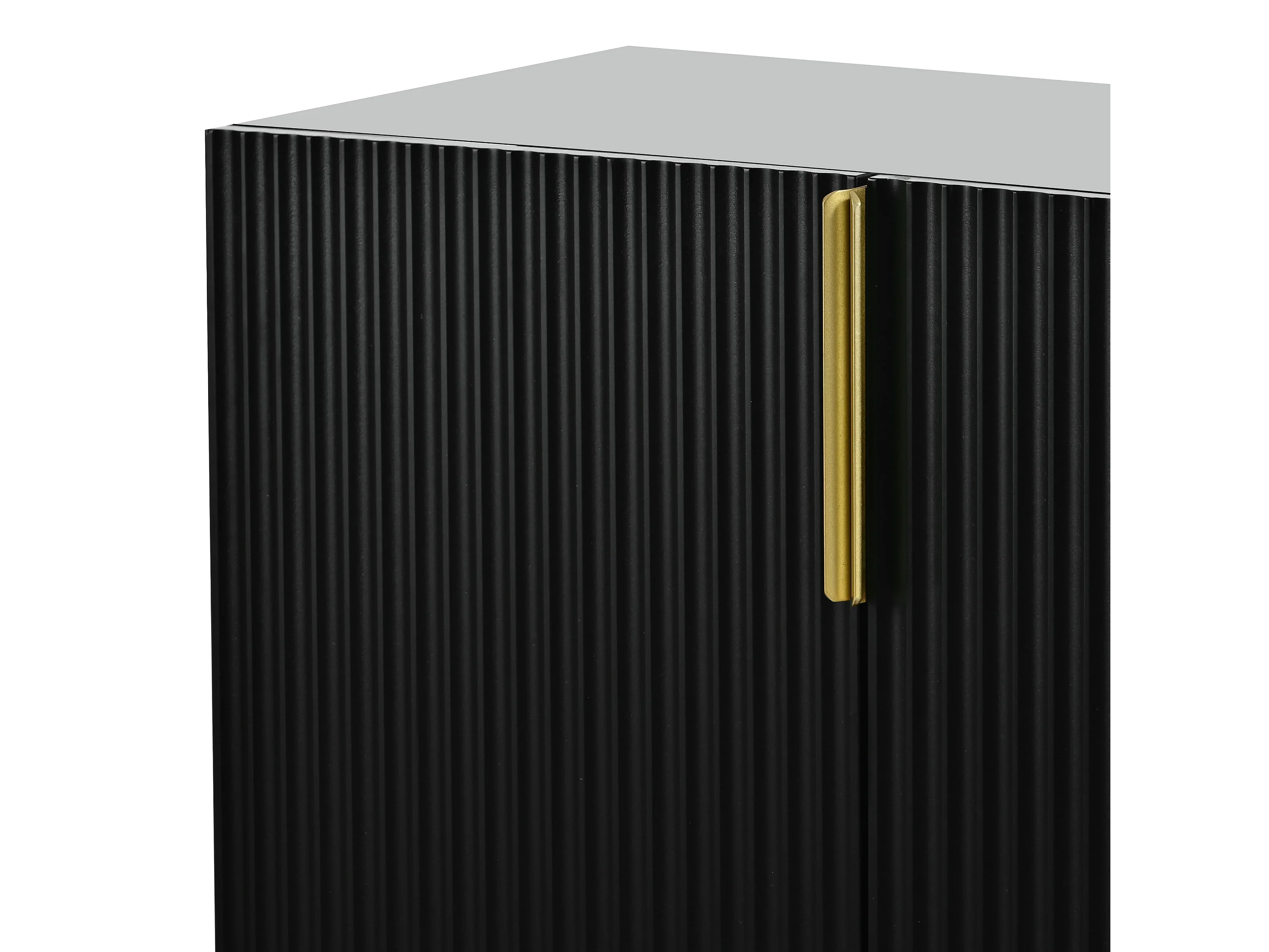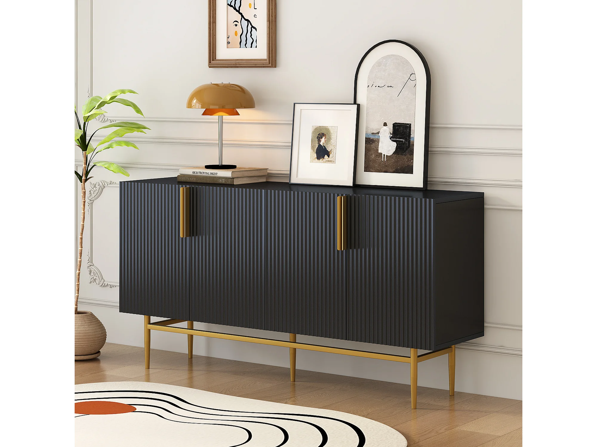 Buffet avec 4 portes texturées - Pieds et poignées en métal - Noir et doré