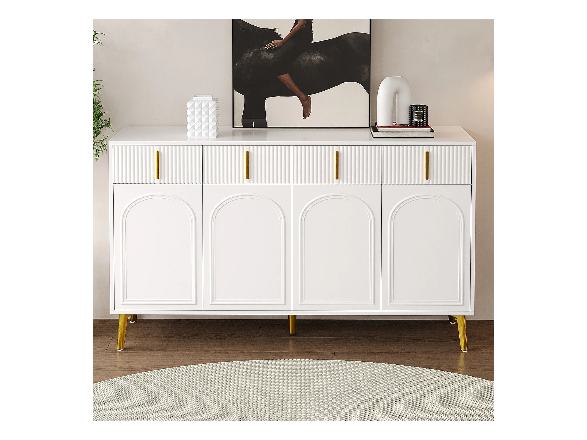 Buffet avec 4 tiroirs et 4 portes, armoire de buffet, avec poignées et pieds dorés, Blanc