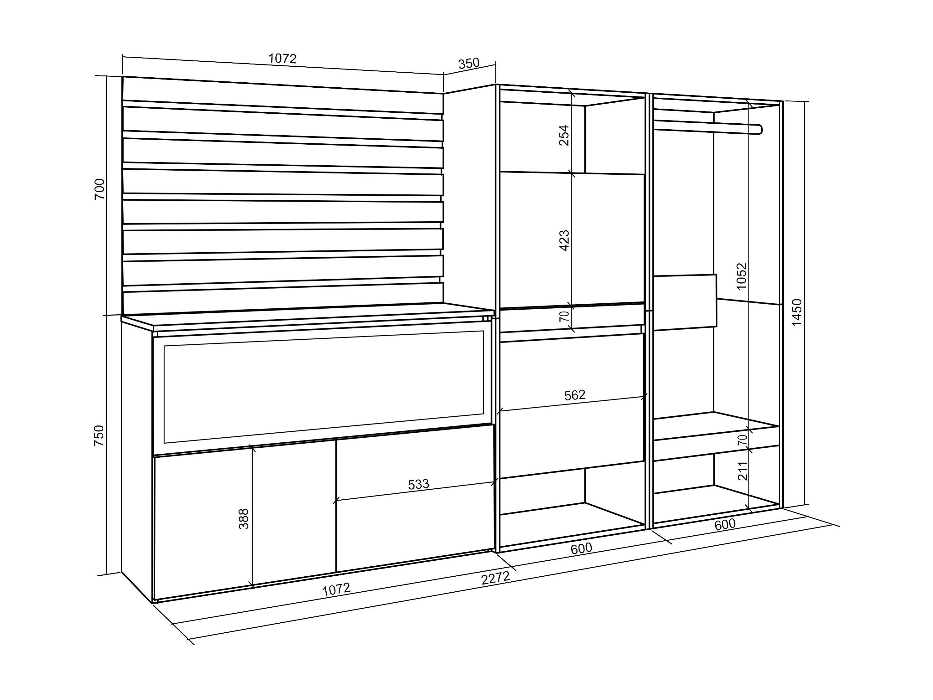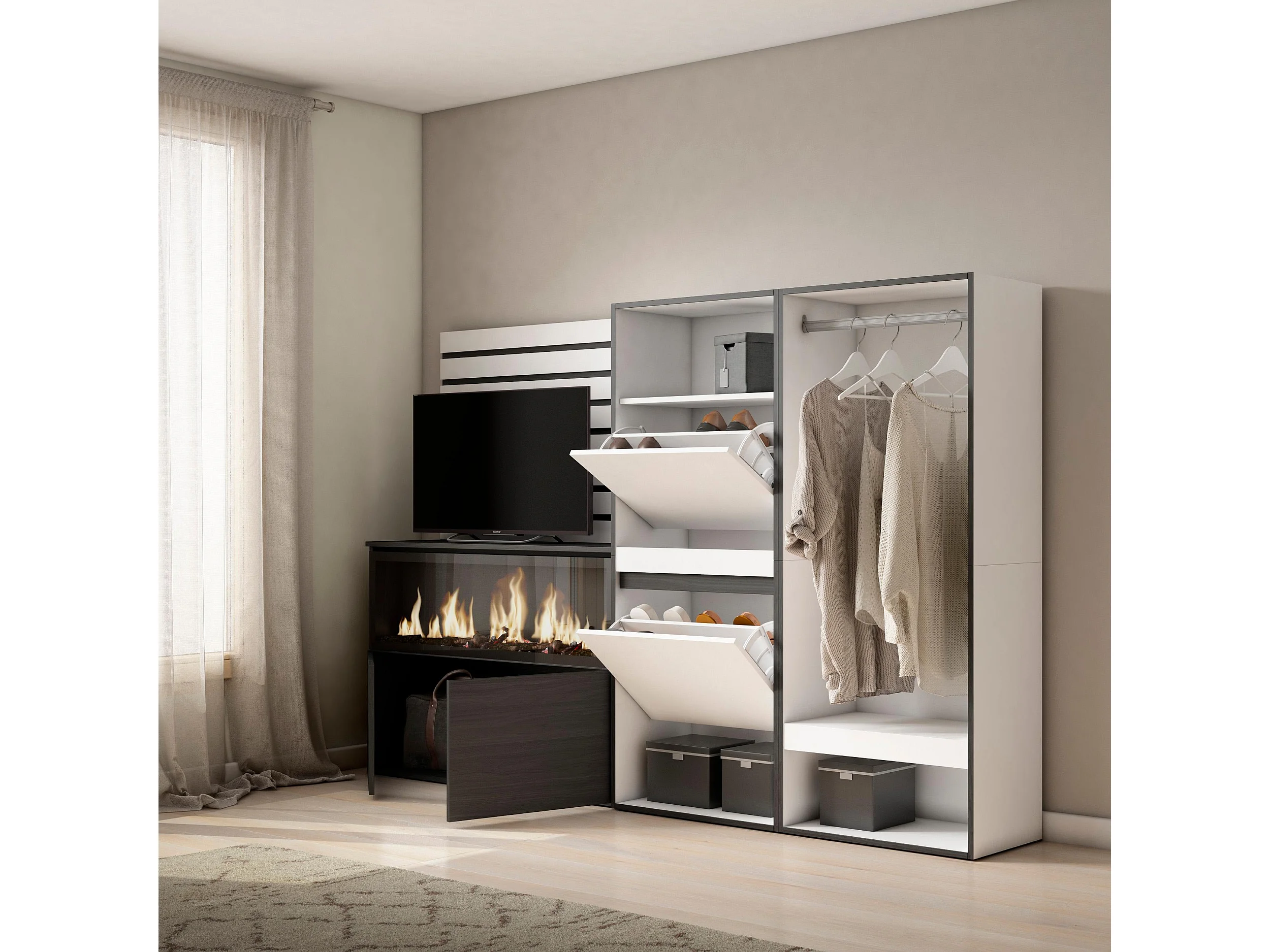 Buffet, Bahut, 227x35x145 cm, Chambre à coucher, pièce, Cheminée électrique XXL, Meuble à Chaussures, Vestiaire ouvert, Blanc