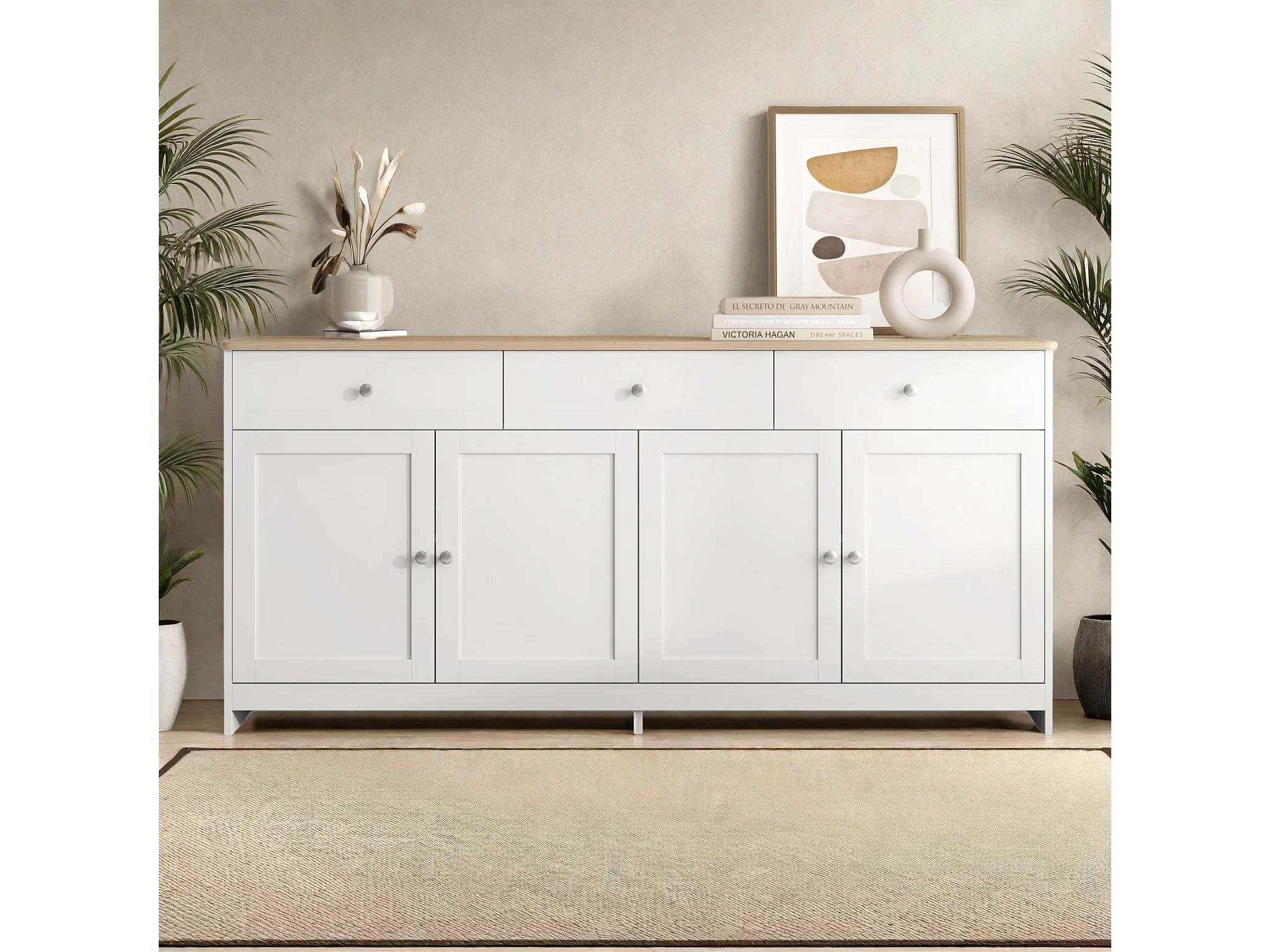 Buffet, Bahut avec 4 Portes et 3 Tiroirs, Meuble de Rangement, Commode, Buffet Bahut de Salon, 160x37x75 cm, Blanc+Bois