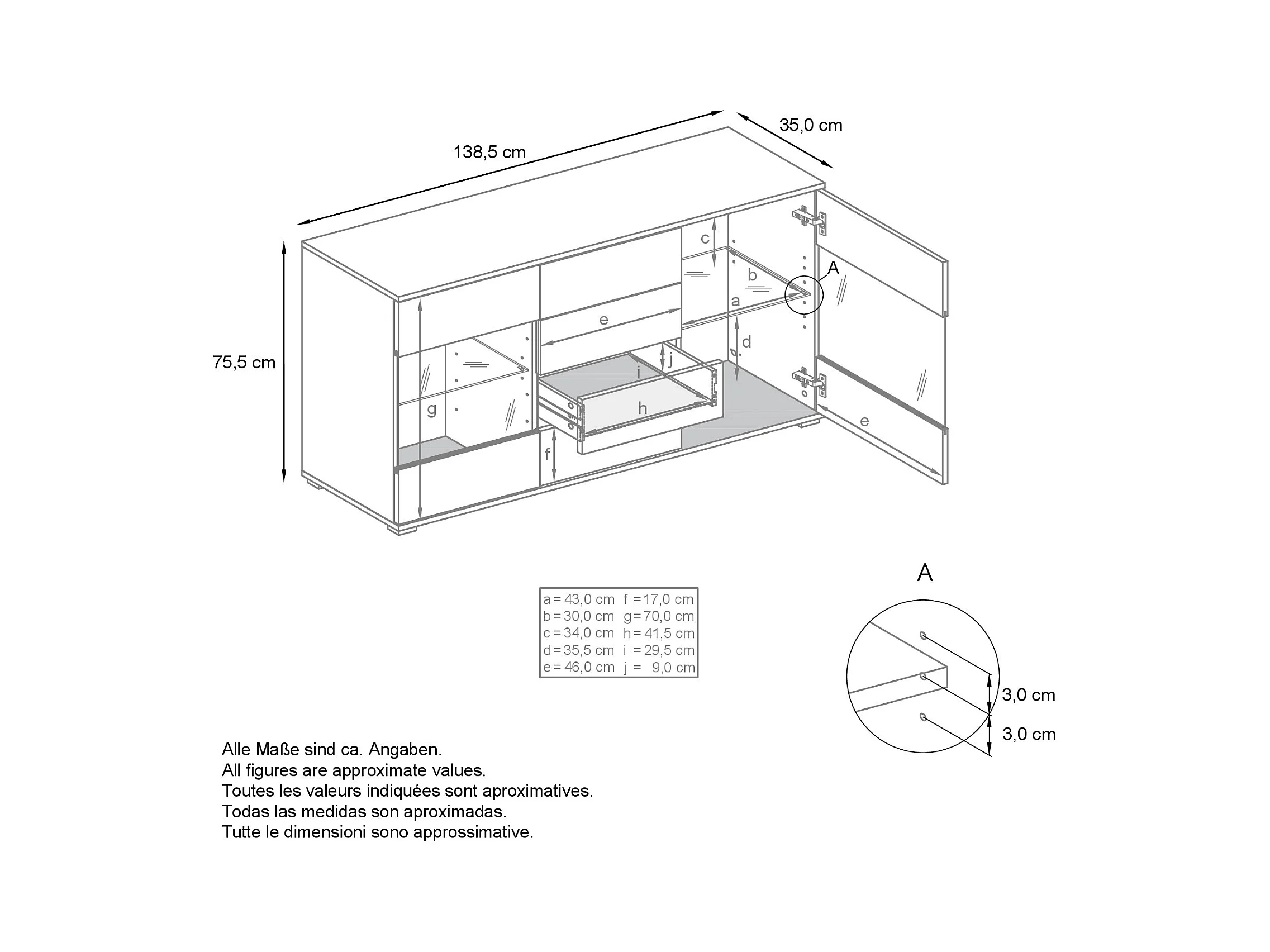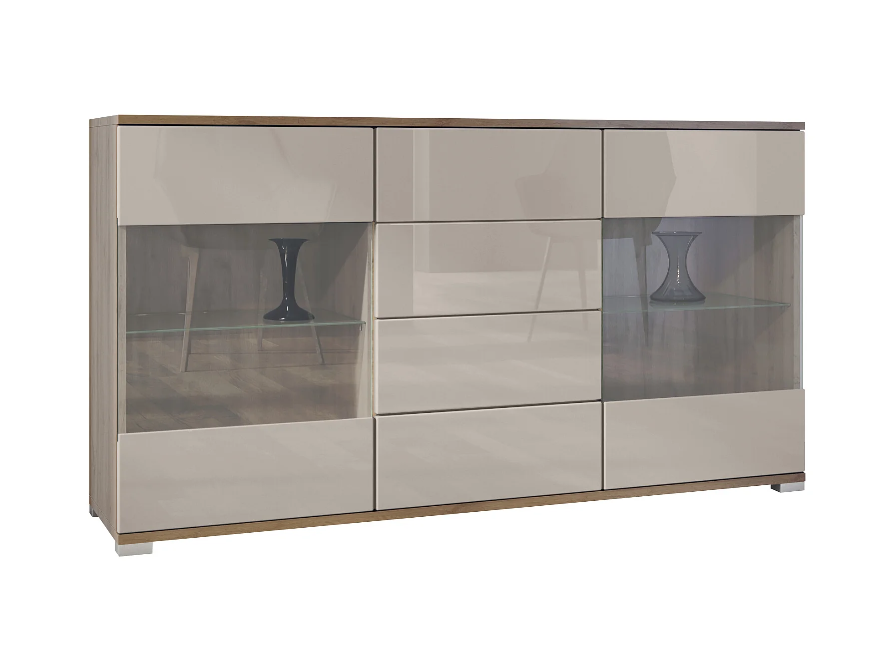 Buffet Bari V1 – Meuble avec 2 Grandes Portes et 4 Tiroirs, Chêne Evoke/gris sable haute brillance (138,5 x 75,5 x 35)