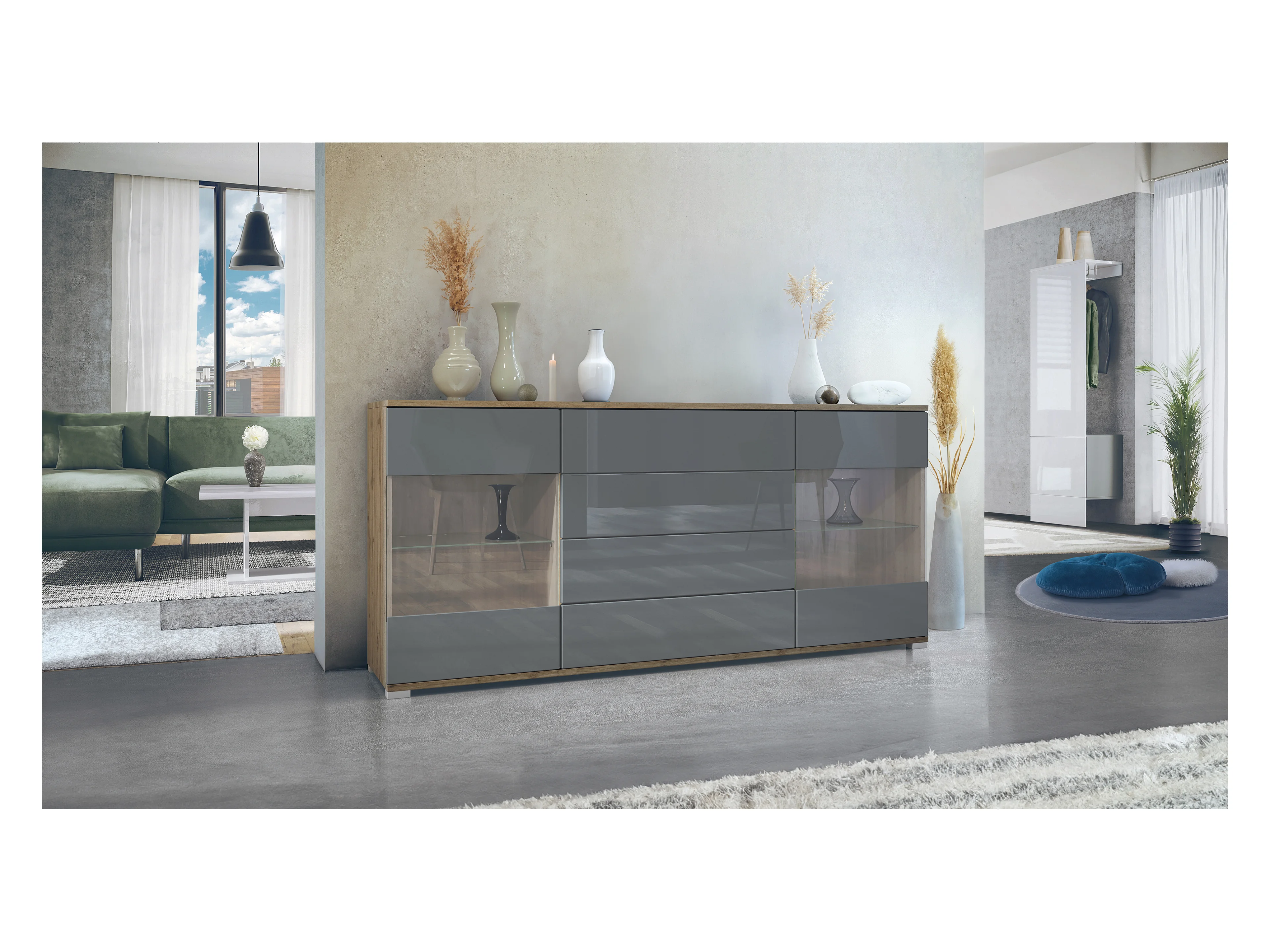 Buffet Bari V2 – Meuble avec 2 Grandes Portes et 4 Tiroirs, Chêne Evoke/gris haute brillance (166,5 x 75,5 x 35)