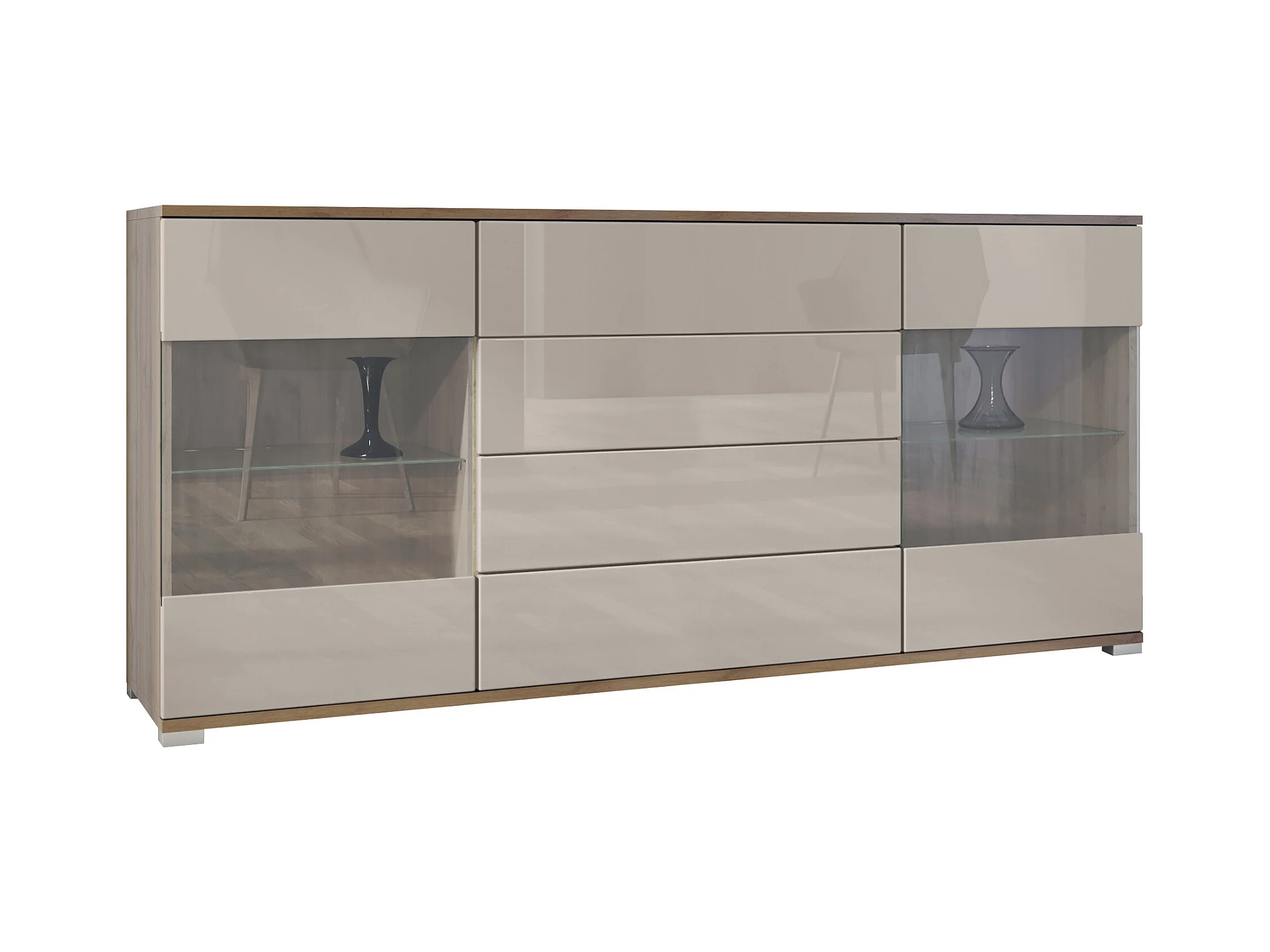Buffet Bari V2 – Meuble avec 2 Grandes Portes et 4 Tiroirs, Chêne Evoke/gris sable haute brillance (166,5 x 75,5 x 35)