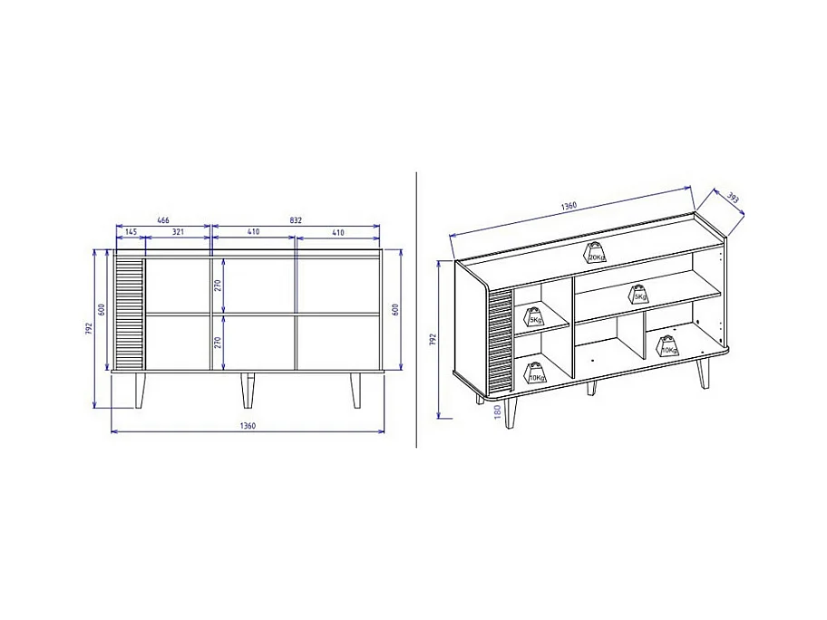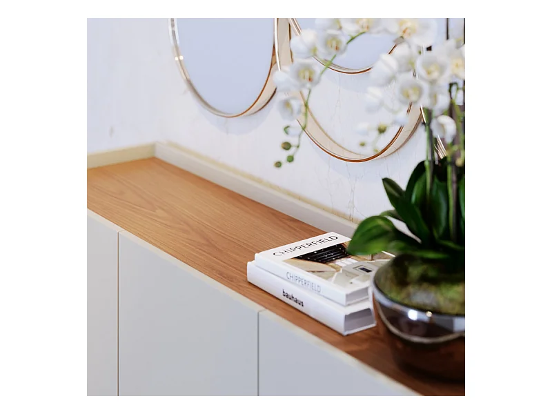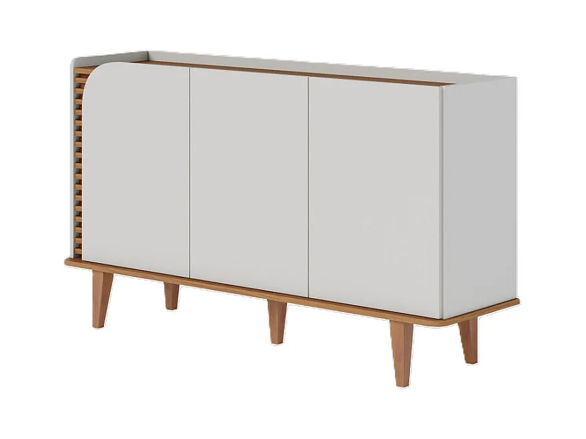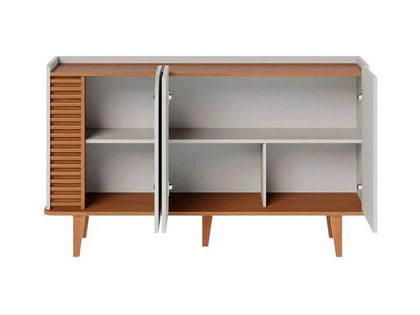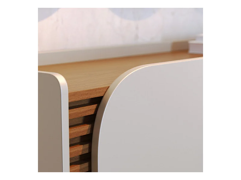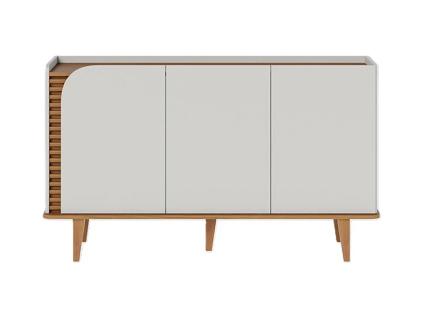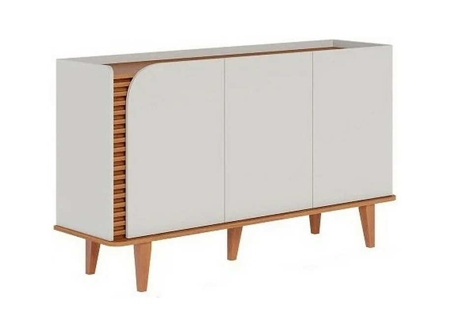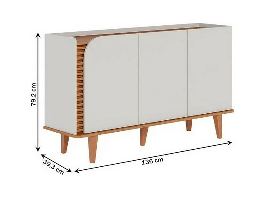 Buffet Bas 3 Portes 5 Niches Blanc et Chêne 5 Pieds Bois L 136 H 79.2 P 39.3 cm