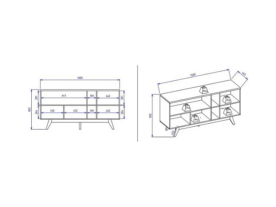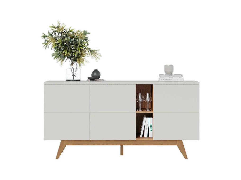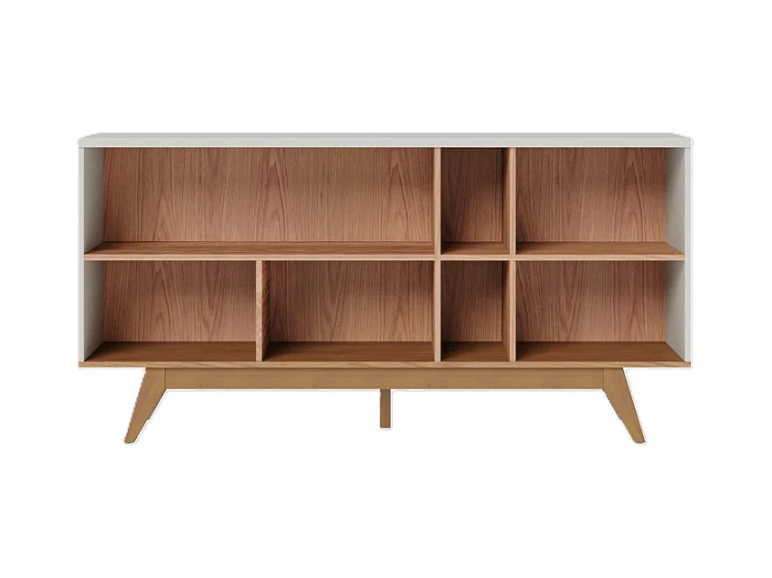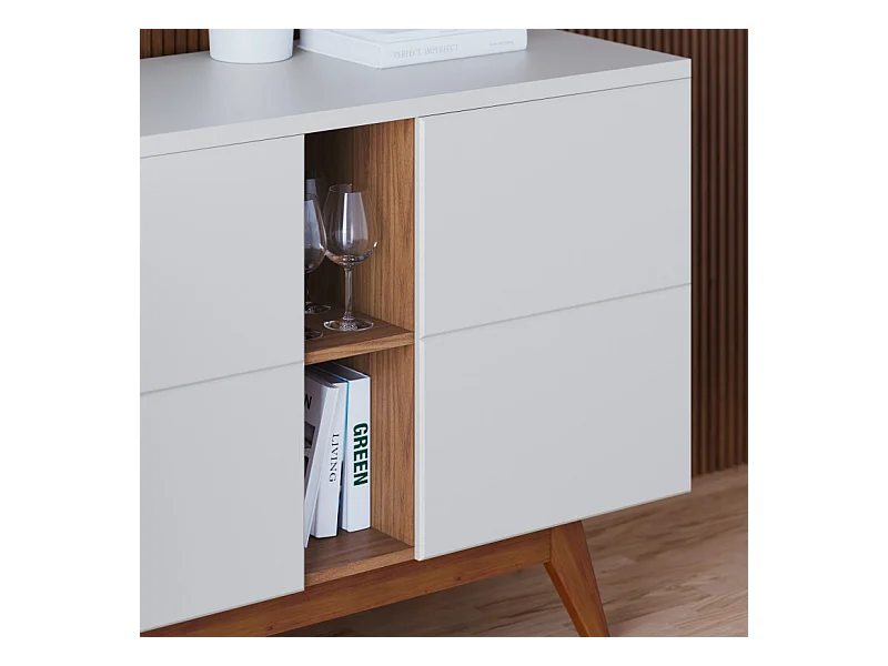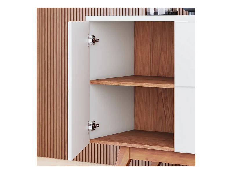 Buffet Bas 3 Portes 7 Niches Blanc et Chêne 5 Pieds Bois L 160 H 80.2 P 44.5 cm