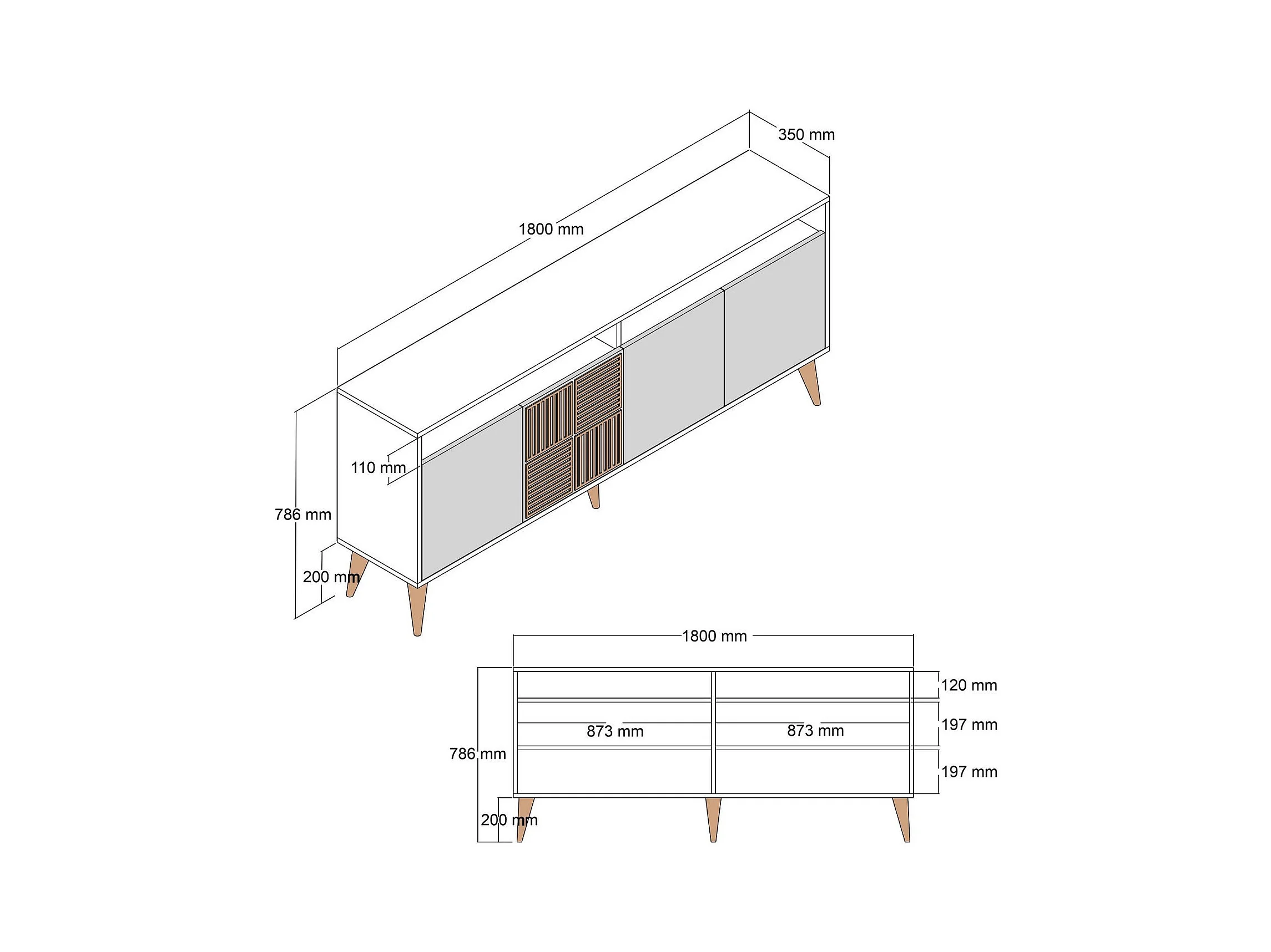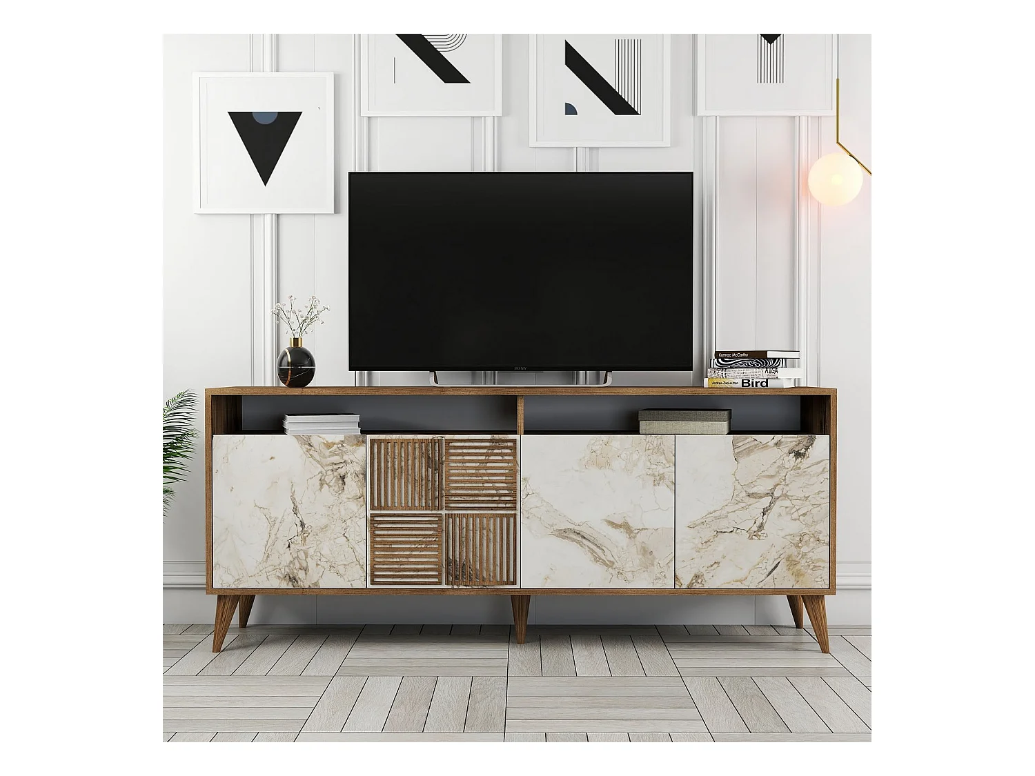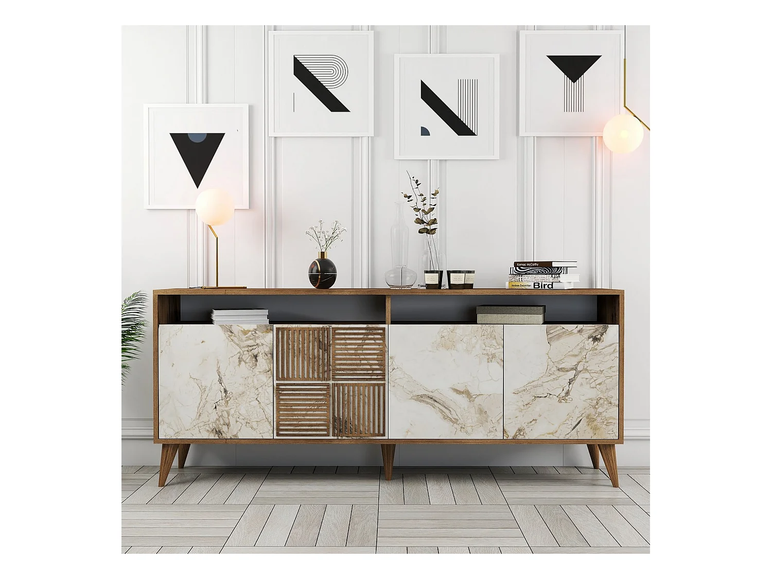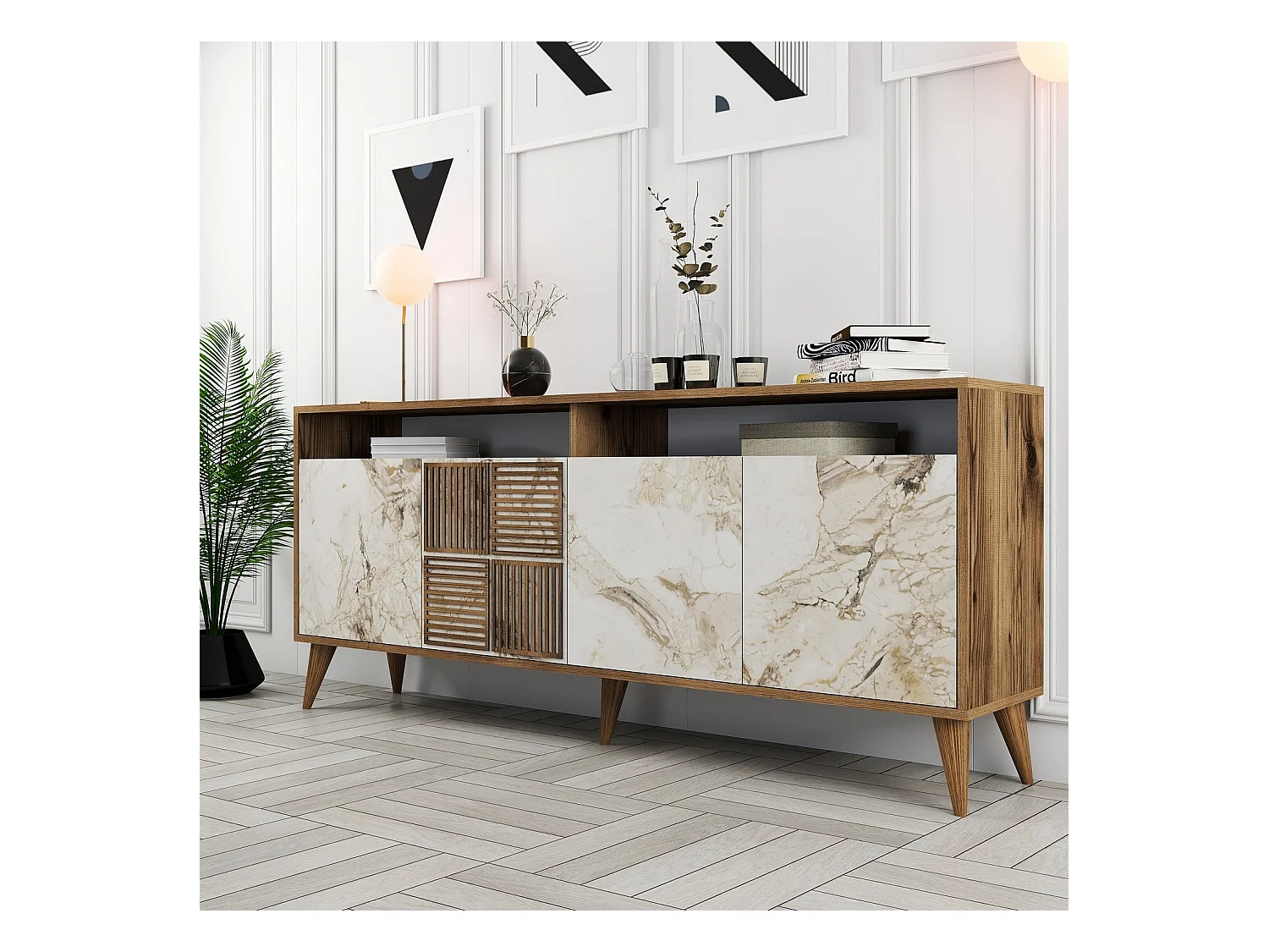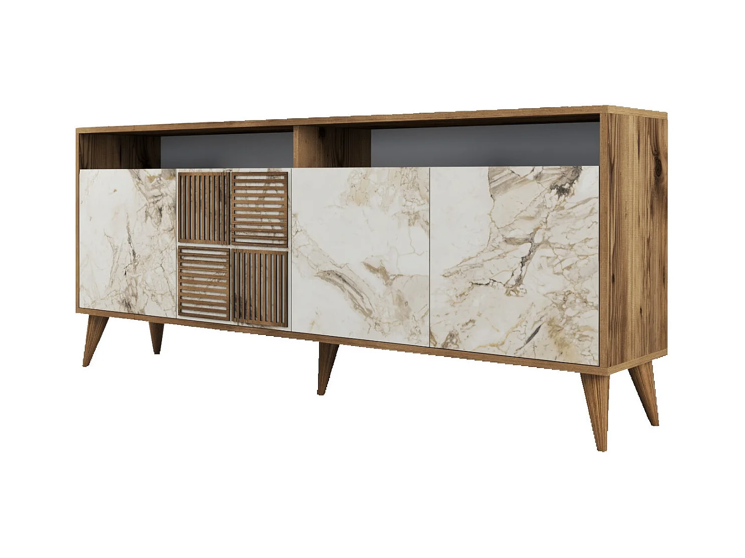 Buffet bas 4 portes et 2 niches de rangement Kaltes L180cm Bois foncé et Effet marbre blanc