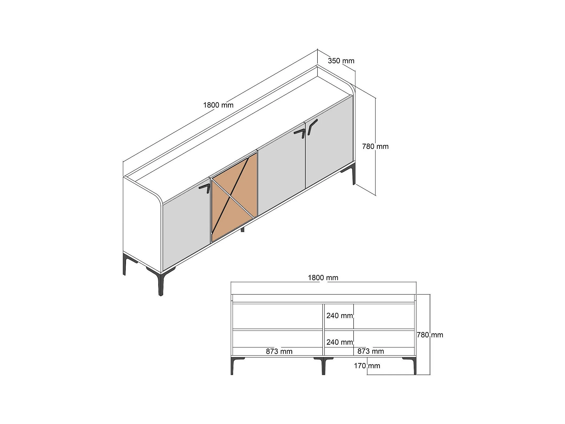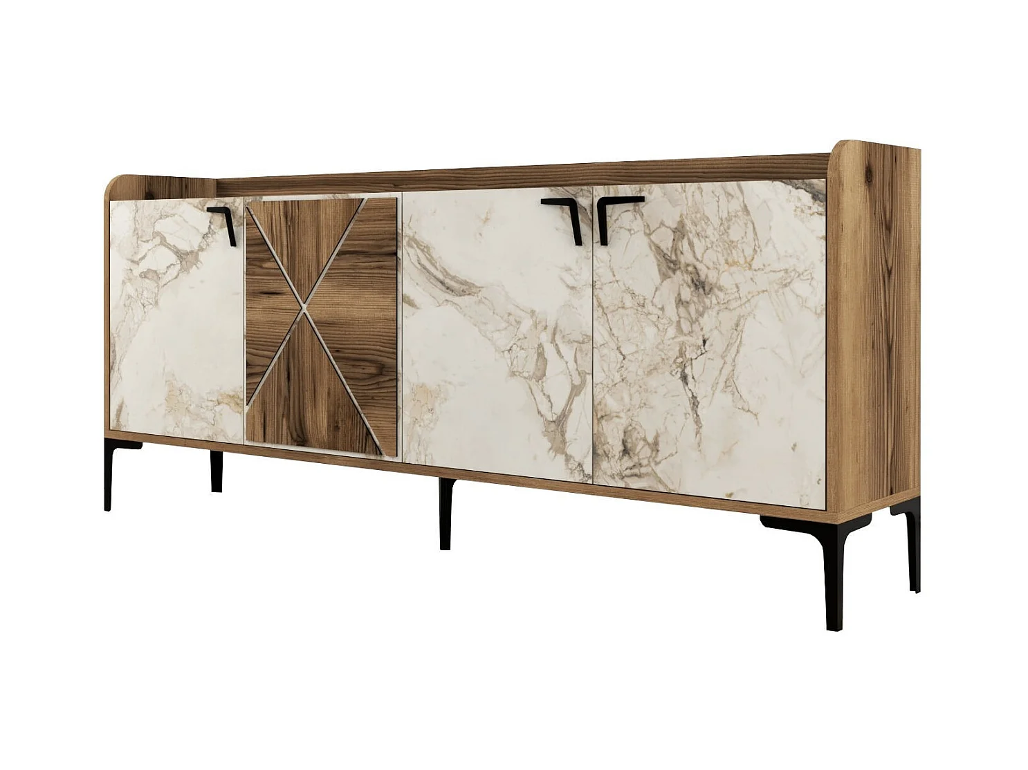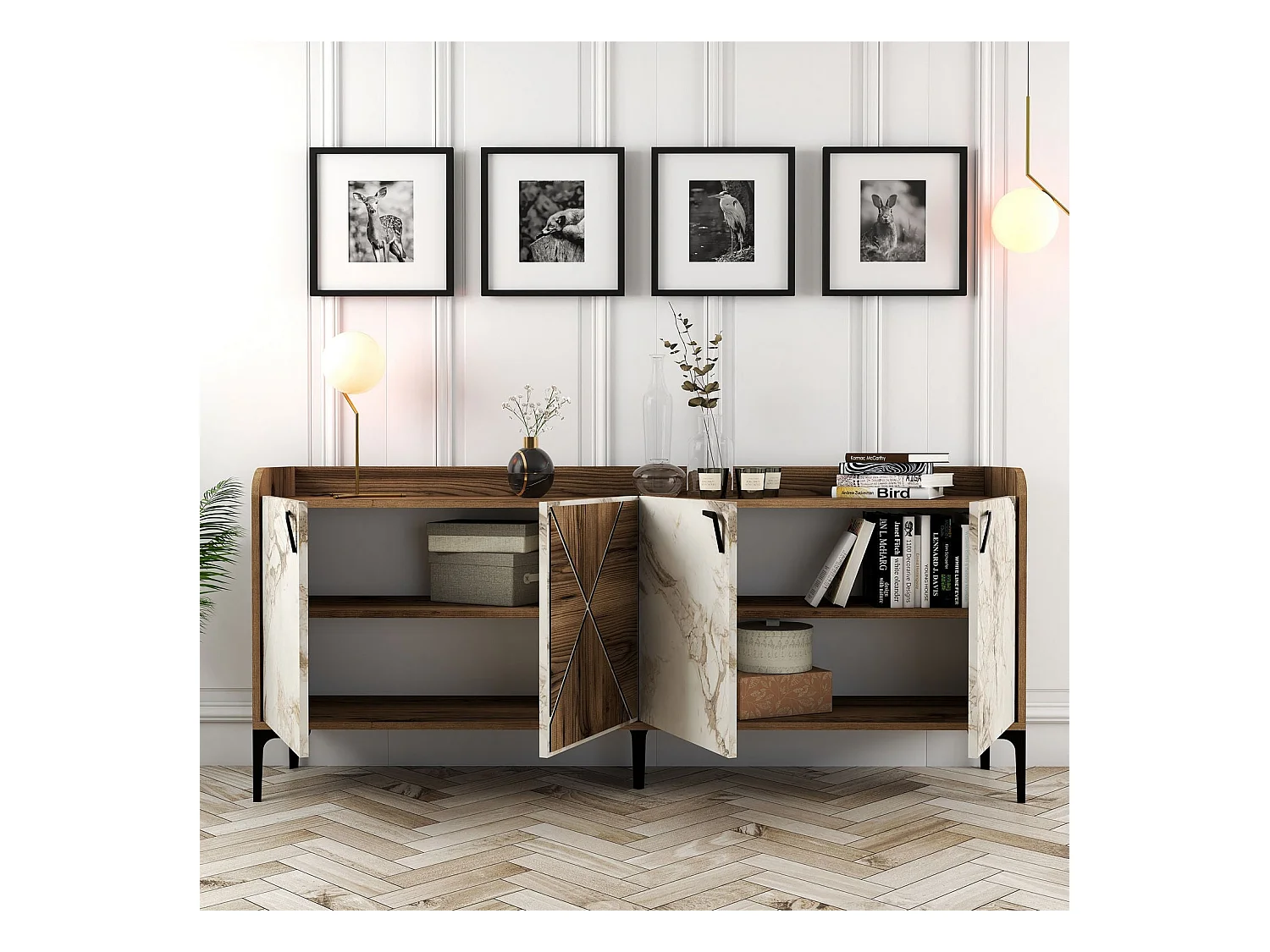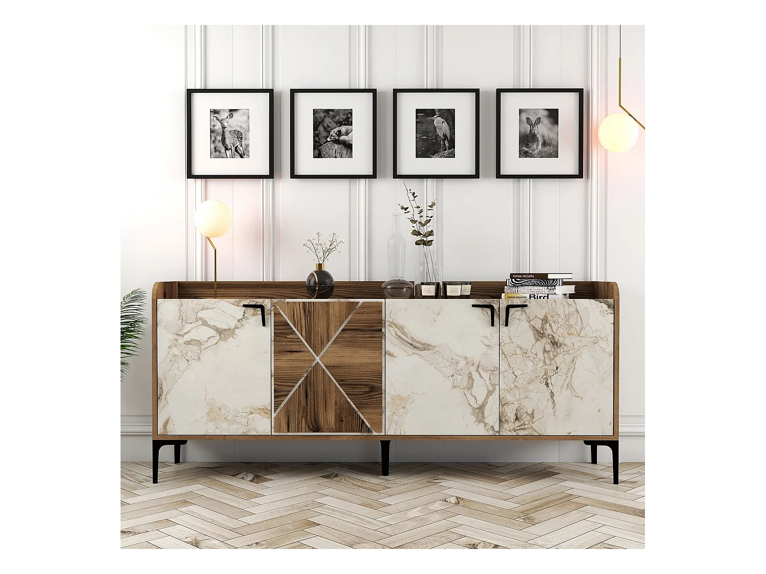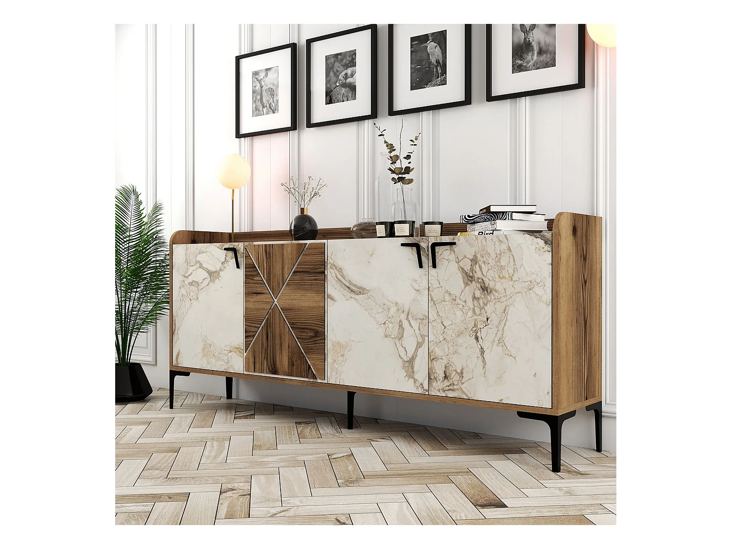 Buffet bas 4 portes Zenger 180cm Bois Naturel et Blanc effet marbre et Métal Noir