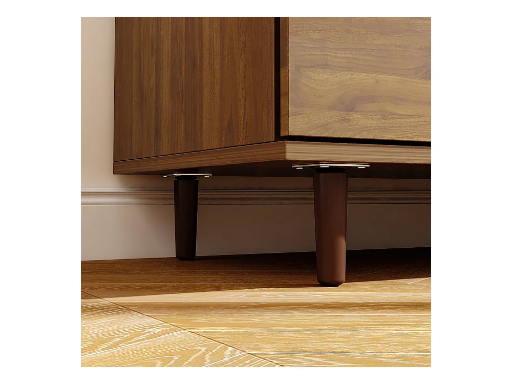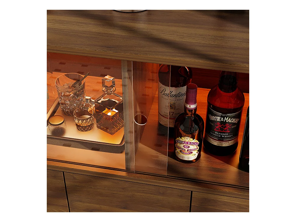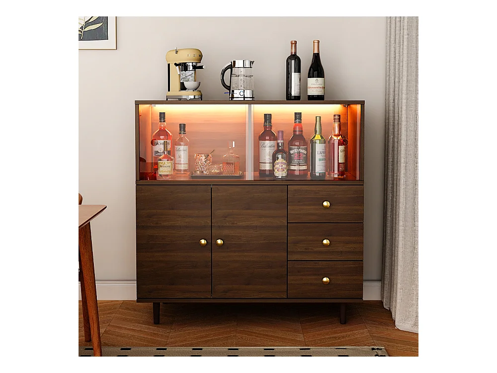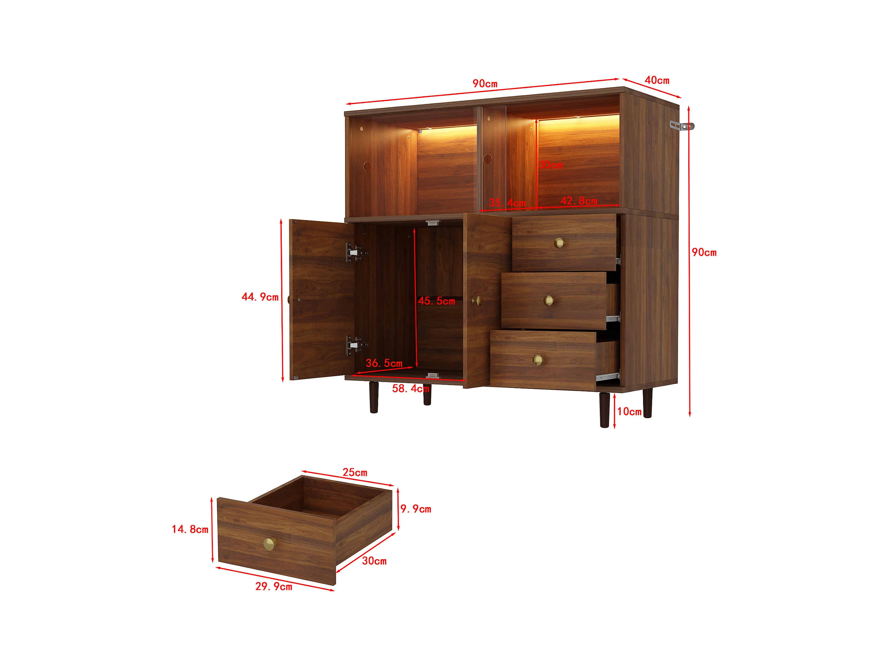 Buffet Bas avec 2 des 4 Portes en Acrylique Transparents et 3 Tiroirs , à Éclairage LED Tricolore, Salon, 90 x 40 x 90 CM, Marron