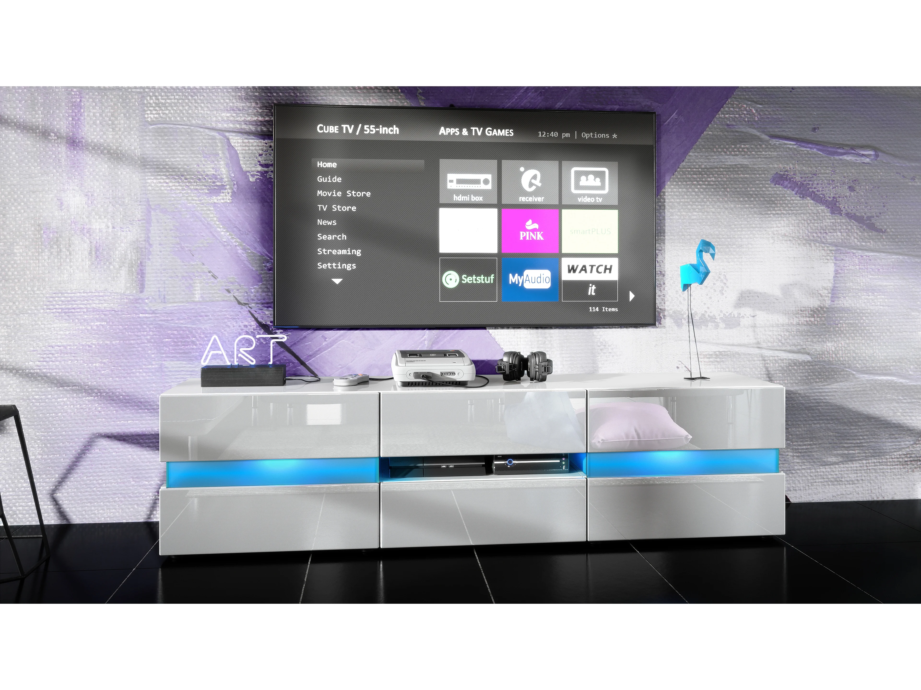 Buffet bas Flow, Meuble TV avec vitre d’ambiance rétroéclairée, 2 portes, 1 tiroir et 1 clapet, Blanc mat/Blanc brillant, LED incluse (177 x 45 x 39 cm)