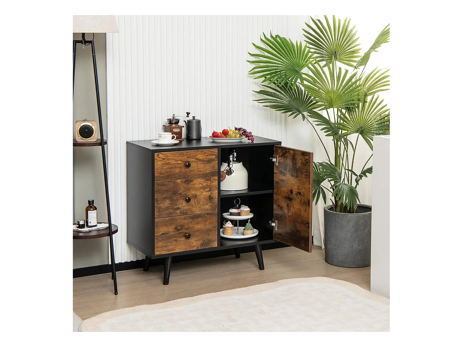 JENNA - Buffet 4 Portes 3 Tiroirs Aspect Bois et Métal Noir