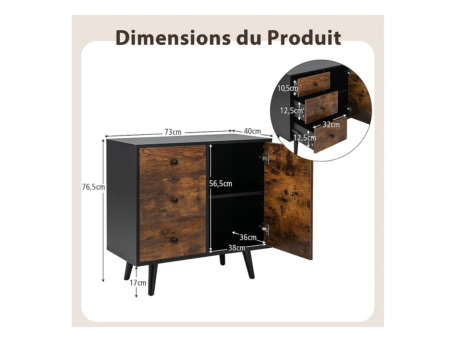 Buffet bas industriel, 3 tiroirs, placard à porte, étagère réglable, 73 x 40 x 76,5 cm