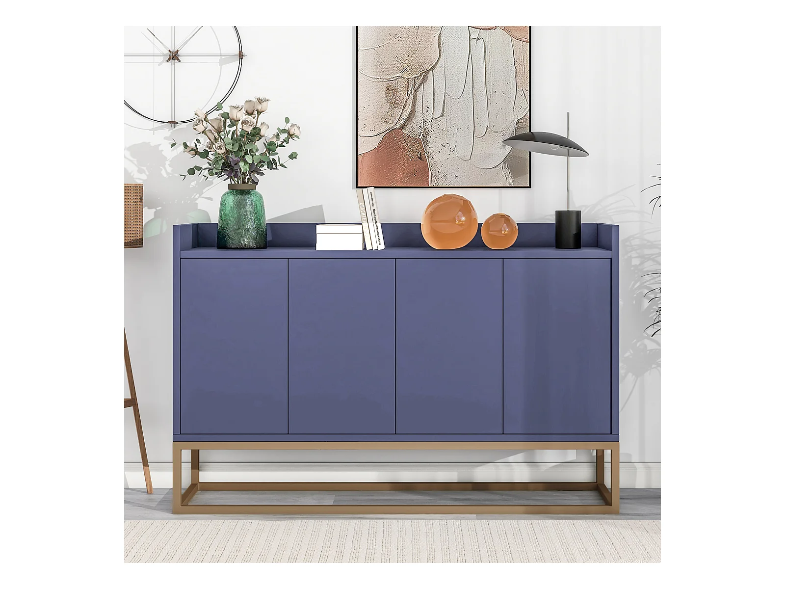 Buffet moderne minimaliste, 4 portes sans poignées, pour salon, cuisine, MDF, bleu marine (120x30x80 cm)