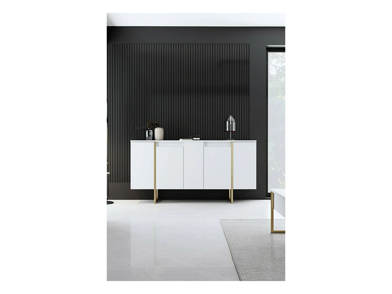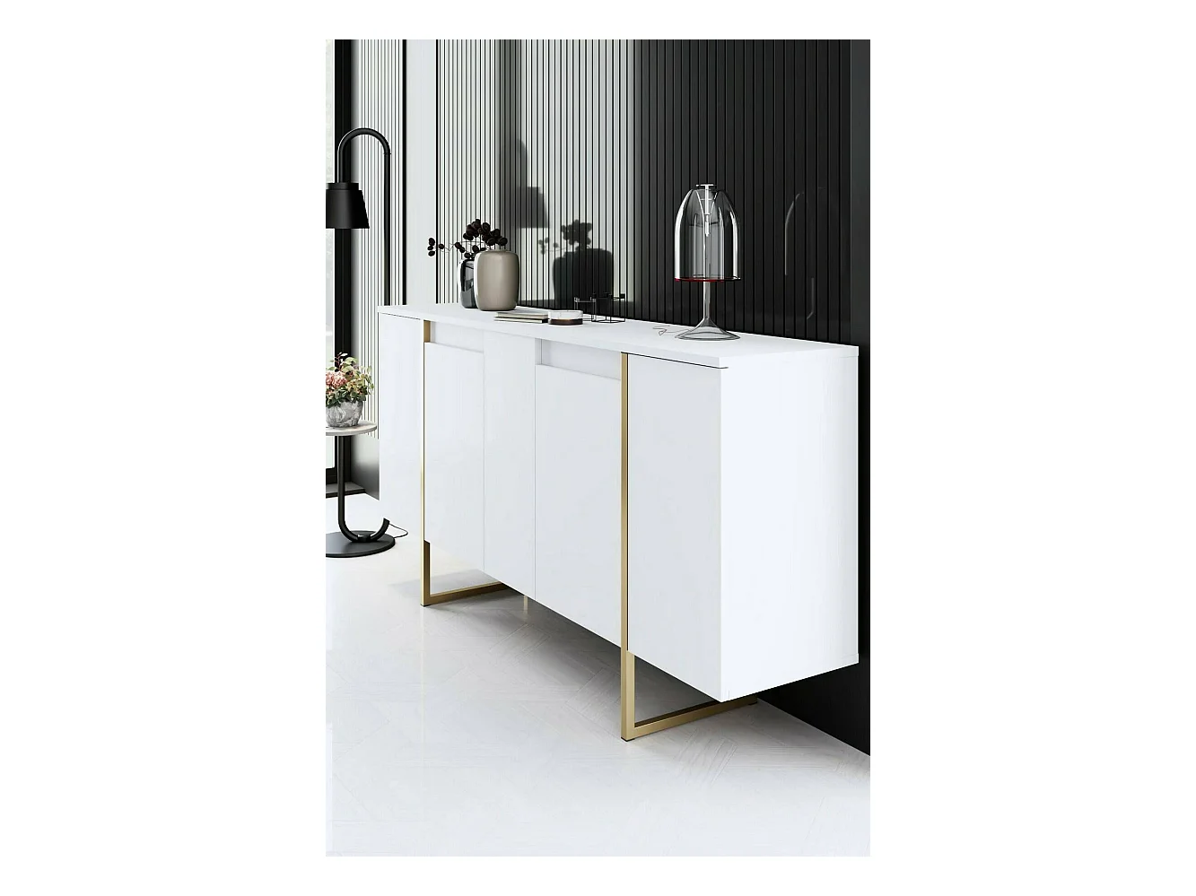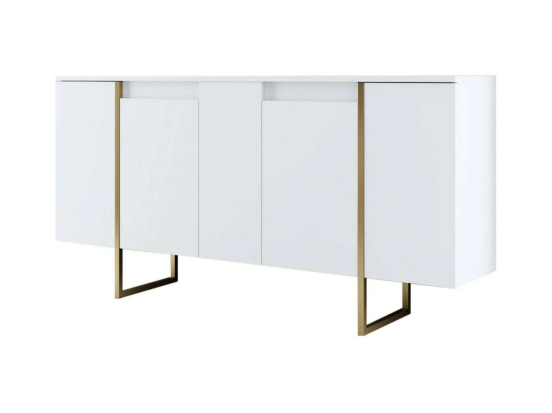 Buffet Betel, Buffet du salon, Commode de salon, Garde-manger de cuisine, 160x35h80 cm, Blanc et Or