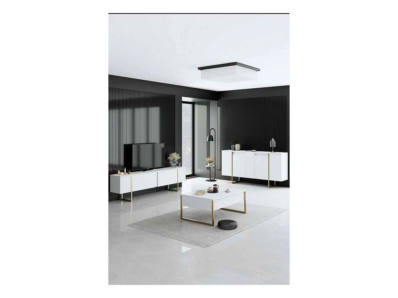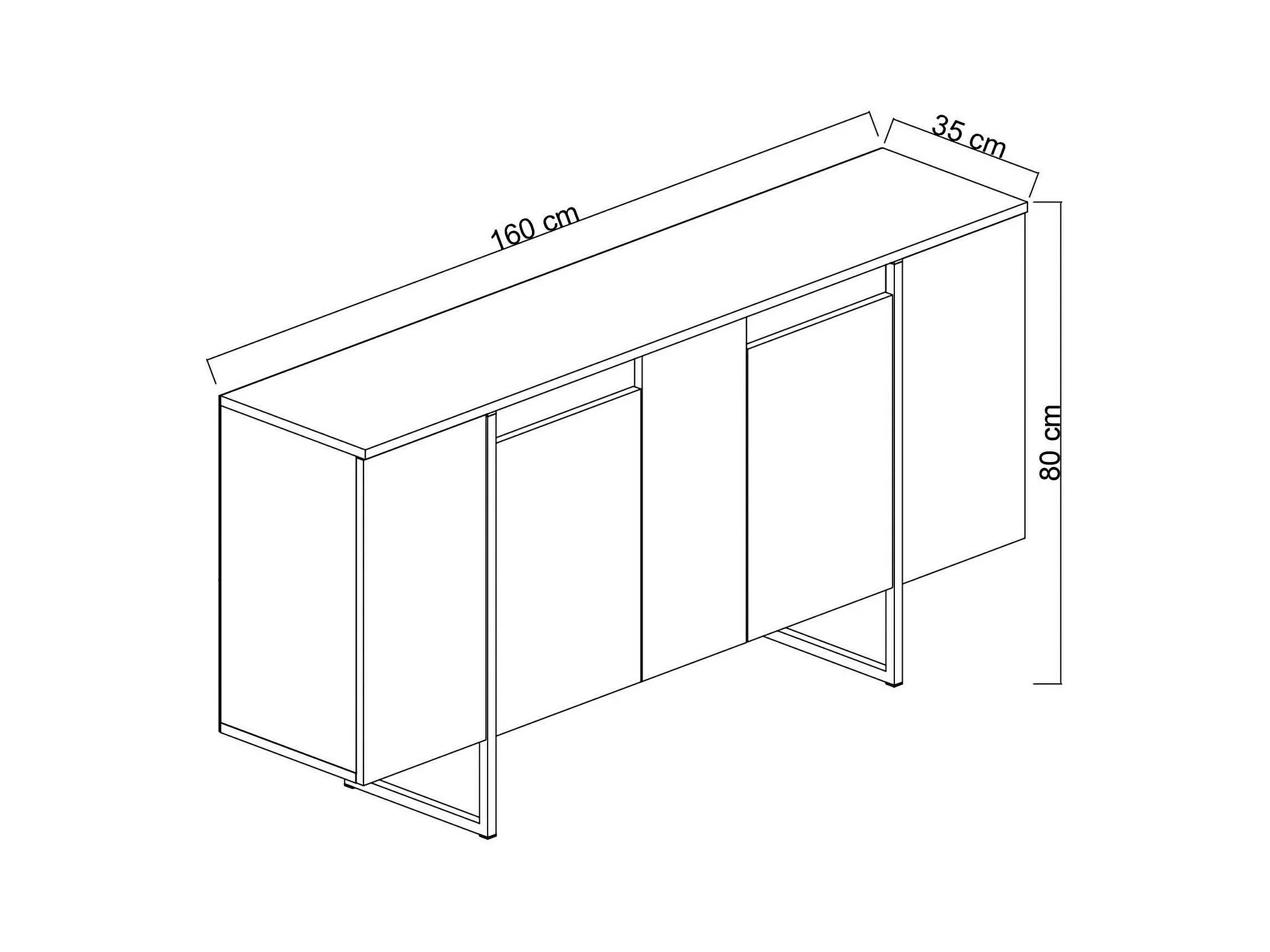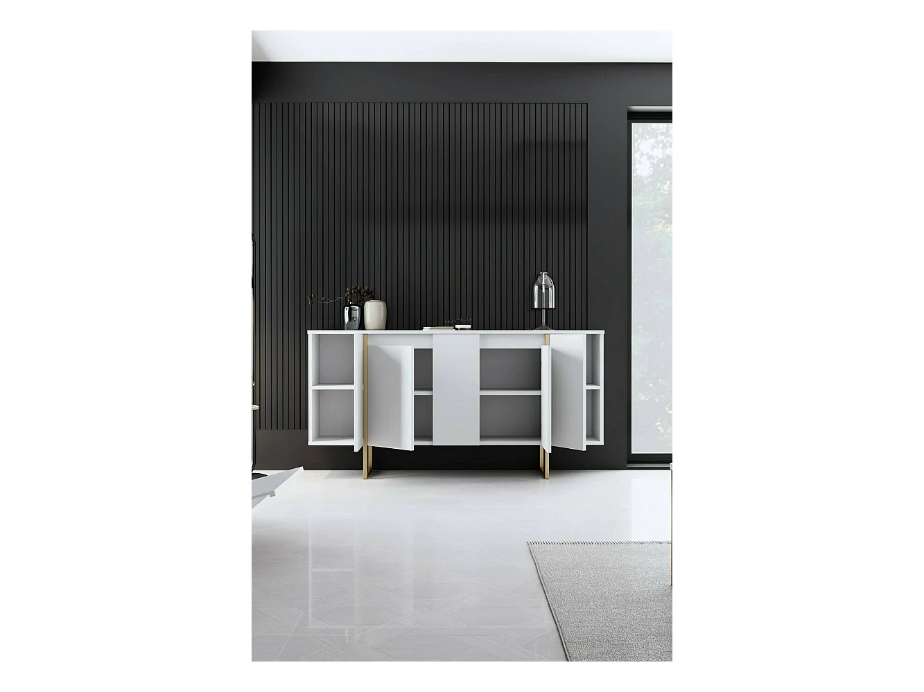 Buffet Betel, Buffet du salon, Commode de salon, Garde-manger de cuisine, 160x35h80 cm, Blanc et Or