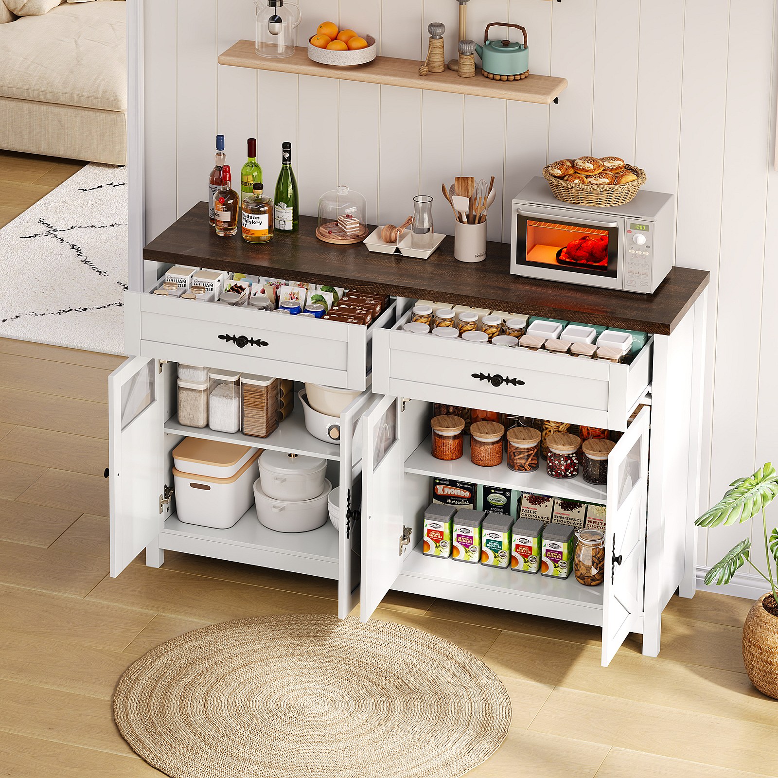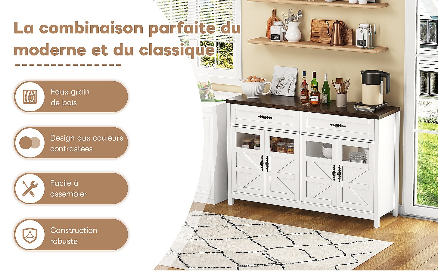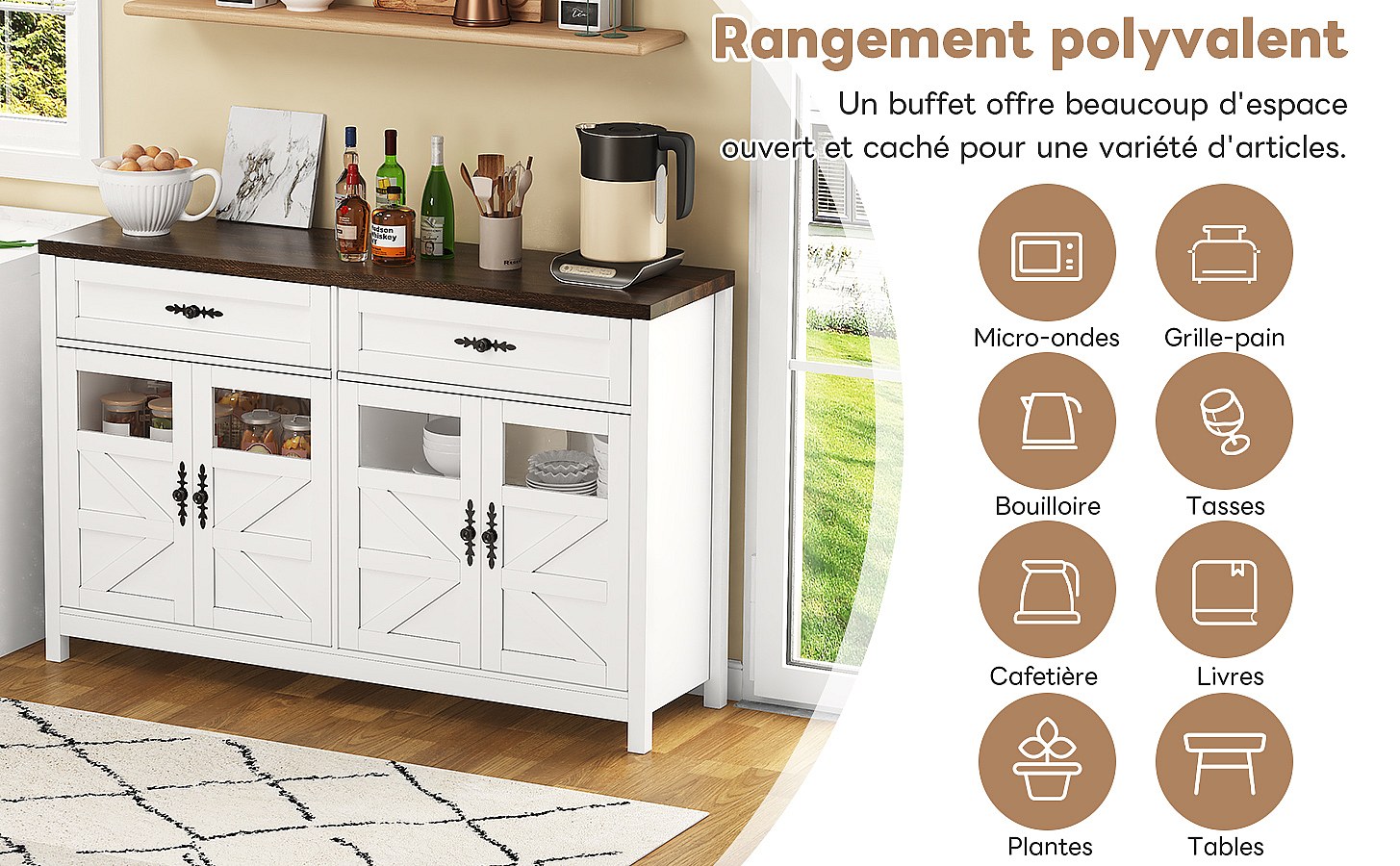 Buffet blanc 140 cm, 4 portes et 2 tiroirs, grand espace de rangement, style contemporain, bar à café, idéal salle à manger et salon