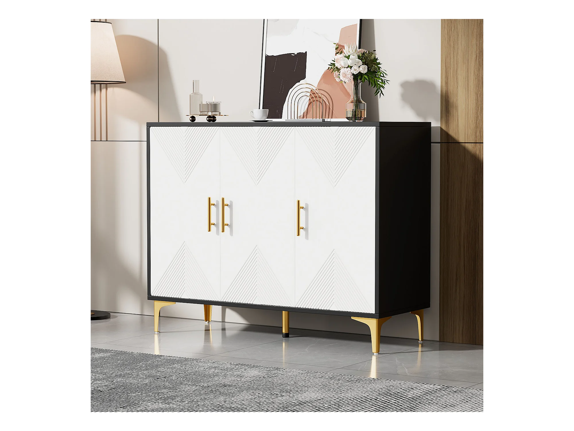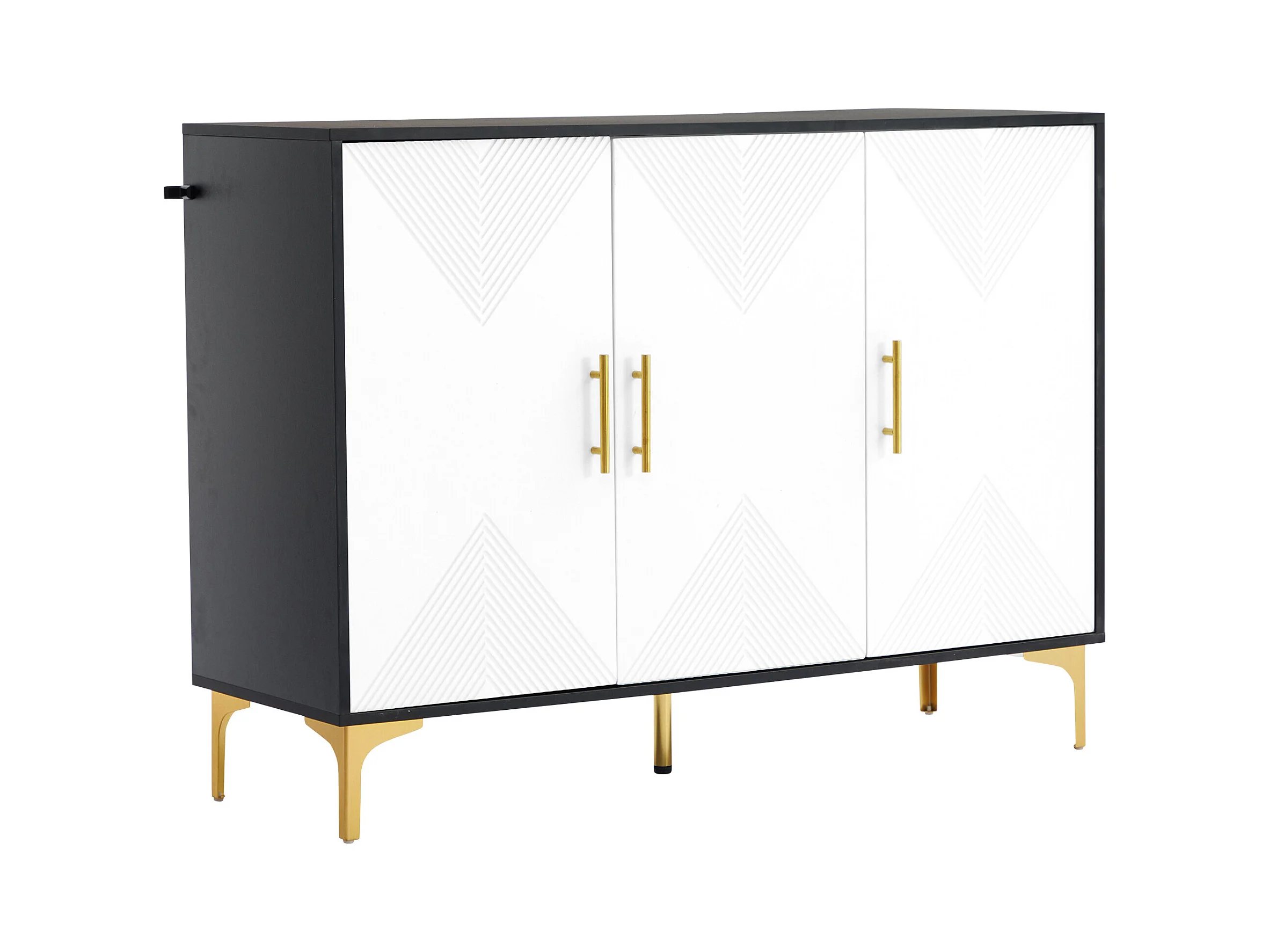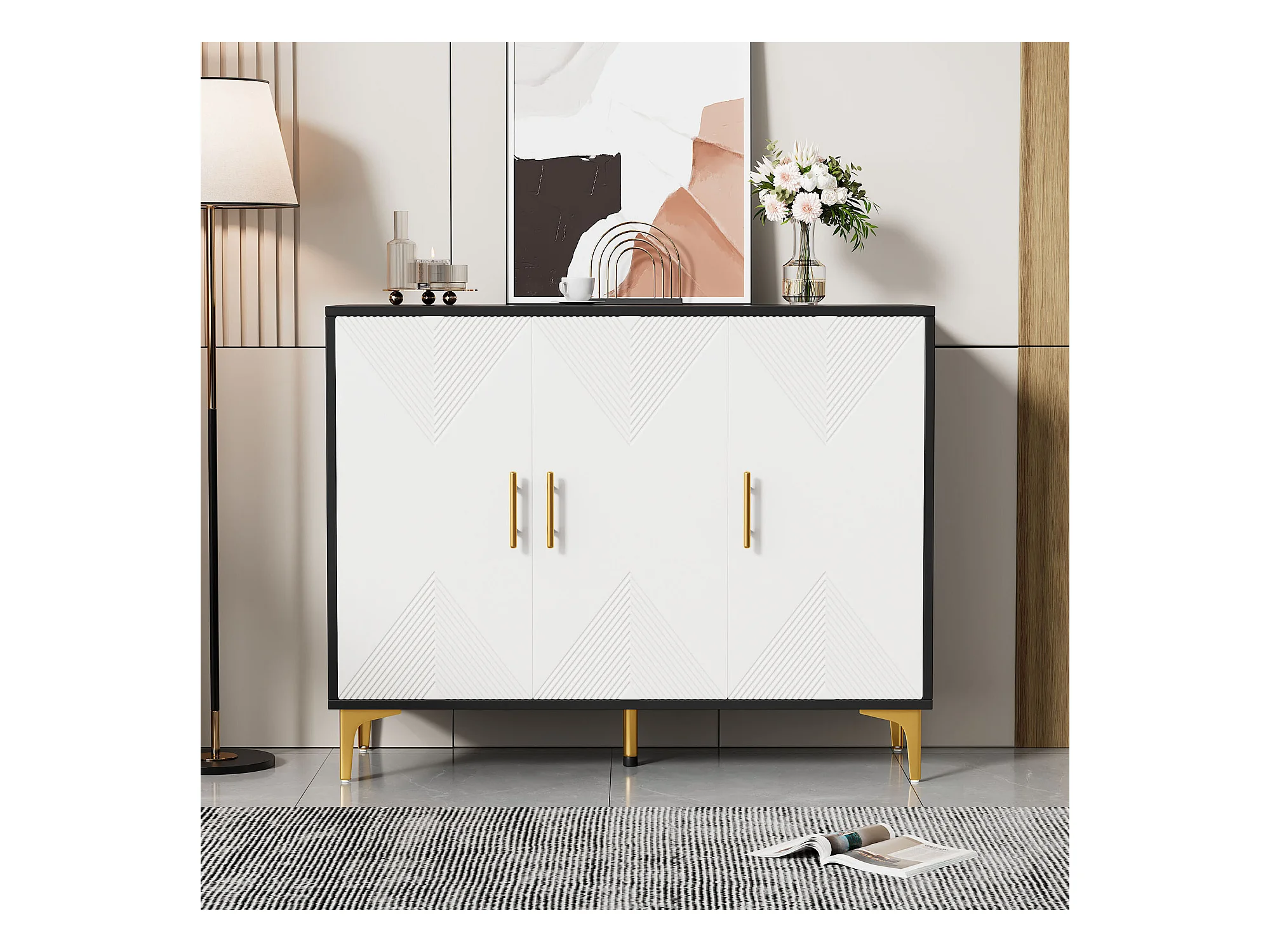 Buffet bohème blanc mat portes rayées poignées et pieds dorés