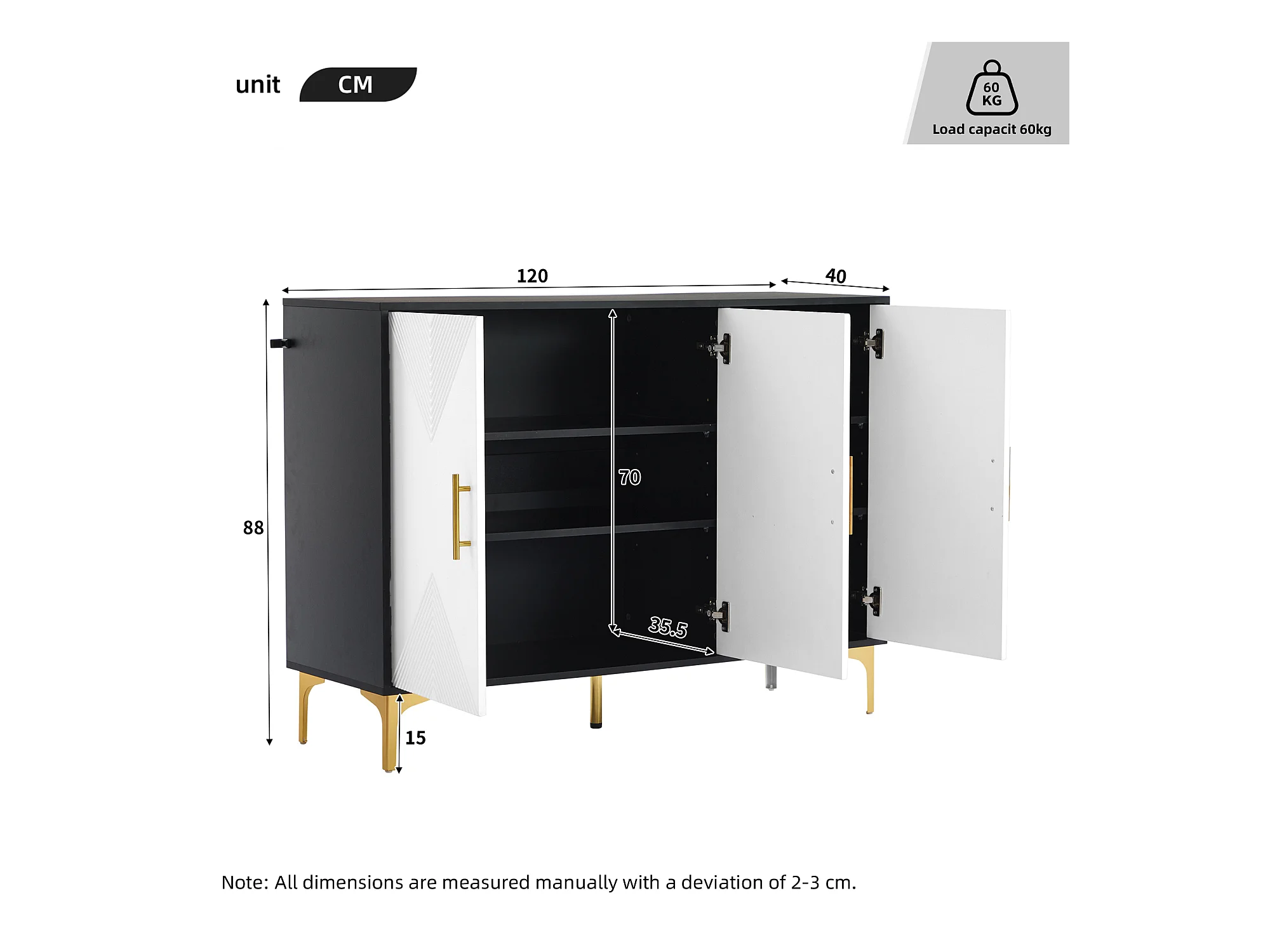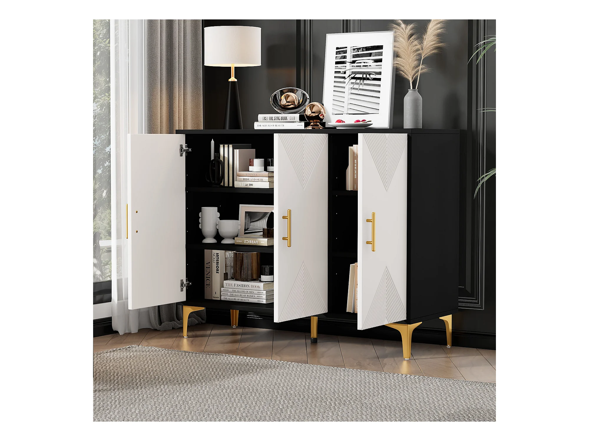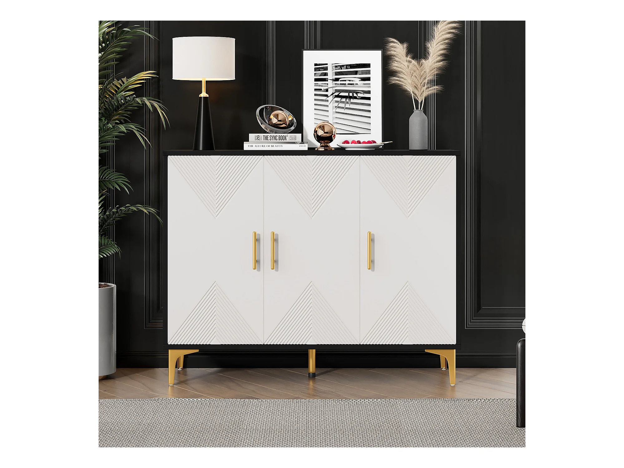 Buffet bohème blanc mat portes rayées poignées et pieds dorés