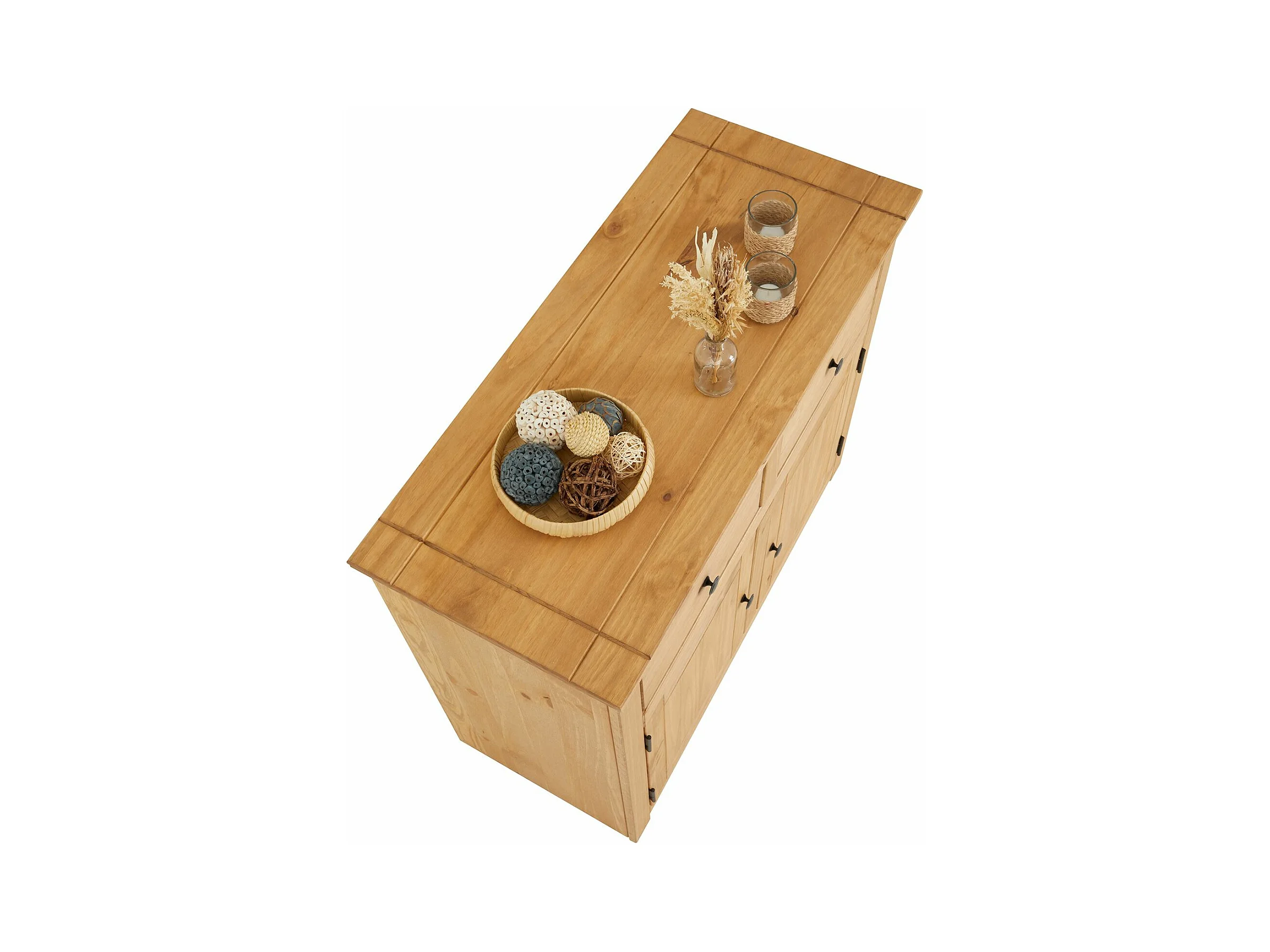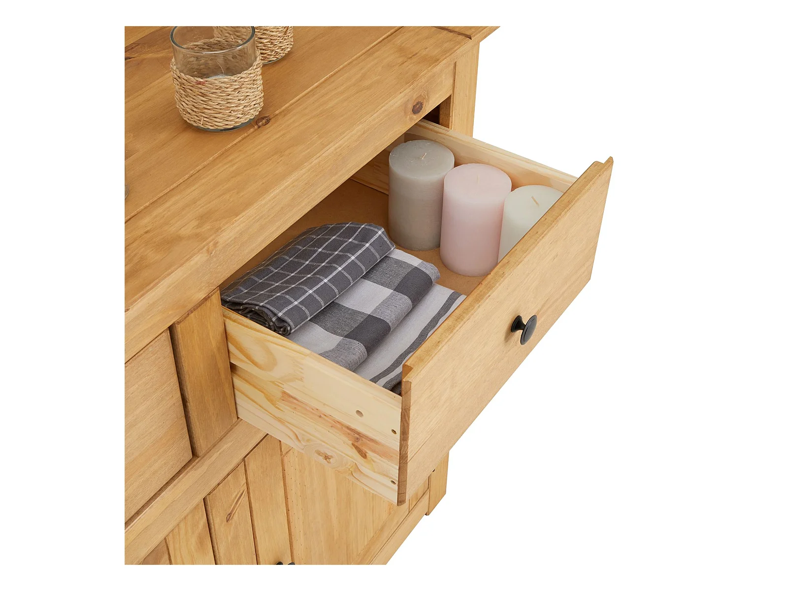 Buffet SALSA commode bahut vaisselier en bois style mexicain avec 3 portes et 3 tiroirs, en pin massif finition teintée/cirée